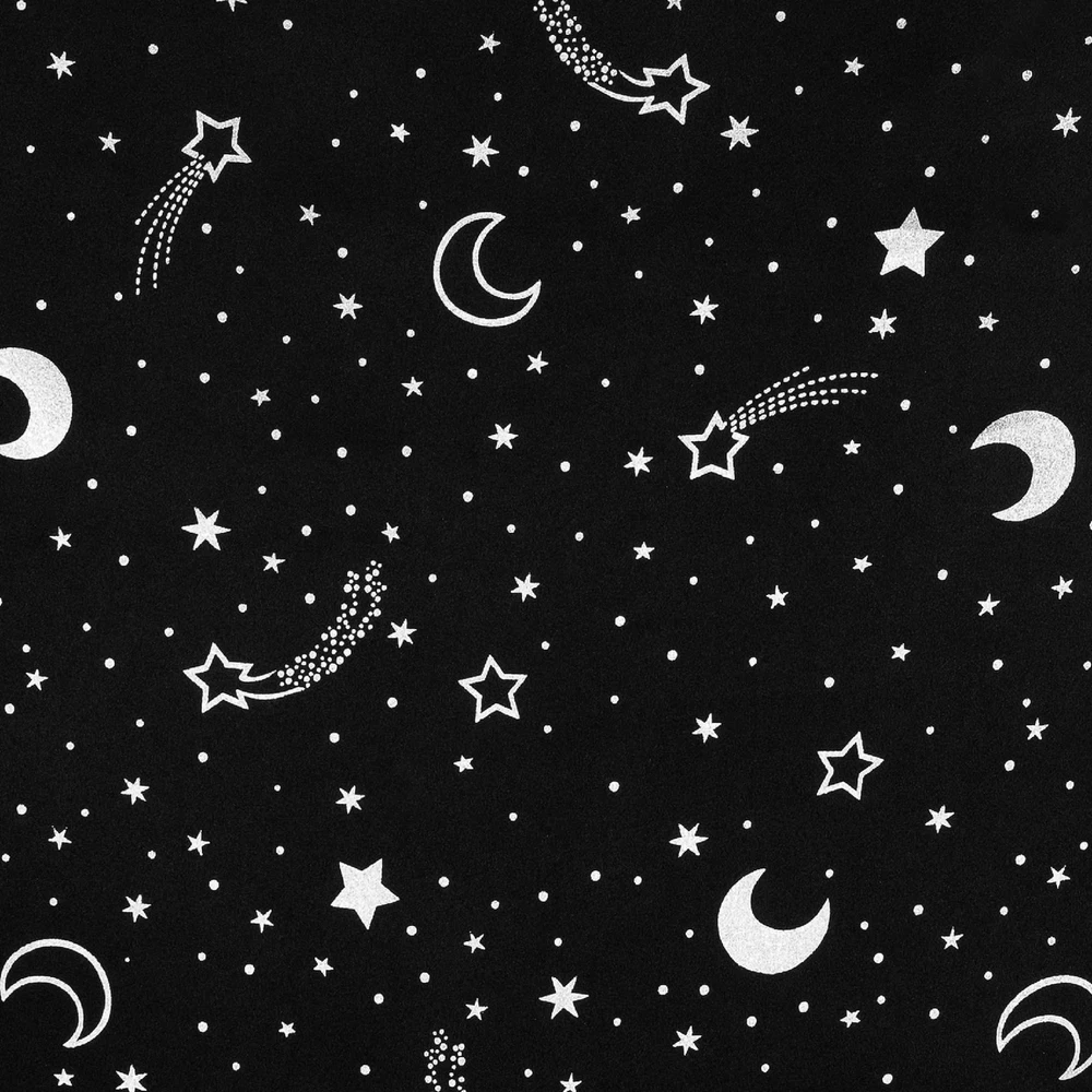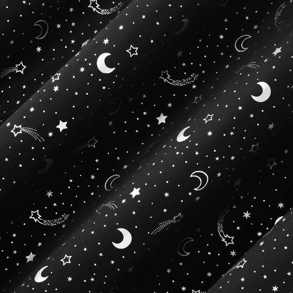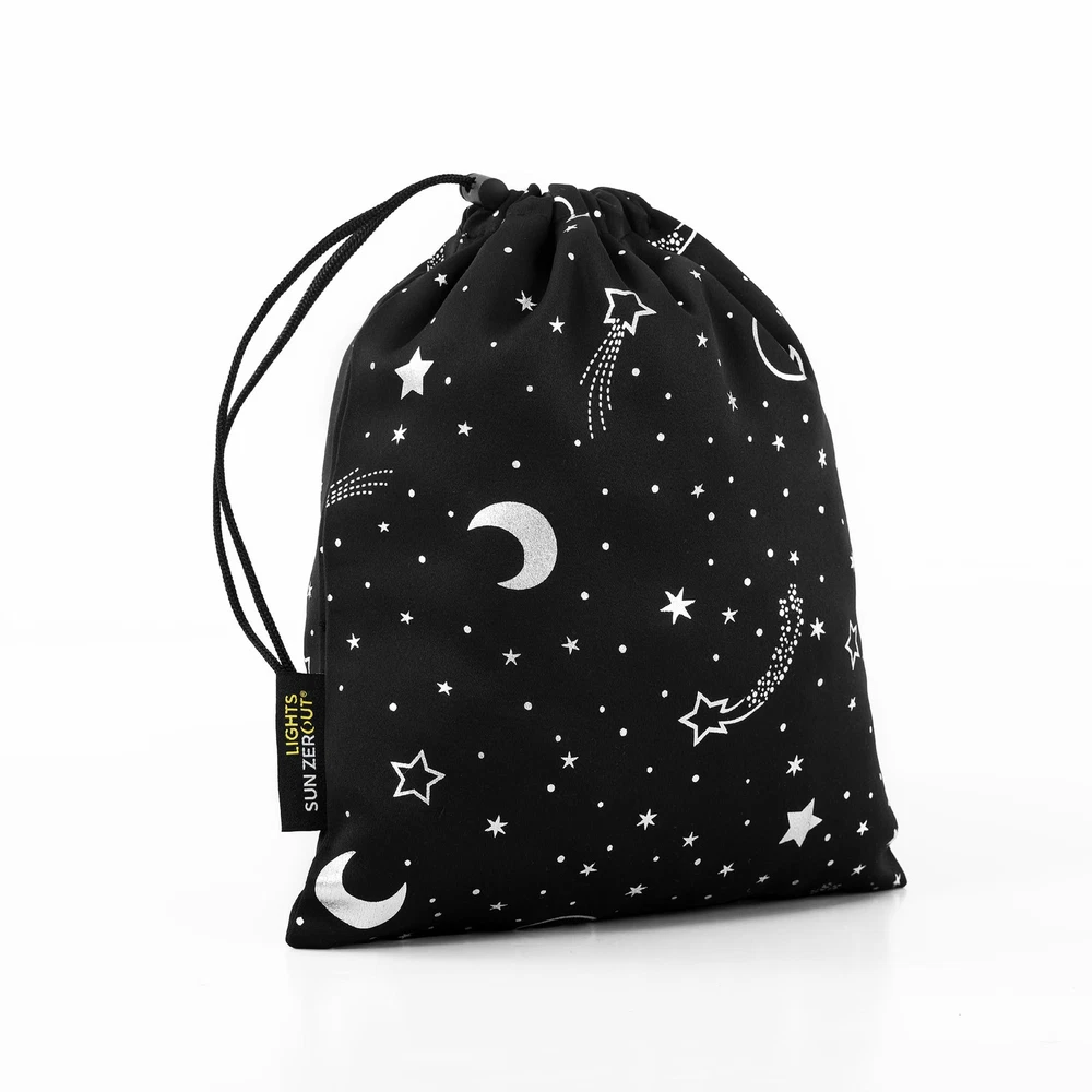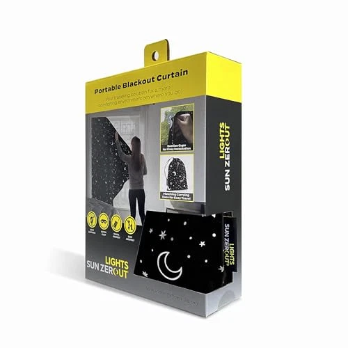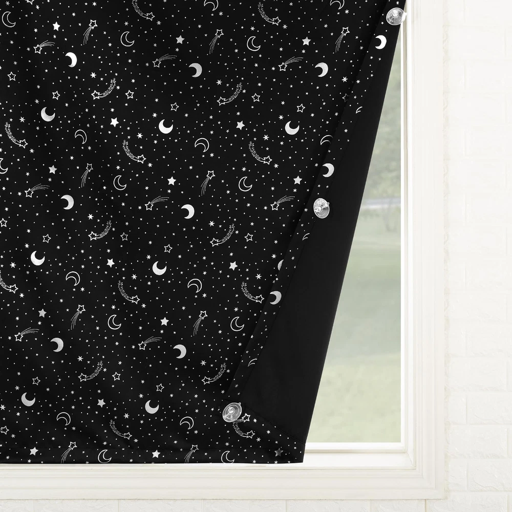 Get a better night’s sleep, anywhere you go. Lights Out Portable Blackout curtains provide the ultimate in light blocking technology to keep out even the harshest of light while adding privacy. Printed starry night design evokes a dark night under the stars. Total Blackout technology is laboratory tested to block out 100% of light and reduce outside noise by up to 35%. Comfort is optimized with thermal properties that help minimize summer heat and winter chill. While made with travel in mind, Lights Out curtains are perfect for baby’s rooms, entertainment rooms, apartments, or anywhere that installing curtain rods isn’t practical. Pre-attached suction cups to allow for easy installation on any window surface. When not in use, your curtain in the included drawstring travel tote for dust-free portability. Sold as individual panels measuring 50" width by 78" length. Measure carefully before selecting your desired size and quantity. Rod not included. Machine wash cold on gentle cycle. Use non-chlorine bleach when needed. Line dry, using a cool iron as needed. Starry night printed curtain blocks out 100% of outside light Included drawstring travel tote allows for dust-free portability Pre-attached suction cups allow for hardware-free installation on the go Thermal insulation helps minimize summer heat and winter chill Noise reduction up to 35% helps you get a sounder, more uninterrupted sleep Includes curtain panel and travel tote