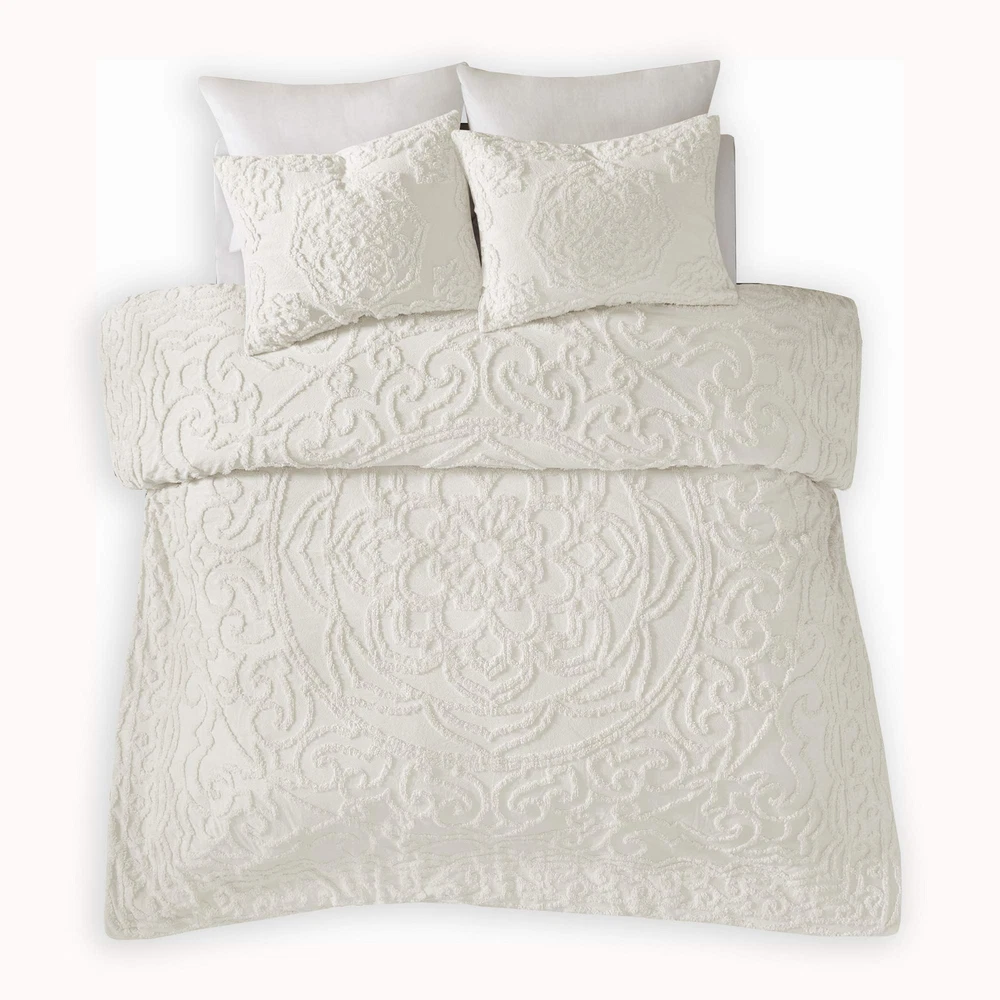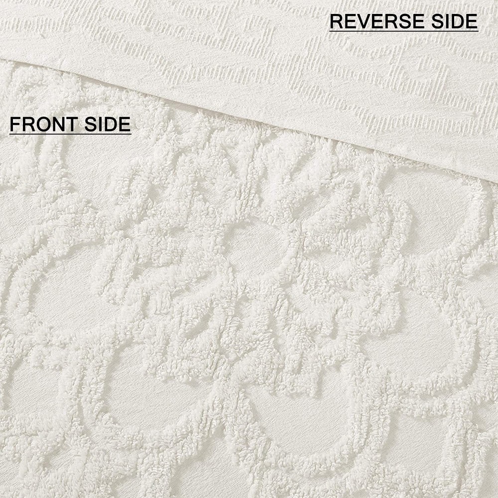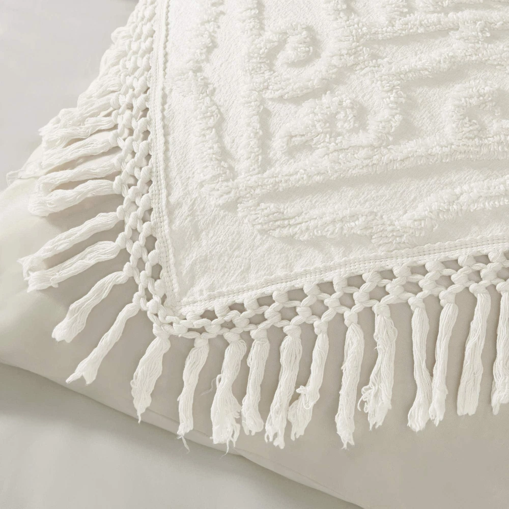 The Laetitia Tufted Cotton Chenille Medallion Fringe Coverlet Set provides an alluring shabby chic update to your bedroom. This globally inspired coverlet features a 100% cotton face and reverse with a tufted chenille medallion centered on top of the bed. A decorative fringe hem adds dimension, while 2 matching shams (1 in Twin/Twin XL) complete the boho look. Perfect for all season use, this bedding set is also OEKO-TEX certified, meaning it does not contain any harmful substances or chemicals to ensure quality comfort and wellness. Due to the nature of the chenille fabric, some shedding will occur naturally in the first 3-4 washes. Made with 100% cotton, this luxurious tufted chenille design, in an all-over geometric pattern, offers a soft texture and dimension to your bed Laetitia tufted cotton chenille medallion coverlet set provides a soft and alluring update to your bedroom décor. Naturally breathable and lightweight cotton fabric that is Oeko-Tex certified to be free of any chemicals and harmful substance for a perfect all season bedding. Set Includes: 1 Coverlet: 68"W x 92"L, 1 Standard Sham: 20"W x 26"L Care instructions: machine washable; due to the nature of the chenille fabric, some shedding will occur naturally in the first 3-4 washes.