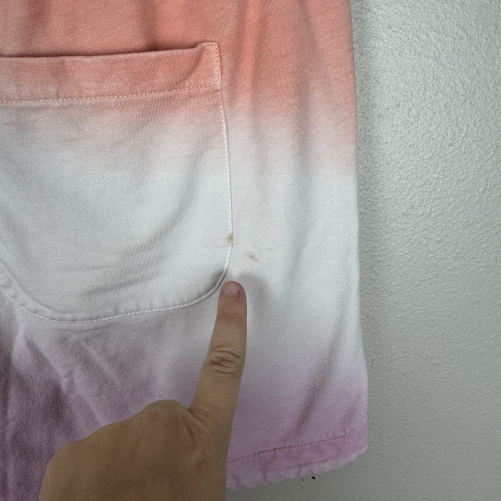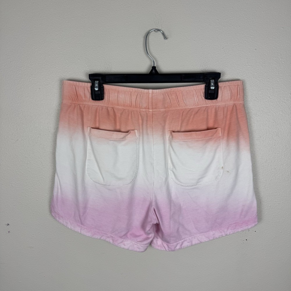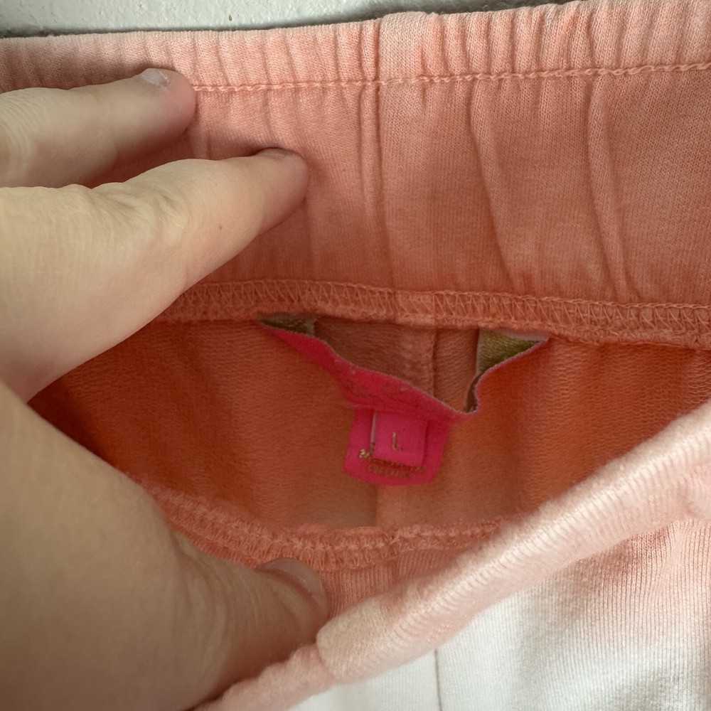 Lilly Pulitzer Womens Kylar Knit Shorts Cantaloupe Dip Dye Size L Orange FLAW Pre owned condition, there are two small spots on the back near the back pocket Elastic waistband Front and back pockets Pink, white, and orange dip dye pattern Sweat shorts Lots of stretch throughout Lightweight, breathable material Cotton, rayon, spandex blend fabric Size large Measurements taken while laid flat Waist - 17 inches Length - 14 inches Inseam - 4.5 inches