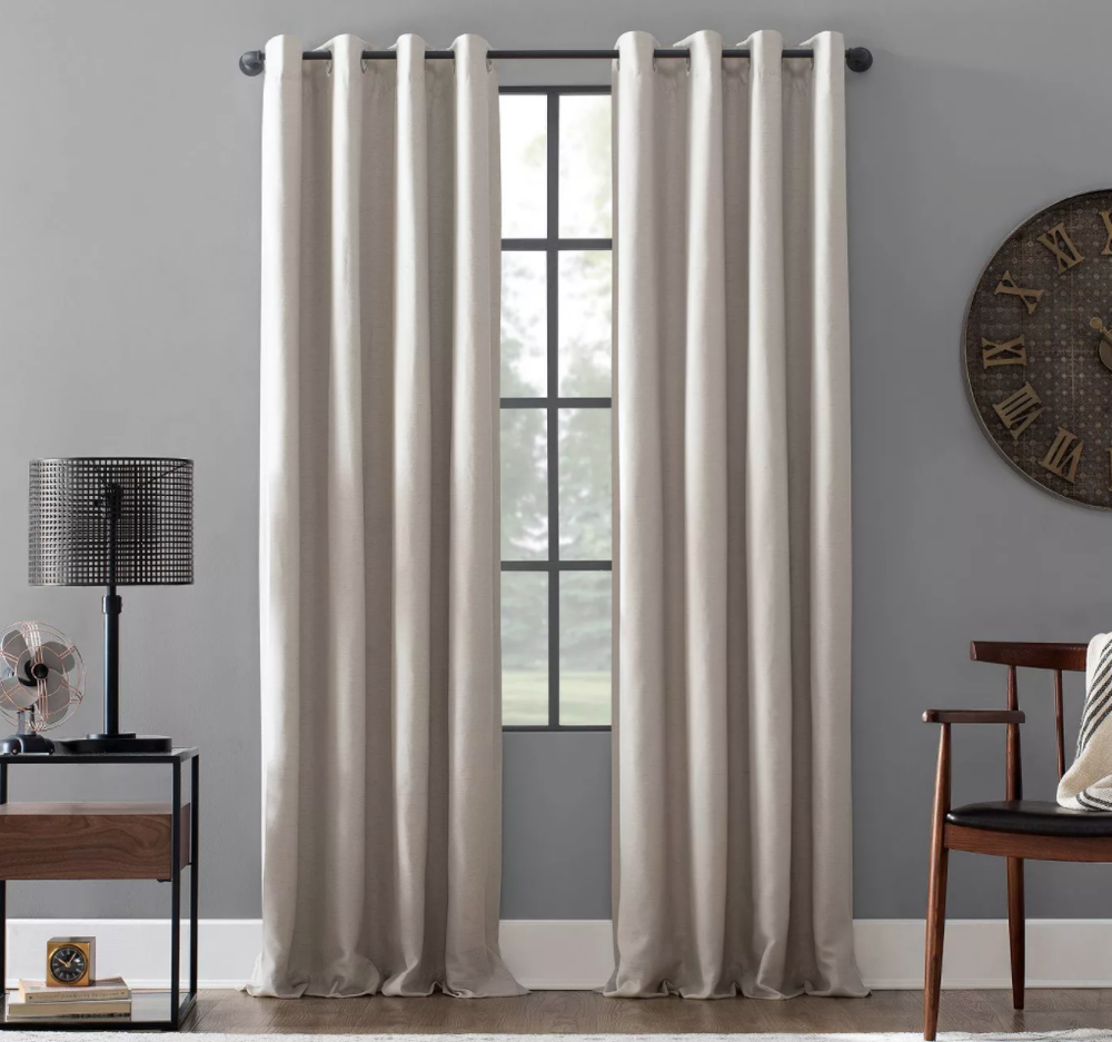 Raw linen texture adds dimension and style to any room of your home Sun Zero Theater Grade 100% Blackout lining offers complete light blocking, thermal efficiency, and noise reduction Silver metal grommet top design fits curtain rods up to 1 ½" in diameter Linen Blend Machine washable This blackout curtain features an ultra-dense linen blend midweight fabric with a stunning raw texture that instantly elevates your decor. The Linen Blend Blackout Grommet Top Curtain from Archaeo is lined with Sun Zero Theater Grade 100% Blackout technology that provides complete light blocking, noise reduction, and thermal efficiency for optimal comfort. Silver metal grommets allow for simple slide-through installation on curtain rods up to 1 ½” in diameter. Sold as individual panels. Measure carefully before selecting your desired size and quantity. Rod not included. Machine wash cold on gentle cycle. Use non-chlorine bleach when needed. Tumble dry on low heat, using a cool iron as needed. Dimensions (Overall): 63 Inches (L), 52 Inches (W) Textile Material: 95% Polyester, 5% Linen Accommodates Pole Size: 1.5 Inches Indoor/Outdoor: Indoor Required, Not Included: Rod Textile construction: Plain Weave Hanging style: Grommet Top Light Filtration: Blackout