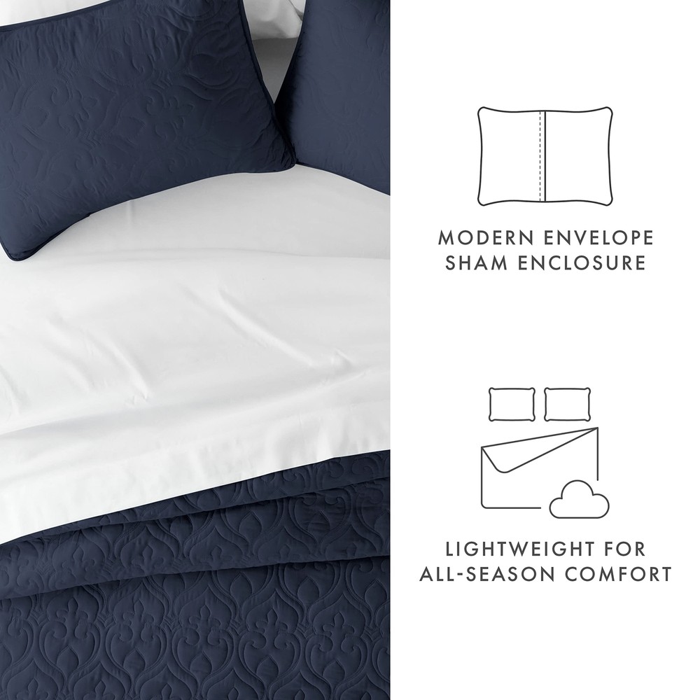 Linen Market 3 Piece Navy Quilt King Size Bed Set - A Lightweight Bedspread & Machine Washable Quilts - Includes Quilted Coverlet and Two Pillow Shams - Perfect Bedding Quilts ✓ Free 60 Day Returns ✓ Free Express Shipping Description: Casual elegance meets pure uncompromising comfort with this Premium Quilted Coverlet by Simply Soft. Sure to compliment any bedroom style, this beautiful coverlet is available in three timeless patterns and six vintage, captivating colors. The Simply Soft Coverlet is spun from our Premium Microfiber yarns, offering twice the durability of cotton. Enjoy easy maintenance with this machine washable, wrinkle free and stain resistant premium beauty. Truly an All Season Coverlet, it will keep you warm in the winter and cool in the summer. The Simply Soft Premium Quilted Coverlet will surely add the finishing touch to your tranquil bedroom oasis. SIZE GUIDE: Twin / Twin Extra Long set includes:. 1 Quilted Coverlet: 68"W x 90"L. 1 Pillow Sham: 20"W x 26"LFull / Queen Set Includes:. 1 Quilted Coverlet: 90"W x 92"L. 2 Pillow Shams: 20"W x 26"LKing / California King Set Includes:. 1 Quilted Coverlet: 106"W x 96"L. 2 Pillow Shams: 20"W x 36"L Features: Microfiber Imported LUXURY & COMFORT - Sleep in comfort! The Simply Soft 3 Piece Quilted Coverlet Set is exactly what you need for a comfortable and relaxing night's sleep. Our Quilted Coverlet Set is luxurious, stylish, and a great value. The perfect fit for any room in your house - bedroom, guest room, kids room, dorm room, RV, vacation home. Great gift idea for men and women, Moms and Dads, Valentine's - Mother's - Father's Day, Birthday, and Christmas. CLASSIC TAILORED LOOK - Set includes: One Quilted Coverlet and two pillow shams (Twin/TwinXL set comes with one pillow sham). HIGH QUALITY - Ultra soft microfiber fabric woven with the finest craftsmanship. Fade, stain, shrink and wrinkle resistant. Machine wash in cold, and quick dries on tumble dry low. More durable than any cotton! TREMENDOUS SELECTION - Colors include Gray, Ivory, Navy, Pale Blue, White and Yellow. Patterns include Damask, Herring, and Square. KING SIZE QUILTED COVERLET SET INCLUDES: 1 King size Quilted Coverlet: 96"W x 106"L Product Details: Size: King/California King Material: Microfiber Color: Damask Navy Pattern: Patchwork Brand: Linen Market Size: King/California King Material: Microfiber Color: Damask Navy Pattern: Patchwork Brand: Linen Market Special Feature: uperior weave for durability and a breathable soft touch Style: Contemporary Included Components: 1 Coverlet Quilt, 2 Pillow Shams Thread Count: 20000 Age Range (Description): Adult Product Care Instructions: Machine Wash Theme: No theme Seasons: All Item dimensions L x W x H: 108 x 94 x 0.5 inches Item Weight: 7 Pounds Pillowcase Quantity: 2 Unit Count: 1.0 Count Global Trade Identification Number: 45 Manufacturer: ienjoy Home UPC: 842933134045 Product Dimensions: 108 x 94 x 0.5 inches Item Weight: 7 pounds Country of Origin: China Item model number: LM-QLT-DAM-KING-NAVY Fabric Type: Microfiber Refill: down-alternative, fiber, cotton, fiber down_alternative Finish types: Double Brushed Microfiber Perfume: Unscented Assembly required: No Number of pieces: 3 Warranty Description: 30 day manufacturer defect Batteries required: No Import: Imported
