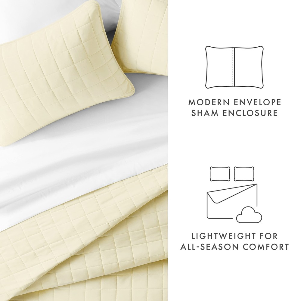 Linen Market 3 Piece Yellow Quilt Queen Size Bed Set - A Lightweight Bedspread & Machine Washable Quilts - Includes Quilted Coverlet and Two Pillow Shams - Perfect Bedding Quilts (Queen Size Sets) Description Casual elegance meets pure uncompromising comfort with this Premium Quilted Coverlet by Simply Soft. Sure to compliment any bedroom style, this beautiful coverlet is available in three timeless patterns and six vintage, captivating colors. The Simply Soft Coverlet is spun from our Premium Microfiber yarns, offering twice the durability of cotton and is 100% hypoallergenic. Enjoy easy maintenance with this machine washable, wrinkle free and stain resistant premium beauty. Truly an All Season Coverlet, it will keep you warm in the winter and cool in the summer. The Simply Soft Premium Quilted Coverlet will surely add the finishing touch to your tranquil bedroom oasis. SIZE GUIDE: Twin / Twin Extra Long set includes:. 1 Quilted Coverlet: 68"W x 90"L. 1 Pillow Sham: 20"W x 26"LFull / Queen Set Includes:. 1 Quilted Coverlet: 90"W x 92"L. 2 Pillow Shams: 20"W x 26"LKing / California King Set Includes:. 1 Quilted Coverlet: 106"W x 96"L. 2 Pillow Shams: 20"W x 36"L Features: Microfiber Imported LUXURY & COMFORT - Sleep in comfort! The Simply Soft 3 Piece Quilted Coverlet Set is exactly what you need for a comfortable and relaxing night's sleep. Our Quilted Coverlet Set is luxurious, stylish, and a great value. The perfect fit for any room in your house - bedroom, guest room, kids room, dorm room, RV, vacation home. Great gift idea for men and women, Moms and Dads, Valentine's - Mother's - Father's Day, Birthday, and Christmas. CLASSIC TAILORED LOOK - Set includes: One Quilted Coverlet and two pillow shams (Twin/TwinXL set comes with one pillow sham). HIGH QUALITY - Ultra soft microfiber fabric woven with the finest craftsmanship. Fade, stain, shrink and wrinkle resistant. Machine wash in cold, and quick dries on tumble dry low. More durable than any cotton! TREMENDOUS SELECTION - Colors include Gray, Ivory, Navy, Pale Blue, White and Yellow. Patterns include Damask, Herring, and Square. QUEEN SIZE QUILTED COVERLET SET INCLUDES: 1 Queen size Quilted Coverlet: 90"W x 92"L Product Details: Size: Queen/Full Included Components: 1 Coverlet Quilt, 2 Pillow Shams Color: Square Yellow Style: Patterned Brand: Linen Market Size: Queen/Full Included Components: 1 Coverlet Quilt, 2 Pillow Shams Color: Square Yellow Style: Patterned Brand: Linen Market Theme: No theme Pattern: Square Material: Microfiber Fabric Type: Microfiber Number of Pieces: 3 Seasons: All Thread Count: 20000 Product Care Instructions: Machine Wash Manufacturer: ienjoy Home UPC: 842933134496 Item dimensions L x W x H: 92 x 92 x 0.5 inches Global Trade Identification Number: 96 Product Dimensions: 92 x 92 x 0.5 inches Item Weight: 5.9 pounds Item model number: LM-QLT-5-1-3 Refill: down-alternative, fiber, cotton, fiber down_alternative Perfume: Unscented Assembly required: No Warranty Description: 30 day manufacturer defect Batteries required: No Import: Imported Shipping Free fast shipping Return Policy All items qualify for returns within 30 days of receipt.
