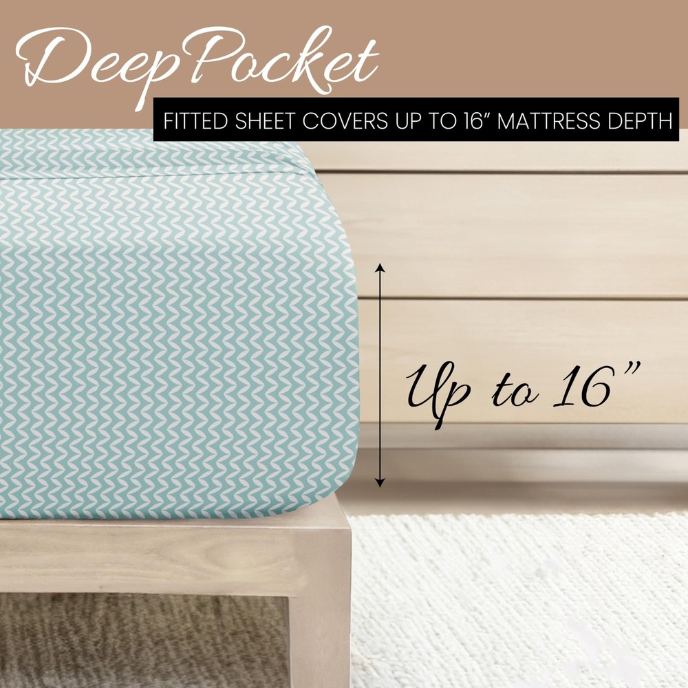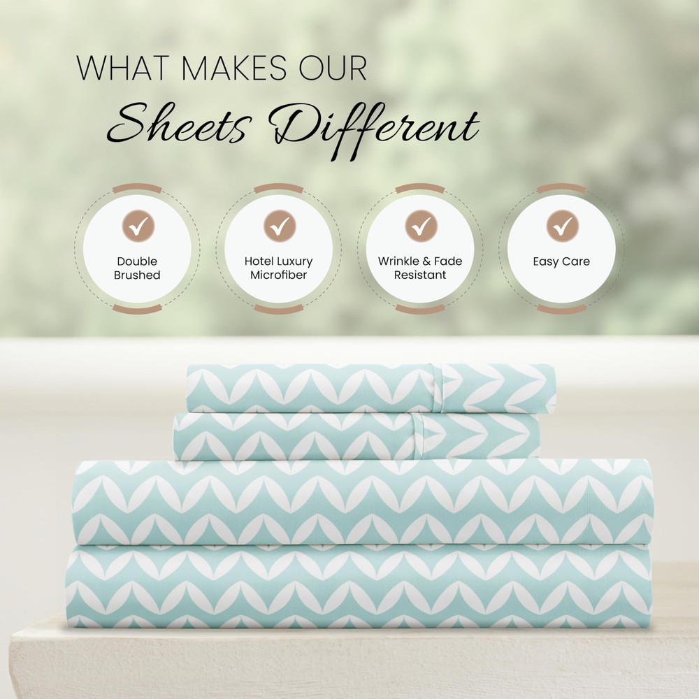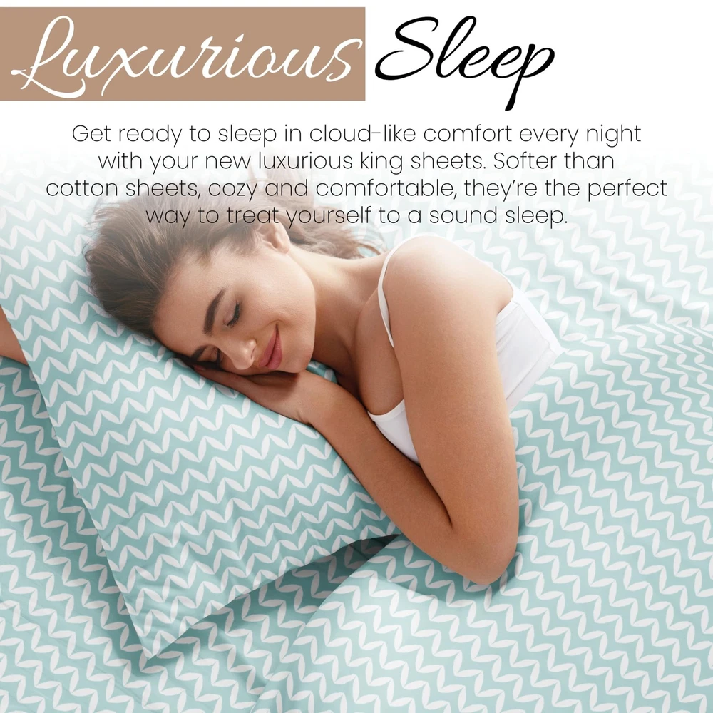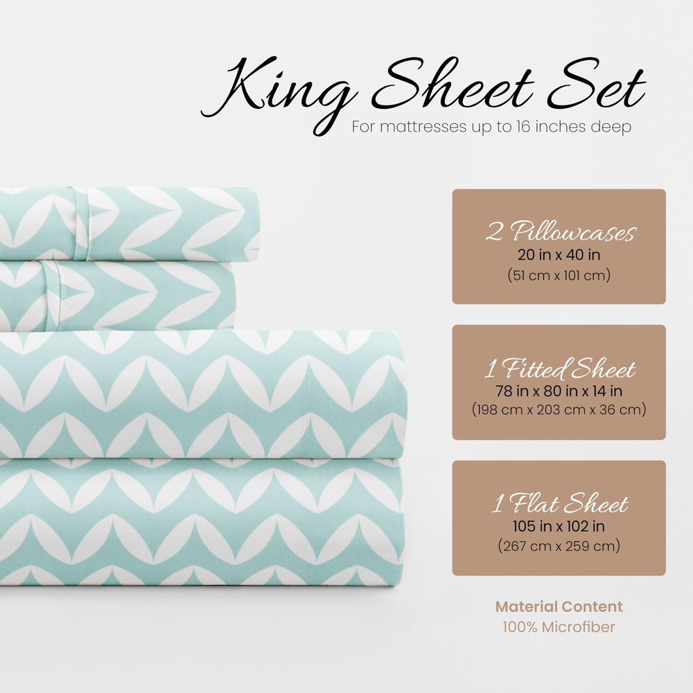 Linen Market Double-Brushed Patterned Microfiber King Sheet Set 4 Piece – Oeko-TEX Certified Ultra Soft & Wrinkle-Free - 16" Deep Pocket Sheets - Easy Care King Size - Puffed Chevron Light Blue ✓ Free 60 Day Returns ✓ Free Express Shipping Description: Features: 100% Microfiber Imported LUXURIOUS SLEEP: Get ready to sleep in cloud-like comfort every night with your new luxurious twin sheets. Softer than cotton sheets, cozy and comfortable, they're the perfect way to treat yourself to a sound sleep. WHAT MAKES OUR SHEETS DIFFERENT: Most bed sheet fabrics are only brushed once to soften them up, but to make sure you get the best nights sleep, we brush our fabric TWICE. Tuck yourself into these cloud-like sheets and soundly drift off to sleep every night. EASY SHEET CHANGES: Changing sheets on deep beds is frustrating, but not with our 16 deep pocket sheets. Our snug-fit design allows for you to easily put your fitted sheets on without the hassle of wrestling down every corner. This set includes a fitted and flat sheet, and two pillowcases. CONFIDENTLY DURABLE: Pets, kids, and family life can take a hard toll on sheets and other bedding, but our microfiber twin size sheets are made to last. Expert stitching and seams ensure that your durable twin sheet set stands up to wear and tear for years to come. BEAUTIFUL BED SHEETS: Our unique Puffed Chevron print is sure to add a touch of elegance and brighten up your bedroom. Check all 19 of our popular color options in all 5 size options to find the perfect match for every bedroom in your home. Product Details: Size: King Material: Microfiber Color: Puffed Chevron Light Blue Pattern: Patterned Brand: Linen Market Size: King Material: Microfiber Color: Puffed Chevron Light Blue Pattern: Patterned Brand: Linen Market Number of Pieces: 4 Special Feature: Wrinkle Resistant Style: Patterned Included Components: Pillowcase, Fitted Sheet, Flat Sheet Thread Count: 20000 Product Care Instructions: Machine Wash Theme: Geometric Seasons: All Item dimensions L x W x H: 105 x 102 x 1 inches Weave Type: Sateen Pillowcase Quantity: 2 Unit Count: 1.0 Count Global Trade Identification Number: 54 Manufacturer: ienjoy Home UPC: 816651028054 Product Dimensions: 105 x 102 x 1 inches Item Weight: 3.63 pounds Item model number: LM-4PC-1-1 Fabric Type: 100% Microfiber Finish types: Double brushed microfiber Assembly required: No Batteries required: No Import: Imported