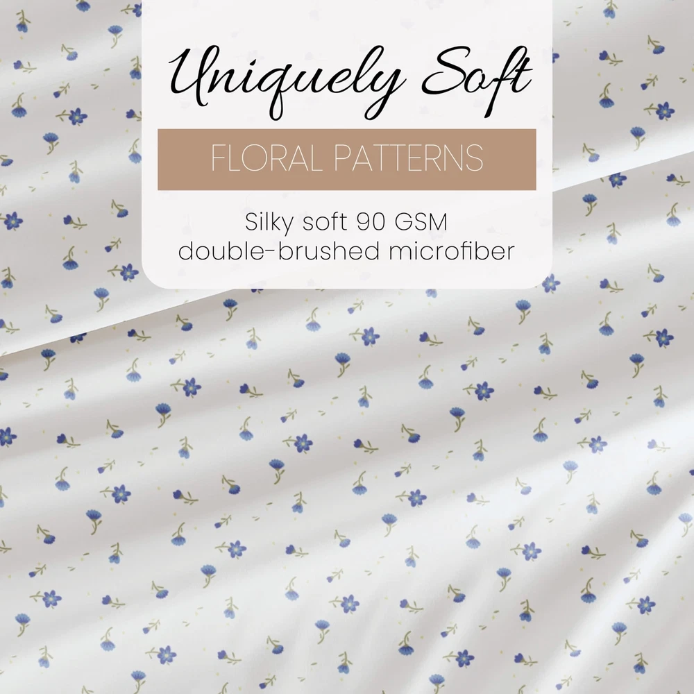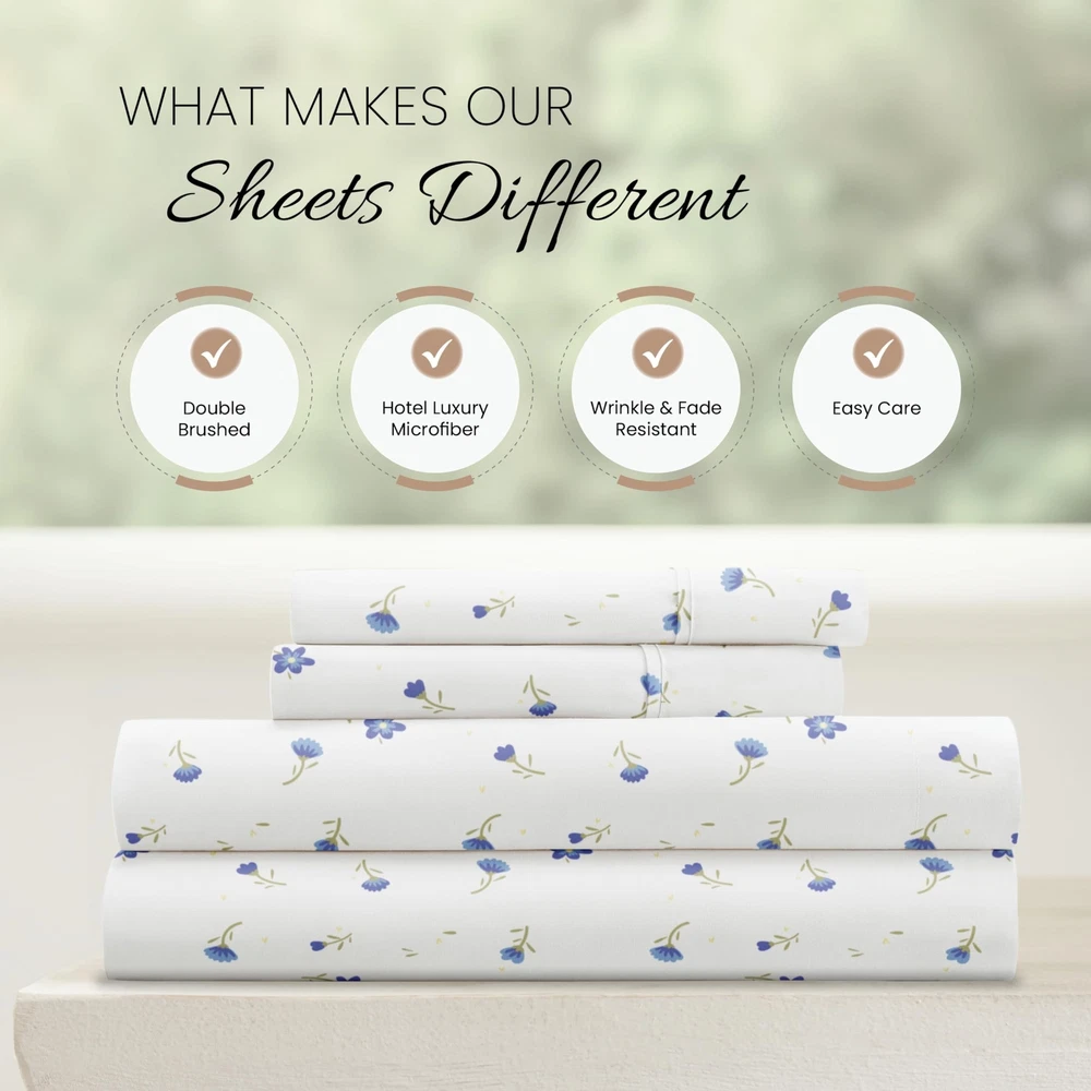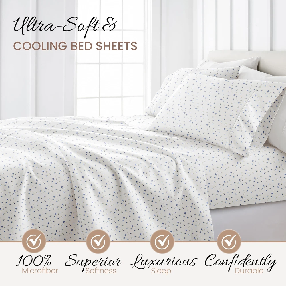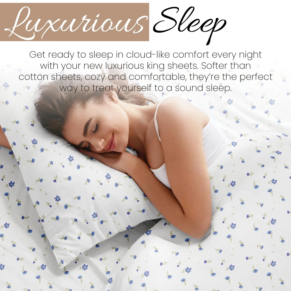 Linen Market 4 Piece King Bedding Sheet Set (Light Blue Floral) - Sleep Better Than Ever with These Ultra-Soft & Cooling Bed Sheets for Your King Size Bed - Deep Pocket Fits 16" Mattress Description Features: 100% Microfiber Imported LUXURY AND COMFORT-You'll be amazed at how silky soft, and comfortable these luxurious bed sheets are! iEnjoy Home luxury sheet sets are designer sheets at an unbelievable price. The perfect fit for any room in your house - bedroom, guest room, kids room, dorm room, RV, vacation home. Great gift idea for men and women, Moms and Dads, Valentine's - Mother's - Father's Day, Birthday, and Christmas. Made of the finest double-brushed microfiber yarns creating a new standard in softness and breathability More durable than cotton, completely wrinkle-free and perfect for all seasons TREMENDOUS SELECTION - Colors include Aqua, Black, Burgundy, Chocolate, Cream, Gold, Gray, Ivory, Light Gray, Navy, Purple, Sage, Taupe, and White. Patterns include Arrow, Blossoms, Burst of Vines, Coarse Paisley, Houndstooth, Honeycomb, Make A Wish, Mercedes, Polkadot, Puffed Chevron, Quatrefoil, Ribbon, Scallops, Soft Floral, Stippled, Thatch, Vines, and Wheatfield. BEAUTIFUL BED SHEETS: Our unique Soft Floral print is sure to add a touch of elegance and brighten up your bedroom. Check all 19 of our popular color options in all 5 size options to find the perfect match for every bedroom in your home. Product Details: Size: King Material: Microfiber Color: Soft Floral Light Blue Pattern: Patterned Brand: Linen Market Size: King Material: Microfiber Color: Soft Floral Light Blue Pattern: Patterned Brand: Linen Market Number of Pieces: 4 Special Feature: Wrinkle Resistant Style: Modern Included Components: 1 Flat Sheet, 1 Fitted Sheet, 2 Pillow Cases Closure Type: No Closure Thread Count: 20000 Age Range (Description): Adult Product Care Instructions: Machine Wash Theme: Floral Cartoon Character: Floral Seasons: All Item dimensions L x W x H: 105 x 102 x 1 inches Pillowcase Quantity: 2 Unit Count: 1.0 Count Sham Quantity: 2 Item Display Dimensions: 105 x 102 x 1 inches Global Trade Identification Number: 20 Manufacturer: ienjoy Home UPC: 816651028320 Product Dimensions: 105 x 102 x 1 inches Item Weight: 3.52 pounds Country of Origin: China Item model number: IEH-4PC-SFL-K-LB Fabric Type: 100% Microfiber Finish types: Double Brushed Microfiber Perfume: Light Blue - Soft Floral Assembly required: No Batteries required: No Import: Imported Shipping Free fast shipping Return Policy All items qualify for returns within 30 days of receipt.