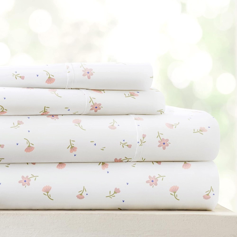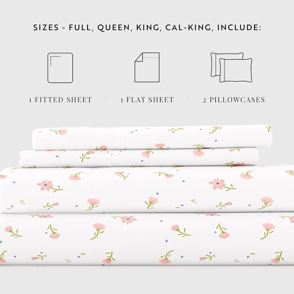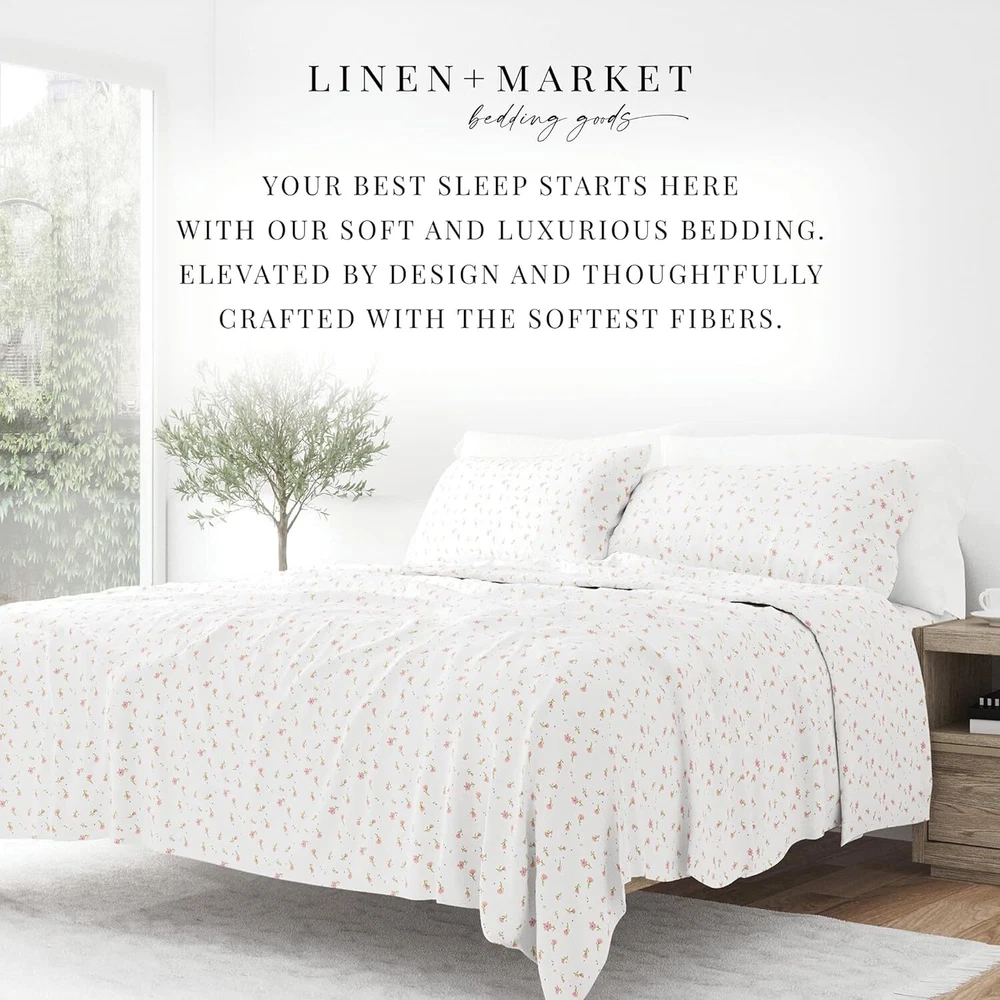 Linen Market 4 Piece King Sheet Set (Pink Floral) - King, Soft Floral Pink Product Details Size: King Material: Microfiber Color: Soft Floral Pink Pattern: Patterned Brand: Linen Market Number of Pieces: 4 Special Feature: Machine Washable, Fade Resistant, Wrinkle Resistant Style: Modern Included Components: 1 Flat Sheet, 1 Fitted Sheet, 2 Pillow Cases, 1 Flat Sheet, 2 Pillow Cases Closure Type: Pull On Thread Count: 20000 Age Range (Description): Adult Product Care Instructions: Machine Wash, Tumble Dry Low Theme: Floral Cartoon Character: Floral Seasons: All Item Dimensions LxWxH: 105 x 102 x 1 inches Item Weight: 1.2 Pounds Pillowcase Quantity: 2 Unit Count: 1.0 Count Item Display Dimensions: 105 x 102 x 1 inches Product Dimensions: 105 x 102 x 1 inches Item Weight: 1.23 pounds Department: unisex-adult Manufacturer: ienjoy Home Item model number: IEH-4PC-SFL-K-PI Fabric Type: 100% Microfiber Finish types: Double Brushed Microfiber Perfume: Pink - Soft Floral Assembly required: No Batteries required: No Import: Imported 100% Microfiber Imported LUXURIOUS SLEEP: Get ready to sleep in cloud-like comfort every night with your new luxurious king sheets. Softer than cotton sheets, cozy and comfortable, they're the perfect way to treat yourself to a sound sleep. WHAT MAKES OUR SHEETS DIFFERENT: Most bed sheet fabrics are only brushed once to soften them up, but to make sure you get the best night’s sleep, we brush our fabric TWICE. Tuck yourself into these cloud-like sheets and soundly drift off to sleep every night. EASY SHEET CHANGES: Changing sheets on deep beds is frustrating, but not with our 16” deep pocket sheets. Our snug-fit design allows for you to easily put your fitted sheets on without the hassle of wrestling down every corner. This set includes a fitted and flat sheet, and two pillowcases. CONFIDENTLY DURABLE: Pets, kids, and family life can take a hard toll on sheets and other bedding, but our microfiber king size sheets are made to last. Expert stitching and seams ensure that your durable king sheet set stands up to wear and tear for years to come. BEAUTIFUL BED SHEETS: Our unique Soft Floral print is sure to add a touch of elegance and brighten up your bedroom. Check all 19 of our popular color options in all 5 size options to find the perfect match for every bedroom in your home. Give your room a refreshing new look and feel with this easy care, deep pocket, sheet set by Linen Market. This set is made from 90 GSM double brushed microfiber, creating a soft finish that makes you want to stay in bed all day. The moisture wicking properties, help keep you dry - it also helps transfer body heat allowing you a comfortable night's sleep. You also don't have to worry about high maitenence upkeep with this wrinkle resistant, machine washable set - just throw it in the washing machine with cold water, and tumble dry on low! (Be sure not to use bleach or fabric softener - and follow all care instructions listed on the product's tag). Featuring a variety of colors and patterns, find the one that will help elevate the design of your bedroom.