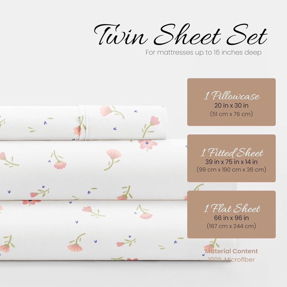 Linen Market Double-Brushed Patterned Microfiber Twin Sheet Twin, Floral Pink Product Details Size: Twin Material: Microfiber Color: Floral Pink Pattern: Patterned Brand: Linen Market Number of Pieces: 3 Special Feature: Wrinkle Resistant Style: Modern Included Components: 1 Flat Sheet, 1 Fitted Sheet, 1 Pillow Case Closure Type: Pull-On Thread Count: 20000 Age Range (Description): Adult Product Care Instructions: Machine Wash Theme: Floral Cartoon Character: Floral Seasons: All Item dimensions L x W x H: 96 x 66 x 1 inches Weave Type: satin weave Pillowcase Quantity: 1 Unit Count: 1.0 Count Sham Quantity: 1 Item Display Dimensions: 96 x 66 x 1 inches Manufacturer: ienjoy Home Product Dimensions: 96 x 66 x 1 inches Item Weight: 2.04 pounds Item model number: IEH-4PC-SFL-TW-PI Fabric Type: 100% Microfiber Finish types: Double Brushed Microfiber Perfume: Pink - Soft Floral Assembly required: No Batteries required: No Import: Imported 100% Microfiber Imported LUXURIOUS SLEEP: Get ready to sleep in cloud-like comfort every night with your new luxurious twin sheets. Softer than cotton sheets, cozy and comfortable, they're the perfect way to treat yourself to a sound sleep. WHAT MAKES OUR SHEETS DIFFERENT: Most bed sheet fabrics are only brushed once to soften them up, but to make sure you get the best night’s sleep, we brush our fabric TWICE. Tuck yourself into these cloud-like sheets and soundly drift off to sleep every night. EASY SHEET CHANGES: Changing sheets on deep beds is frustrating, but not with our 16” deep pocket sheets. Our snug-fit design allows for you to easily put your fitted sheets on without the hassle of wrestling down every corner. This set includes a fitted and flat sheet, and one pillowcase. CONFIDENTLY DURABLE: Pets, kids, and family life can take a hard toll on sheets and other bedding, but our microfiber twin size sheets are made to last. Expert stitching and seams ensure that your durable twin sheet set stands up to wear and tear for years to come. BEAUTIFUL BED SHEETS: Our unique Soft Floral print is sure to add a touch of elegance and brighten up your bedroom. Check all 19 of our popular color options in all 5 size options to find the perfect match for every bedroom in your home.