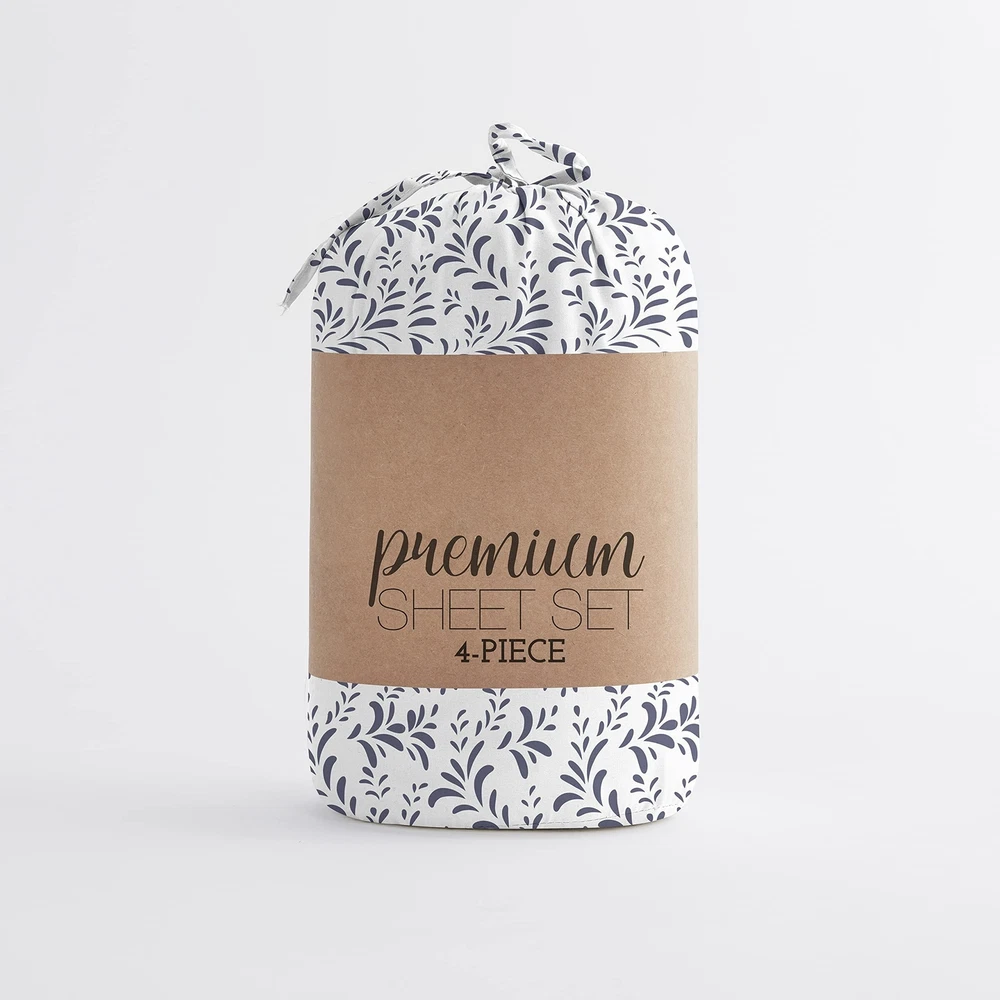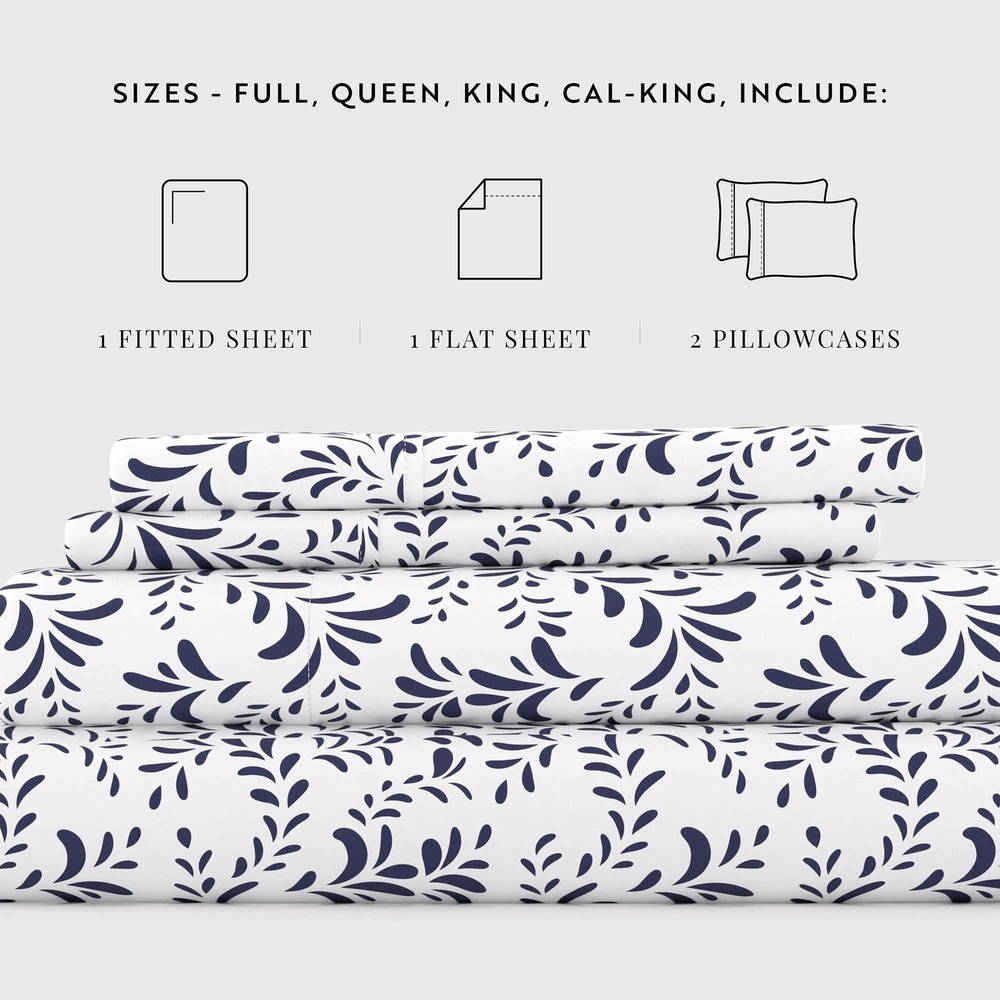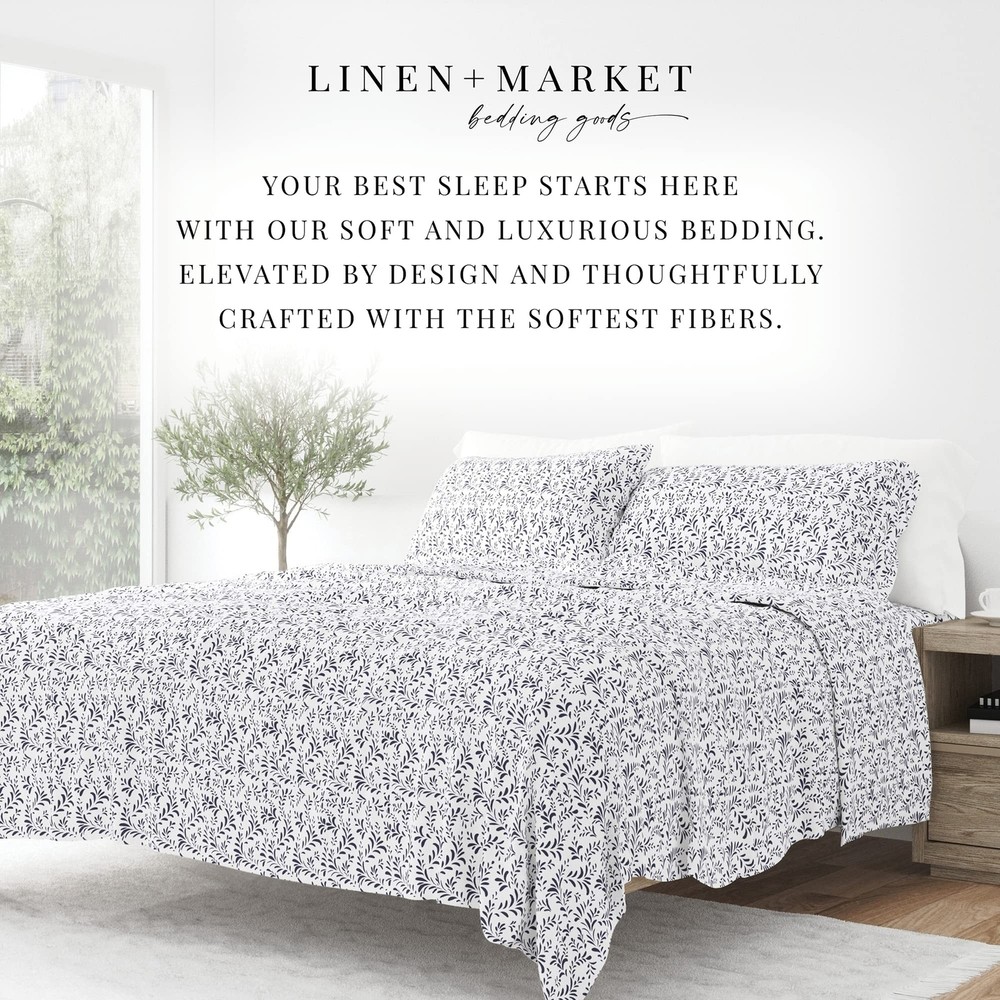 Linen Market Easy Care Double Brushed Microfiber 16" Deep Pocket 4 Piece Bed Sheet Set, Burst of Vines Navy, King ✓ Free 60 Day Returns ✓ Free Express Shipping Description: iEnjoy Home is designed with your comfort in mind. Made of the finest double- brushed microfiber yarns creating a new standard in softness and breathability. Our premium yarns are two times more durable than cotton, completely wrinkle-free, and perfect for all seasons. Features: 100% Microfiber Imported LUXURY AND COMFORT-You'll be amazed at how silky soft, and comfortable these luxurious bed sheets are! iEnjoy Home luxury sheet sets are designer sheets at an unbelievable price. The perfect fit for any room in your house - bedroom, guest room, kids room, dorm room RV, vacation home. Great gift idea for men and women, Moms and Dads, Valentine's - Mother's - Father's Day, Birthday, and Christmas. CLASSIC TAILORED LOOK - Set includes: One flat sheet, one fitted sheet (with deep pockets), and two pillowcases. Twin/TwinXL come with one pillowcase. HIGH QUALITY - Ultra soft microfiber fabric woven with the finest craftsmanship. Good hand feel and very cozy to sleep on. Fade, stain, shrink and wrinkle resistant. Machine wash in cold, and quick dries on tumble dry low. More durable than any cotton! TREMENDOUS SELECTION - Colors include Aqua, Black, Burgundy, Chocolate, Cream, Gold, Gray, Ivory, Light Gray, Navy, Purple, Sage, Taupe, and White. Patterns include Arrow, Blossoms, Burst of Vines, Coarse Paisley, Houndstooth, Honeycomb, Make A Wish, Mercedes, Polkadot, Puffed Chevron, Quatrefoil, Ribbon, Scallops, Soft Floral, Stippled, Thatch, Vines, and Wheatfield. KING SIZE BED SHEET SET INCLUDES: 1 King Fitted Sheet: 78" W x 80" L + 16"; 1 King Flat Sheet: 102" W x 105" L; 2 King Pillowcases: 20" W x 40" L Product Details: Size: King Material: Microfiber Color: Burst of Vines Navy Pattern: Patterned Brand: Linen Market Size: King Material: Microfiber Color: Burst of Vines Navy Pattern: Patterned Brand: Linen Market Special Feature: Deep Pocket, Wrinkle Resistant Style: Patterned Included Components: 1 Fitted Sheet, 1 Flat Sheet, 2 Pillow Cases Closure Type: Zipper Thread Count: 20000 Age Range (Description): Adult Product Care Instructions: Machine Wash Theme: Floral Cartoon Character: Floral Seasons: All Item dimensions L x W x H: 105 x 102 x 1 inches Pillowcase Quantity: 2 Unit Count: 1.0 Count Global Trade Identification Number: 14 Manufacturer: ienjoy Home UPC: 816651027514 Product Dimensions: 105 x 102 x 1 inches Item Weight: 3.49 pounds Item model number: LM-4PC-1-1 Fabric Type: 100% Microfiber Finish types: Double Brushed Microfiber Assembly required: No Number of pieces: 4 Batteries required: No Import: Imported
