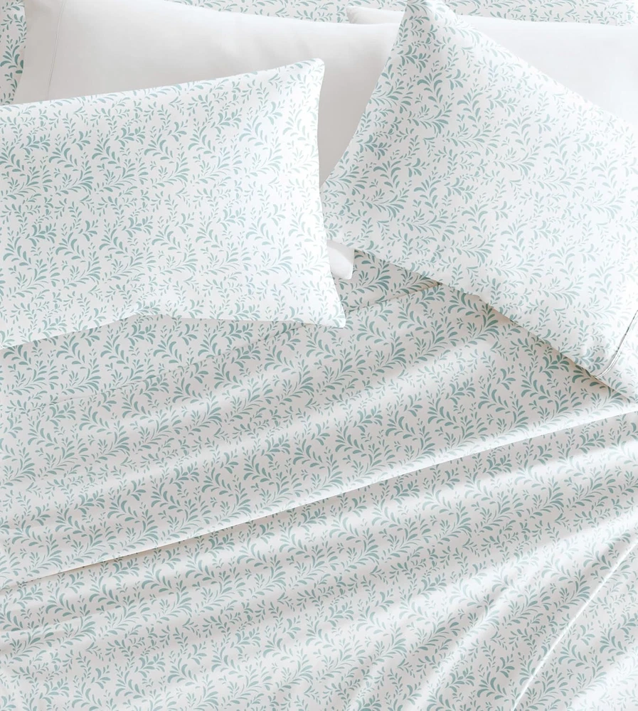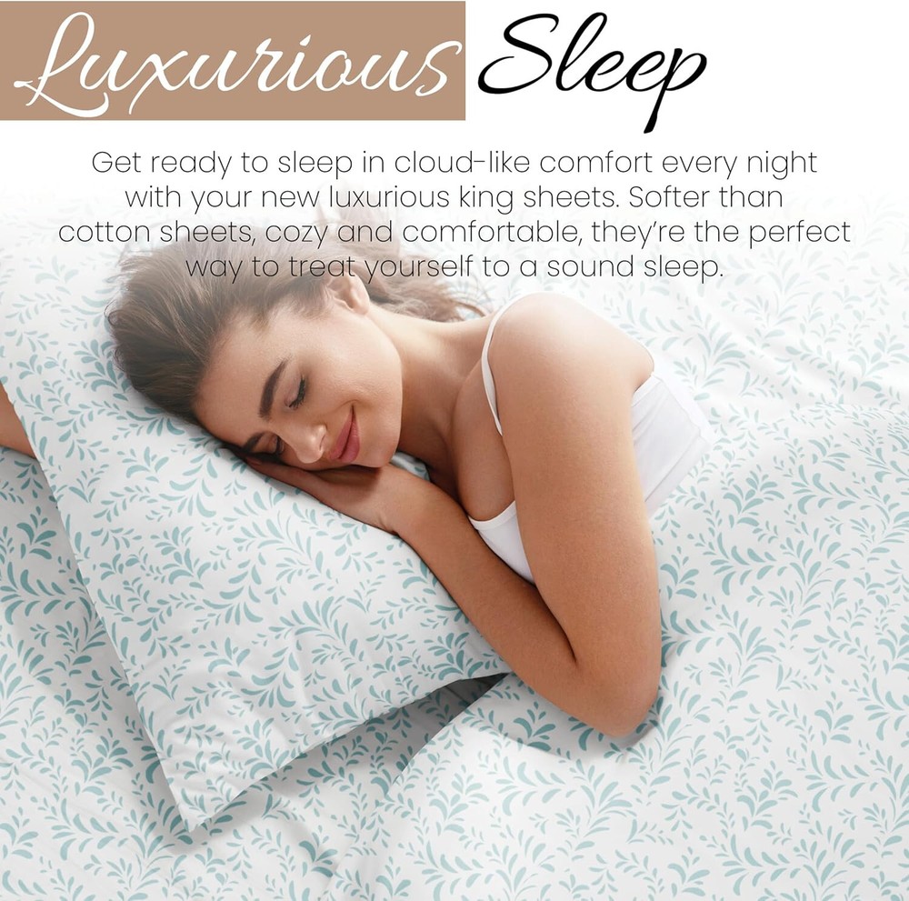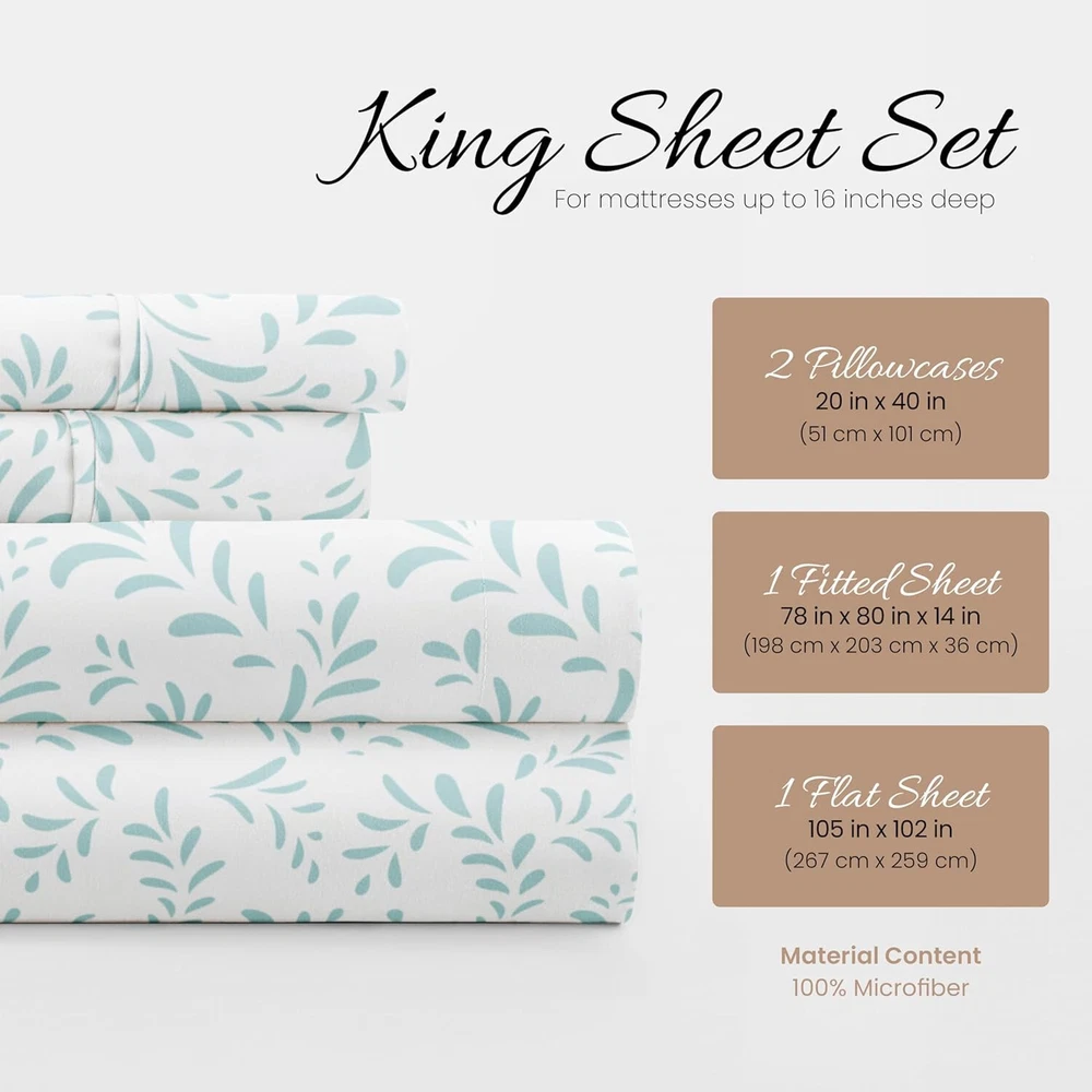 Size King Material Microfiber Color Burst of Vines Light Blue Pattern Patterned Brand Linen Market About this item 100% Microfiber Imported LUXURIOUS SLEEP: Get ready to sleep in cloud-like comfort every night with your new luxurious king sheets. Softer than cotton sheets, cozy and comfortable, they're the perfect way to treat yourself to a sound sleep. WHAT MAKES OUR SHEETS DIFFERENT: Most bed sheet fabrics are only brushed once to soften them up, but to make sure you get the best night’s sleep, we brush our fabric TWICE. Tuck yourself into these cloud-like sheets and soundly drift off to sleep every night. EASY SHEET CHANGES: Changing sheets on deep beds is frustrating, but not with our 16” deep pocket sheets. Our snug-fit design allows for you to easily put your fitted sheets on without the hassle of wrestling down every corner. This set includes a fitted and flat sheet, and two pillowcases. CONFIDENTLY DURABLE: Pets, kids, and family life can take a hard toll on sheets and other bedding, but our microfiber king size sheets are made to last. Expert stitching and seams ensure that your durable king sheet set stands up to wear and tear for years to come. BEAUTIFUL BED SHEETS: Our unique Burst of Vines print is sure to add a touch of elegance and brighten up your bedroom. Check all 19 of our popular color options in all 5 size options to find the perfect match for every bedroom in your home.