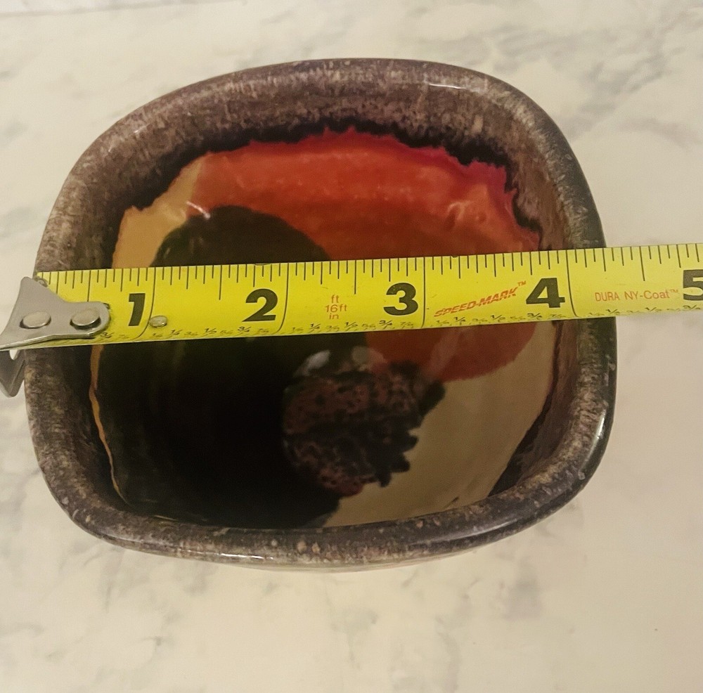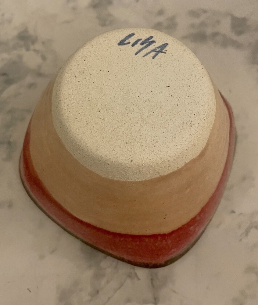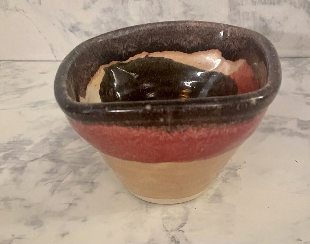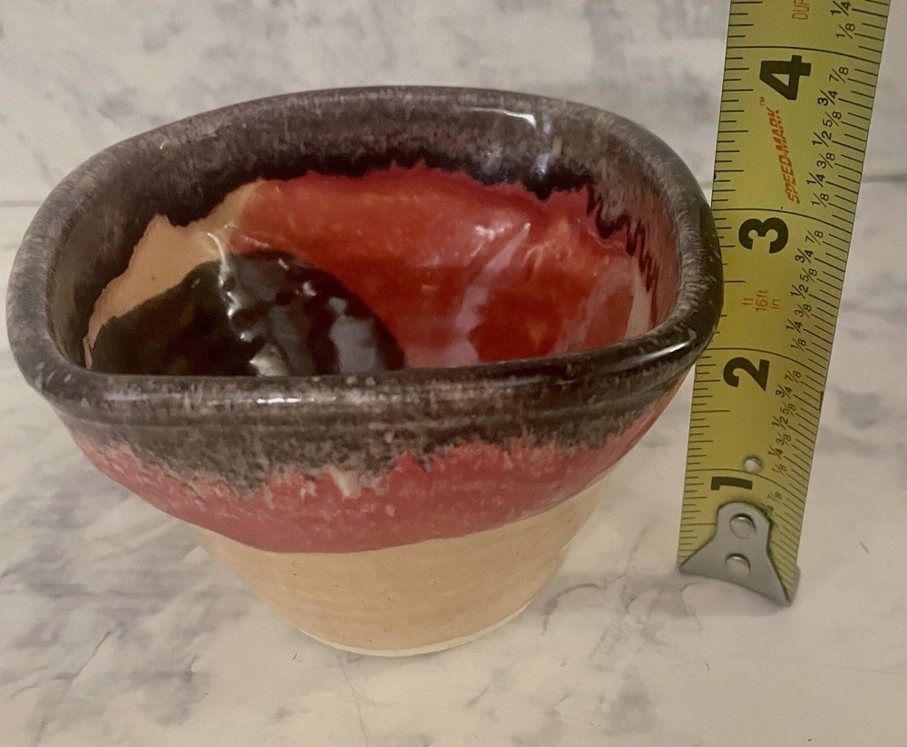 This beautiful boho bowl is a work of art, created by Lisa Howe in a contemporary style. The square shape is perfect for any occasion and the hand-painted floral pattern in multi-colors adds a touch of nature to your decor. Standing at 3 inches tall and 4 inches wide, this small trinket dish is perfect for holding your treasures. Made from clay and glazed with a reddish-pink charcoal design, this bowl is a unique piece of art pottery. The organic design make it the perfect addition to any modern boho or rustic decor. Signed by the artist, this bowl is a one-of-a-kind piece that will bring a touch of artistic charm to your home.