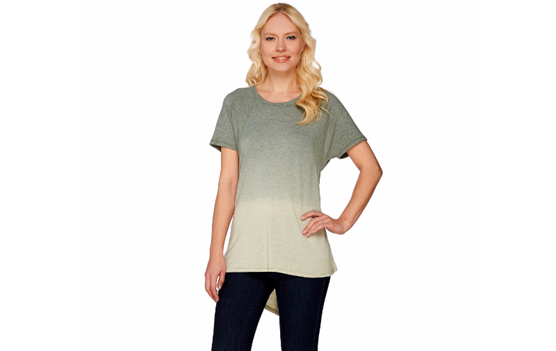 Lisa Rinna Collection Short Sleeve Dip Dyed Knit Top Color : Army Green Size : Large A277305 QVC Fade in and find that this Lisa Rinna dip-dyed top has been plucked from your closet for the featured role in your casual look. Fade out as you carry on with your day in style and comfort. From the Lisa Rinna Collection. Fabrication: knit Features: swing tee, dip-dyed dark to light, U-shaped neckline, dolman short sleeves with front and back seam details, hi-low hem Fit: semi-fitted; follows the lines of the body with added wearing ease Back length: missy length 30-1/8" to 31-3/8"; plus length 32-1/2" to 33-3/4" Content: 78% polyester/17%rayon/5% spandex Care: machine wash, dry flat Imported
