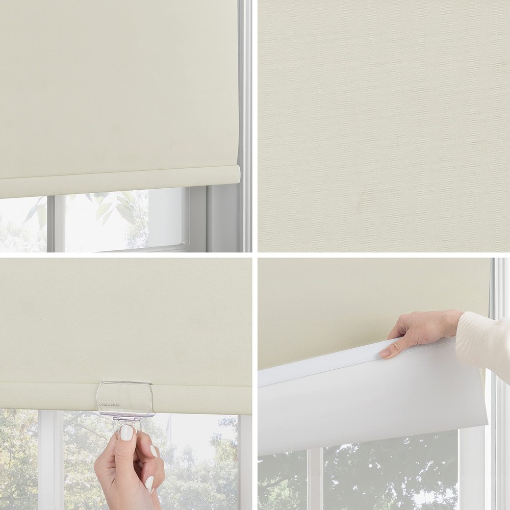 Lodi Textured 100% Blackout Cordless Roller Shades add sophistication and function to your windows. Total Blackout technology is laboratory tested to block out 100% of light, reduce outside noise by up to 50%, and decrease energy lost through your windows by up to 45%. Comfort is optimized with thermal properties that help keep summer heat and winter chill out of your home. Best for Certified cordless design with included handle pull for easy adjustment. Use in your entertainment room to eliminate screen glare and reduce distracting outside noise, or in your bedroom for enhanced privacy and a sounder, more uninterrupted sleep. Mounting hardware included for inside or outside mount as desired. Sold as individual panels measuring 27" width by 72" length in color cream. Measure carefully before selecting your desired size and quantity. Rod not included. Pull shade down until fully extended. Spot clean with a nonabrasive soft damp cloth. Rinse out cloth thoroughly as needed while cleaning. Leave shade fully extended until completely dry. Blackout technology blocks out 100% of light Energy Saving design reduces window energy loss by up to 45% Up to 50% noise reduction helps you get a sounder, more uninterrupted sleep Thermal properties help regulate the temperature of your home Certified Best for cordless control with included handle pull for easy adjustment