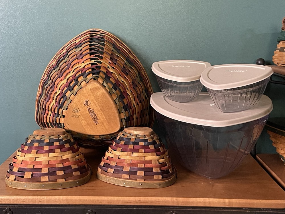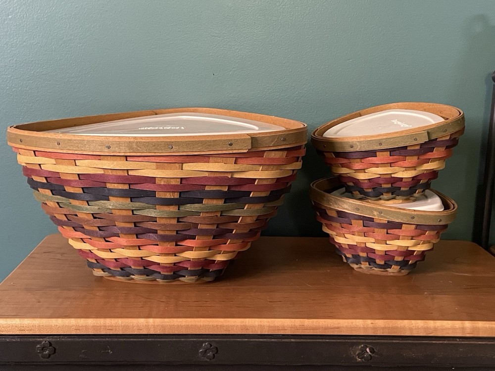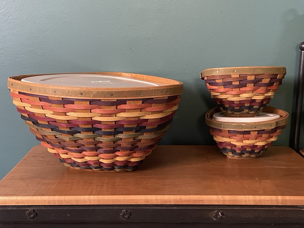 Large and 2 small longaberger fiesta basket sets with hard lidded protectors** Bonus small set included These have only been stored, never used Smoke free pet friendly home
