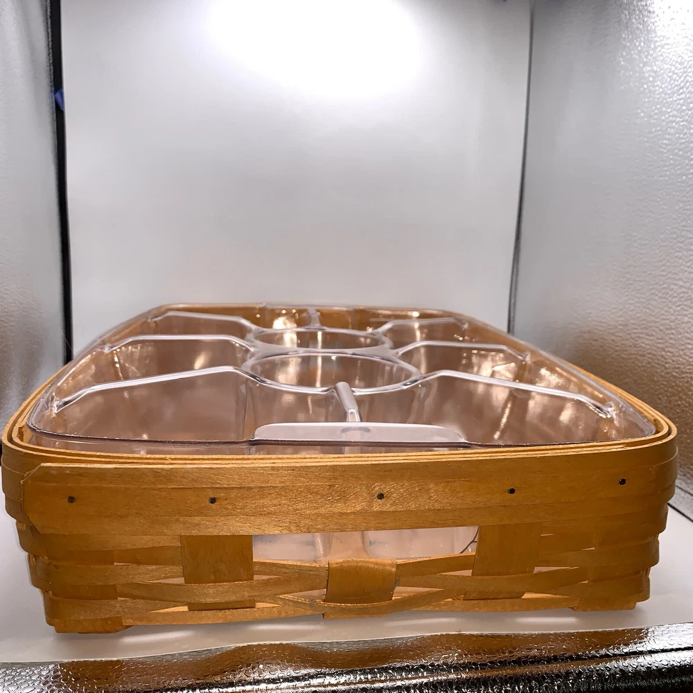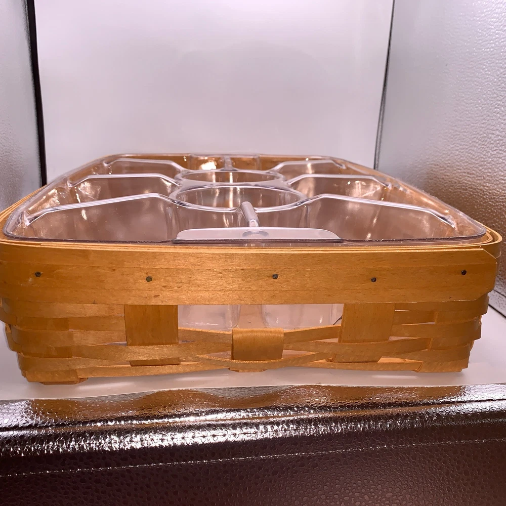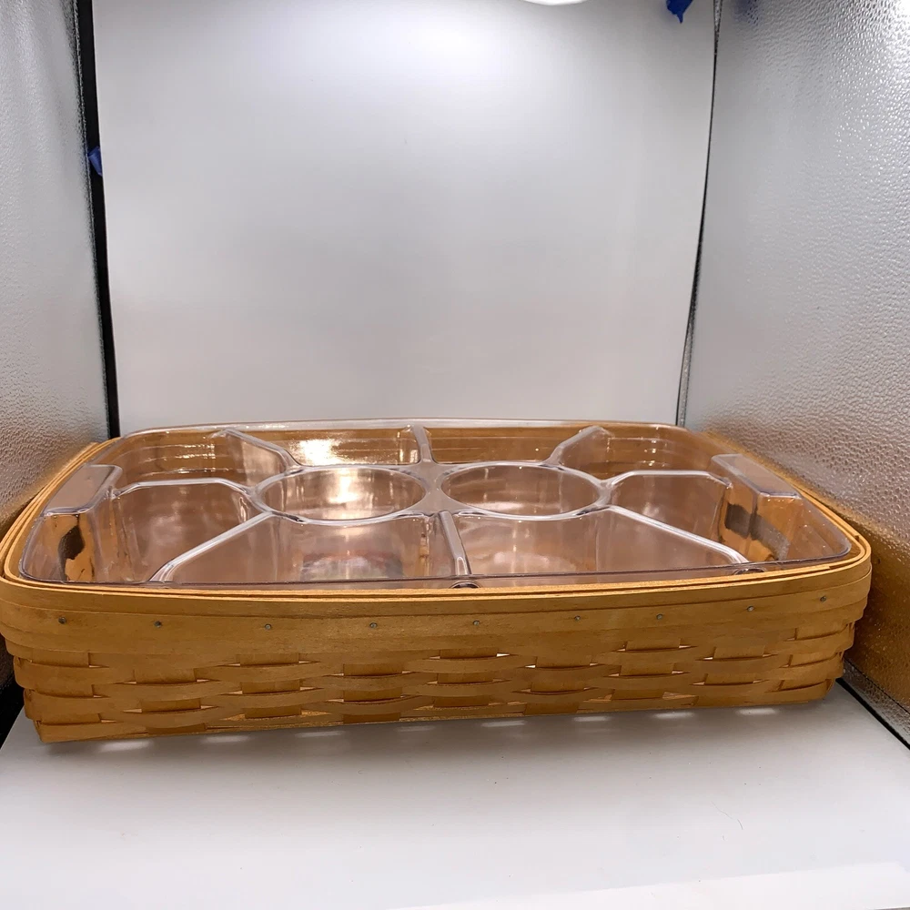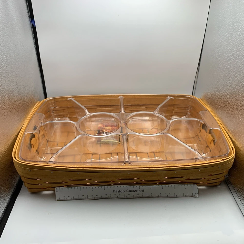 This beautiful Longaberger chip-dip basket is a must-have for any collector or hostess. Made from high-quality, sturdy wood, this large rectangular basket features a woven pattern and a stained finish that will complement any decor. The basket comes with two plastic liners and a divider, making it easy to keep your chips and dip separate from other snacks. With its easy-care instructions and durable construction, this Longaberger basket is perfect for any occasion, whether you're using it to serve snacks or as a decorative piece in any room. Add this original, retired piece to your collection today and enjoy its timeless charm for years to come.