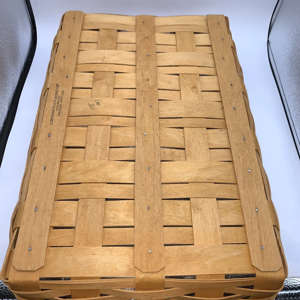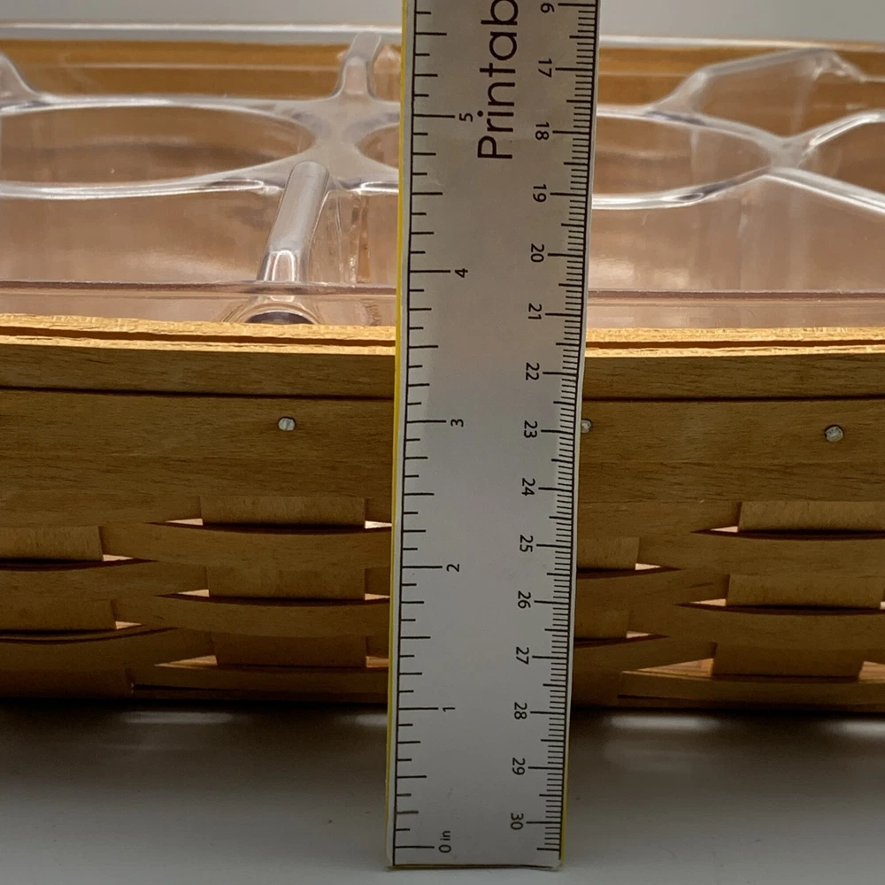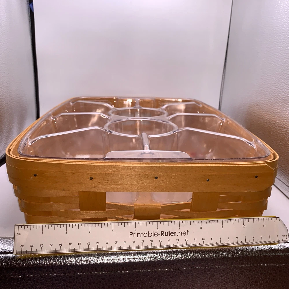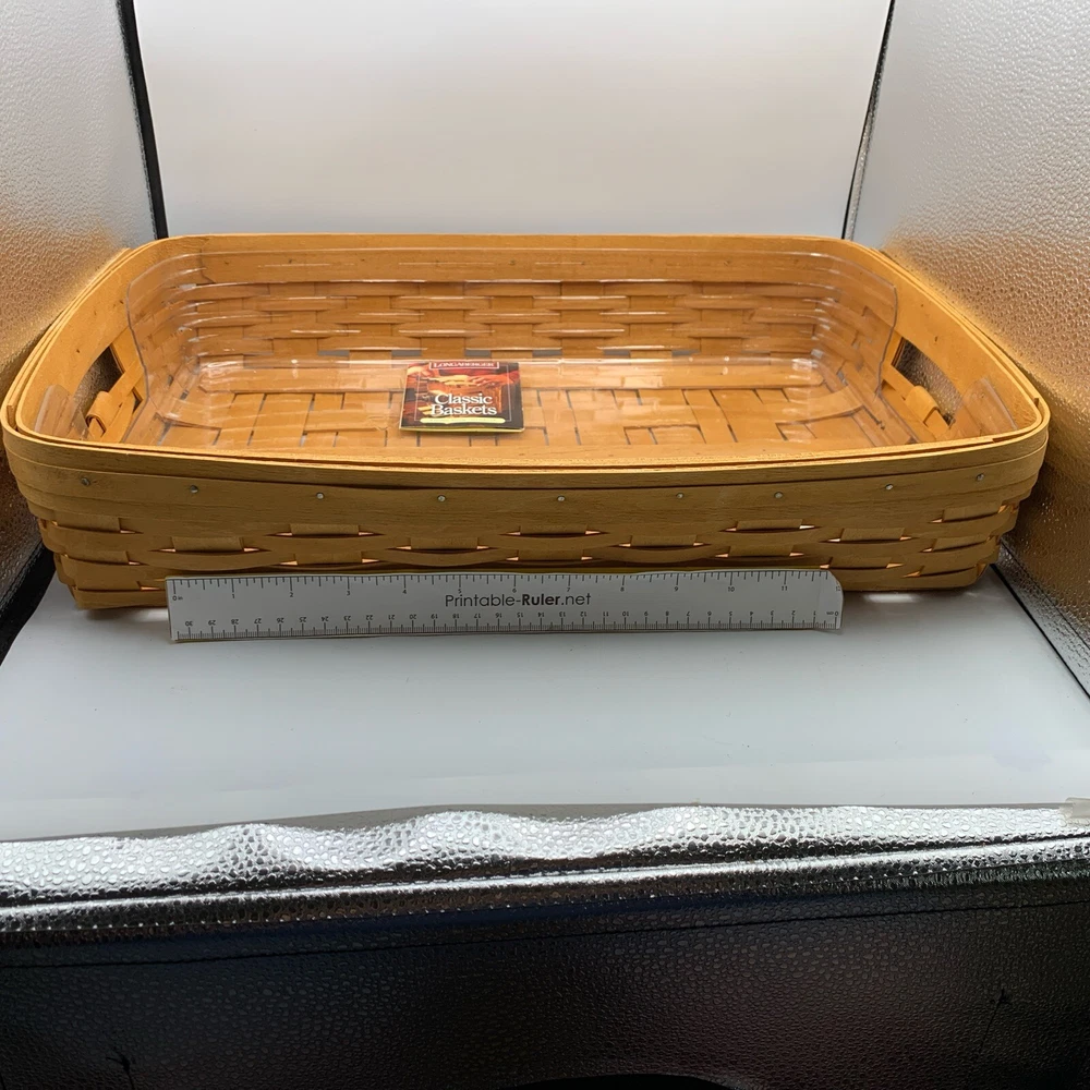 This beautiful Longaberger chip-dip basket is a must-have for any collector or hostess. Made from high-quality, sturdy wood, this large rectangular basket features a woven pattern and a stained finish that will complement any decor. The basket comes with two plastic liners and a divider, making it easy to keep your chips and dip separate from other snacks. With its easy-care instructions and durable construction, this Longaberger basket is perfect for any occasion, whether you're using it to serve snacks or as a decorative piece in any room. Add this original, retired piece to your collection today and enjoy its timeless charm for years to come.