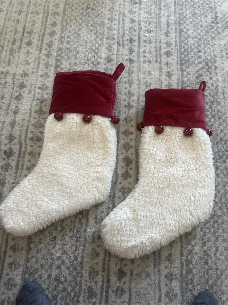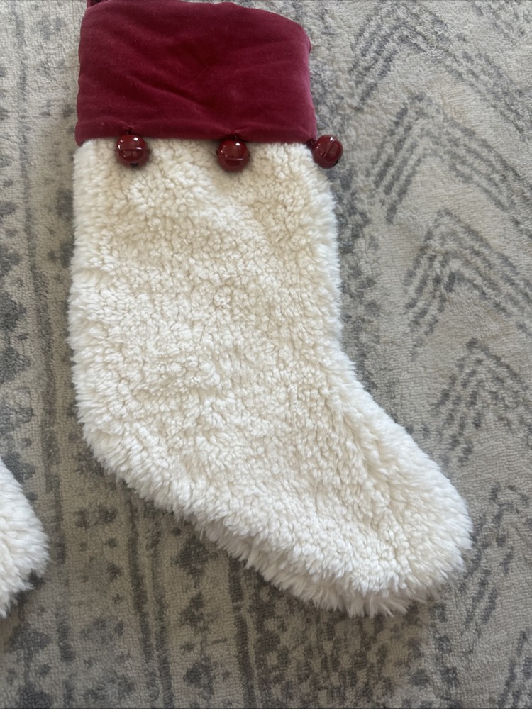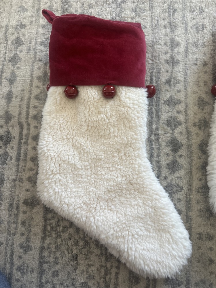 Elevate your holiday decor with this luxurious pair of Pottery Barn Red Velvet Cream Sherpa with Bells Stockings. Crafted from soft velvet and cozy fleece, these medium-sized stockings are adorned with festive bells, adding a touch of whimsy to your Christmas mantle. The solid red color is both classic and chic, ensuring they complement any holiday theme. Designed for hanging and perfect for the occasion, each set includes two intricately detailed stockings that are sure to be a conversation starter. Whether you're adding to your collection or starting anew, these rare finds from the 2010-2019 era bring a unique elegance to your seasonal celebrations. E5