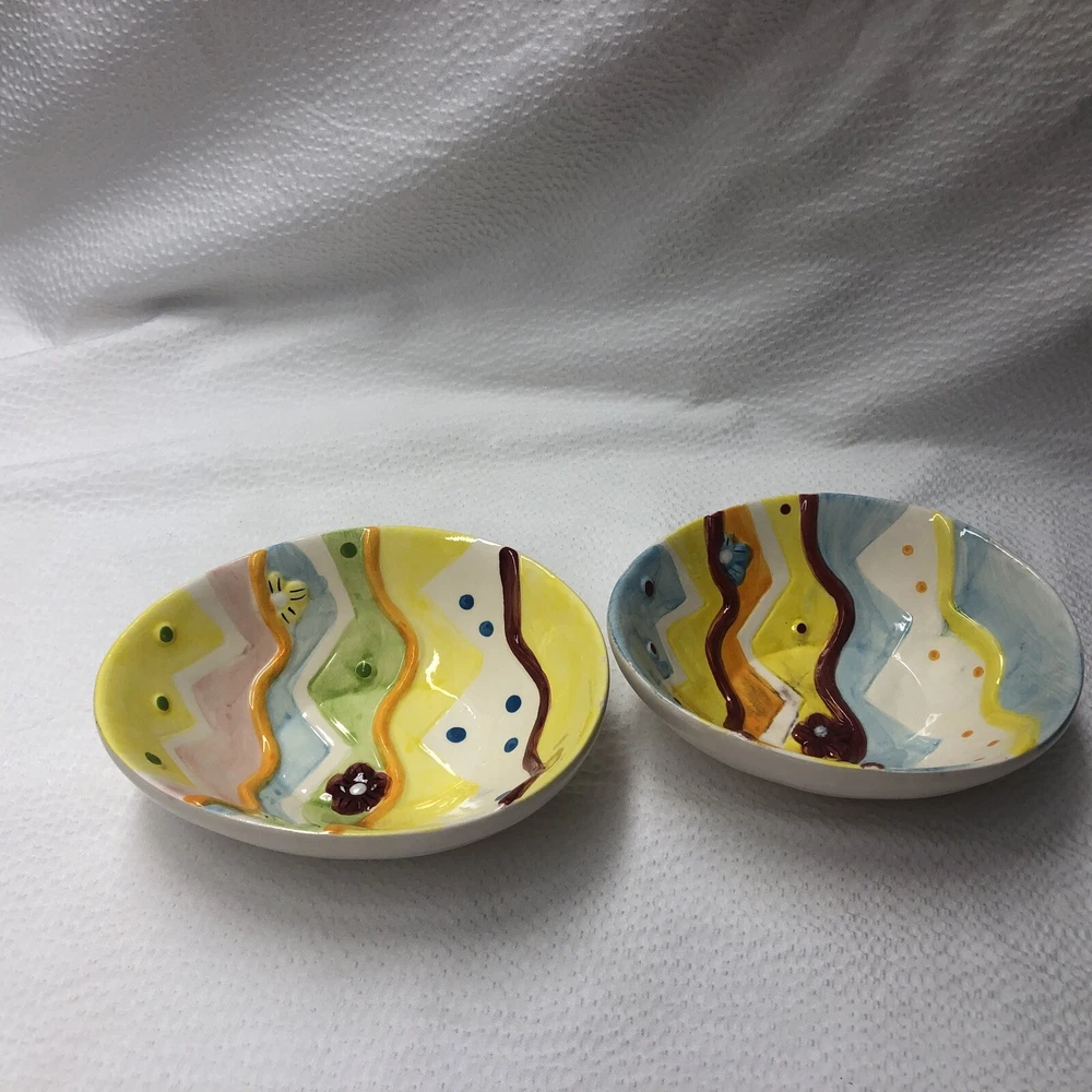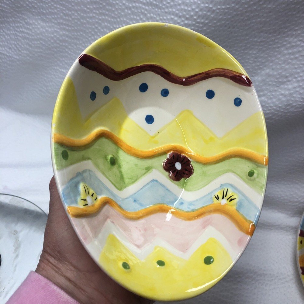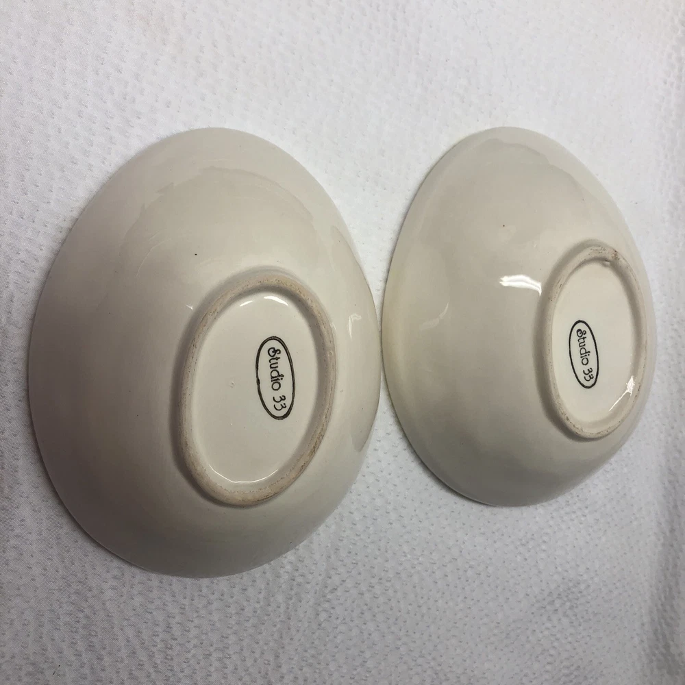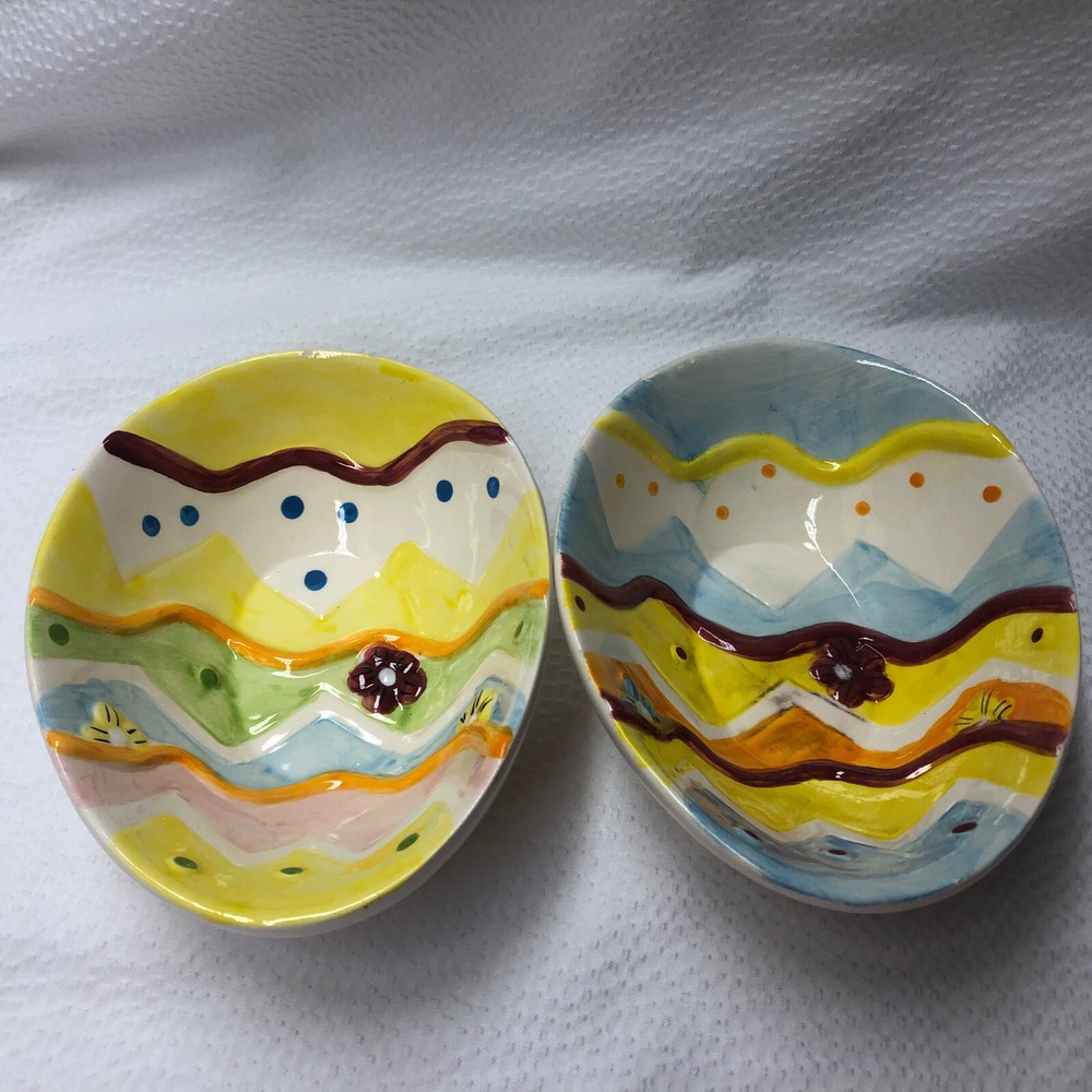 Lot Of 2 Studio 33 Hand Painted Decorated Spring Colored Easter Egg Shaped Bowls. Beautiful little bowls in a egg shaped. In good used condition without cracks. One has a spot where paint is chipped and some grazing underneath. The other is in good condition. Please see pictures as part of description. It measures approximately 5 3/4” long by 4 1/2” wide by 2” high. Thank you for looking. See my other listings. I will gladly combine shipping. Have a blessed day.