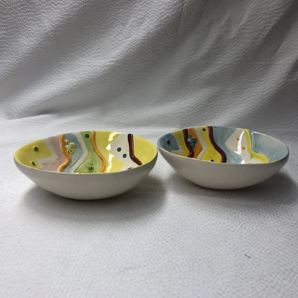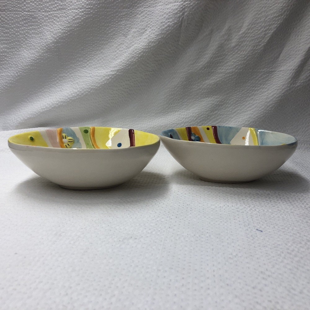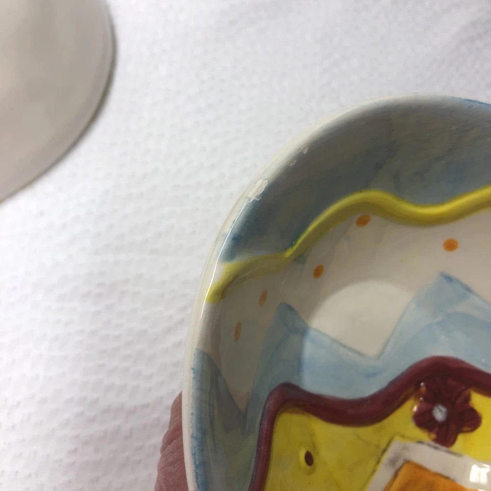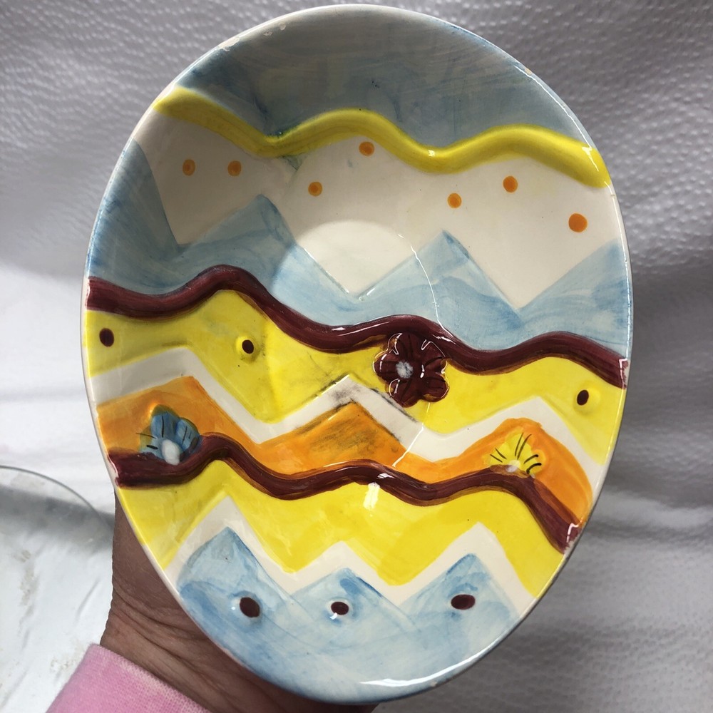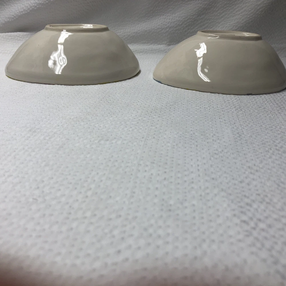 Lot Of 2 Studio 33 Hand Painted Decorated Spring Colored Easter Egg Shaped Bowls. Beautiful little bowls in a egg shaped. In good used condition without cracks. One has a spot where paint is chipped and some grazing underneath. The other is in good condition. Please see pictures as part of description. It measures approximately 5 3/4” long by 4 1/2” wide by 2” high. Thank you for looking. See my other listings. I will gladly combine shipping. Have a blessed day.