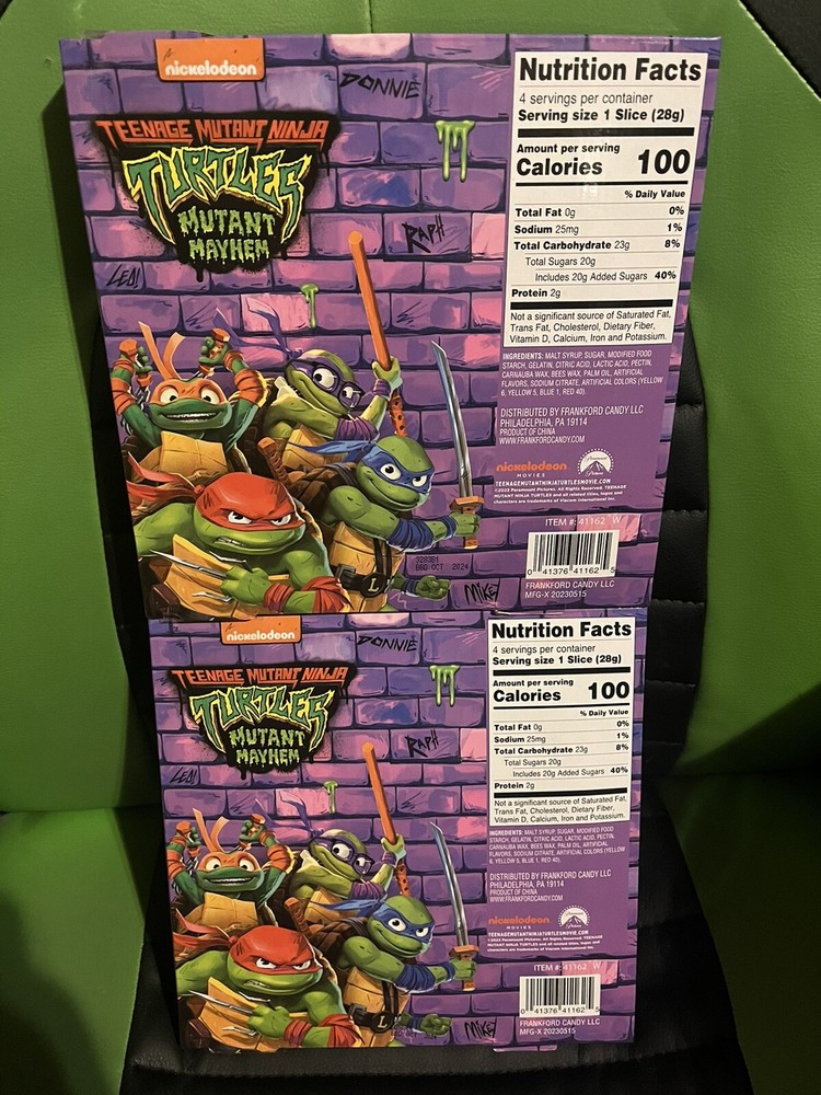Indulge in some pizza-loving fun with this set of 2 Teenage Mutant Ninja Turtles Mutant Mayhem pizza-shaped plate sets. Each set includes 1 pizza plate and 4 gummy pizza slices, perfect for any TMNT fan. These plates feature Leonardo, Raphael, Donatello, and Michelangelo and are produced by FRANKFORD / NICKELODEON COMPANIES, making them an original and licensed reproduction. The TMNT Mutant Mayhem Pizza Plate Gift Set is the perfect addition to any collection, with its multicolor design and Turtle-themed features. Manufactured in the United States in 2023, these gift sets are brand new and come boxed. Perfect for any occasion, this is a must-have for any TMNT enthusiast.