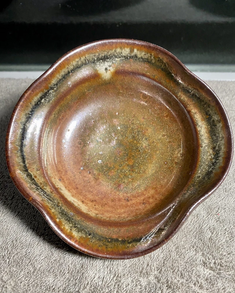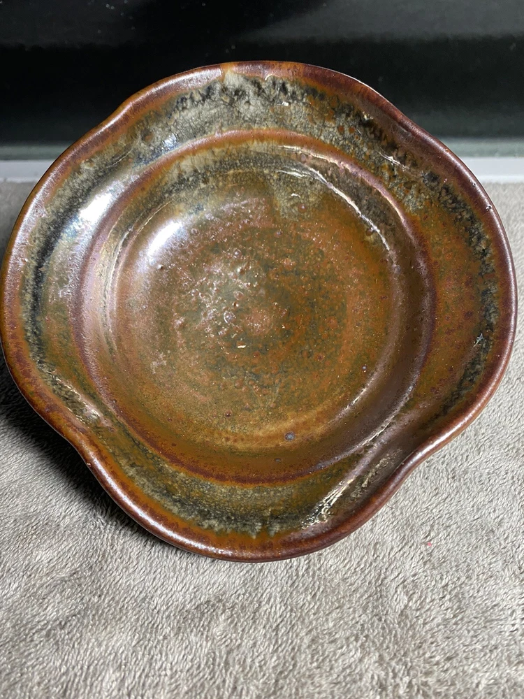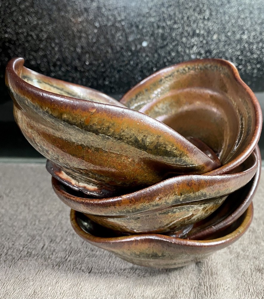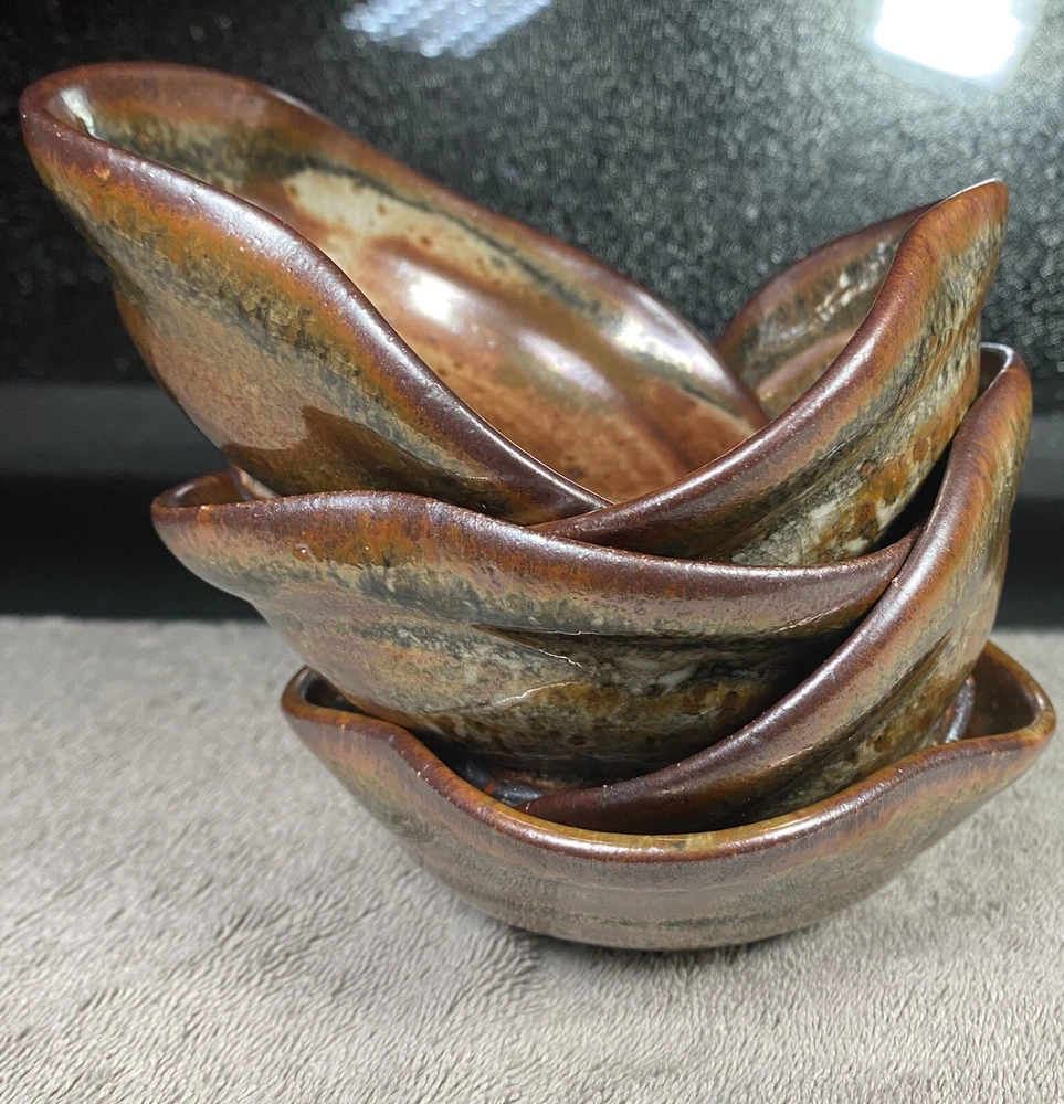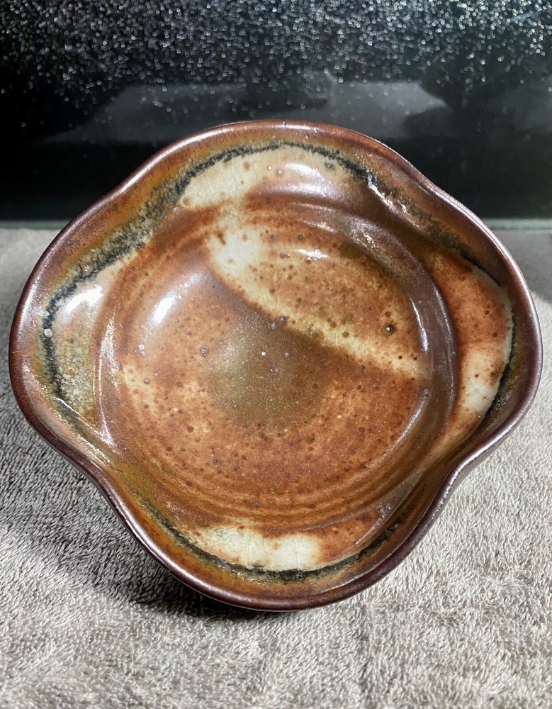 This listing is for a lot of 5 rare vintage mid-20th century Japanese tenmoku glazed lotus shaped bowls. The characteristic black, reds, browns and yellow of the tenmoku glazes offer subtle depth to these elegant modernist pieces. Each measures approximately 2.5” high x 5” diameter and weigh approximately 280 grams each. They are gently used with wear consistent with age and use; and are signed on the base. We appreciate your careful review of the photos as they tell so much more than we can articulate; and ask that you zoom in for a closer look at any and all condition issues. We welcome questions and encourage you to ask before reaching a buying decision. Fixed rate shipping applies to US buyers only. As always, we thank you for taking a moment to consider this piece. And when you have time to browse, we welcome your visit to our EBay store at http://stores.ebay.com/thehuntendshere