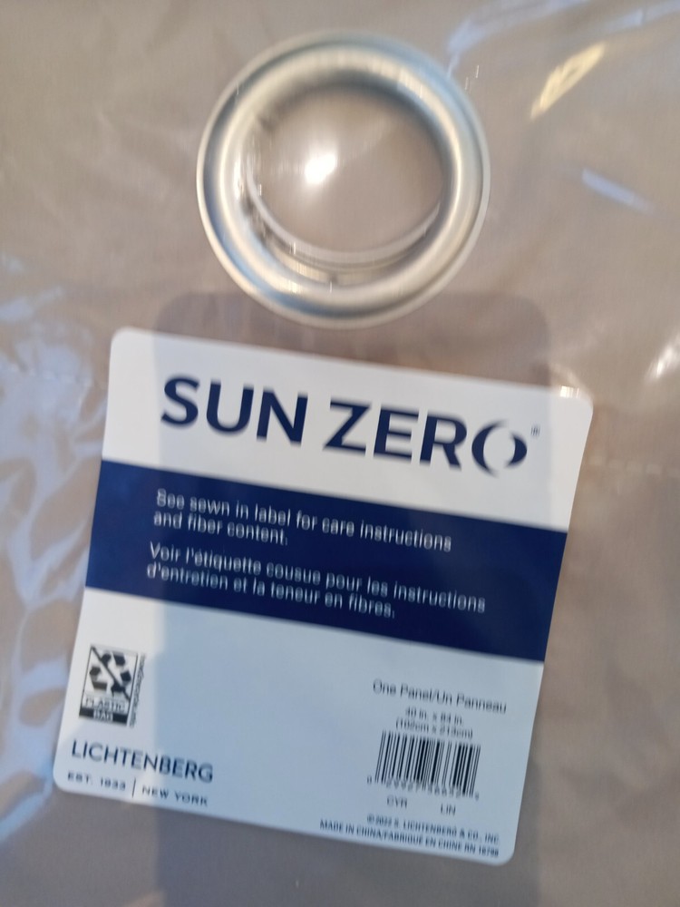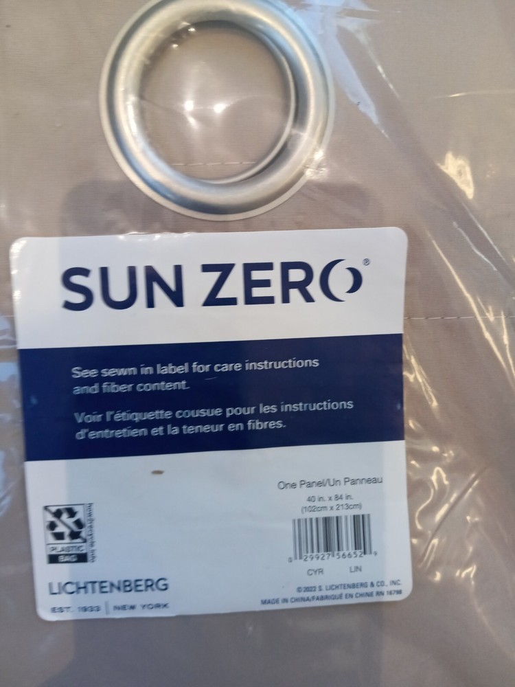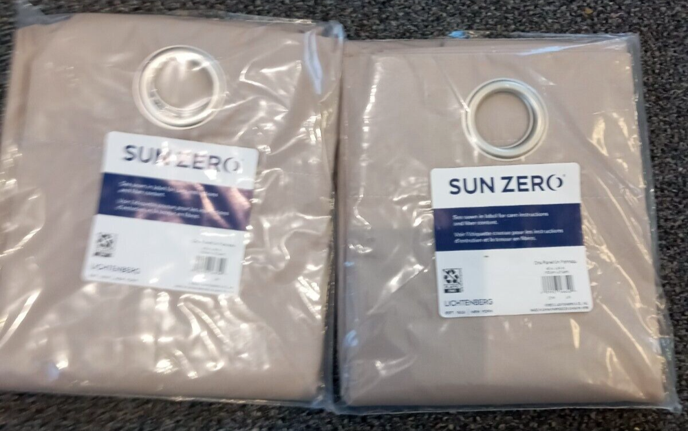The Sun Zero Lichtenberg Curtain set includes two modern style panels in a solid tan color, each measuring 40" x 84". Featuring grommets for easy hanging, these blackout curtains are designed to block out light and provide privacy in a home setting. Manufactured in 2022 by Sun Zero, these lightweight/medium weight panels are a stylish addition to any room in need of window treatment.