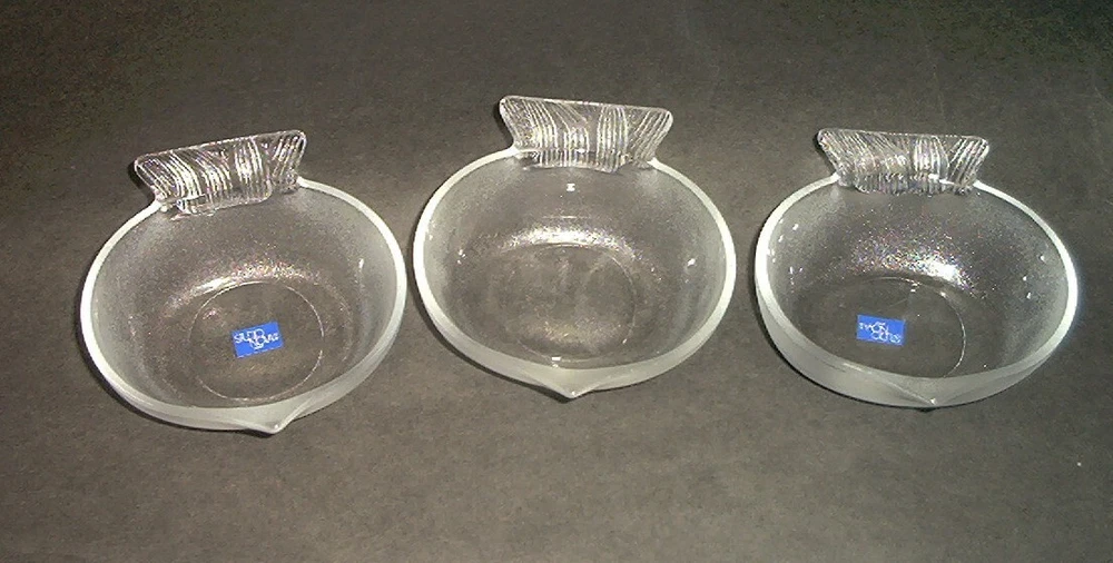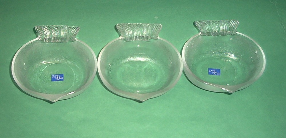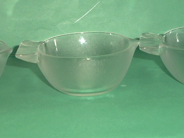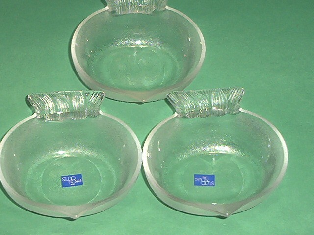 Lot of 4 (one is not shown) Frosted Studio Nova Glass Bowls Nuts Candy Sauce Dishes FISH Shaped. Bowls are new in original boxes. The boxes have some sticker residue and minor tears. Bowls measure approximately 4 1/2" x 4" x 1 1/2" high. Two have the original sticker on them as seen in the above photos. This listing is for 4 bowls, one is not in the photo but it is in new condition with original box like the other three. Buyer pays shipping. Items ship same or next business day once payment is received. BX