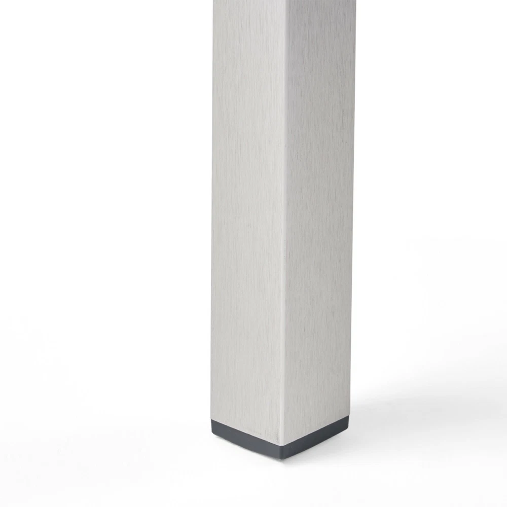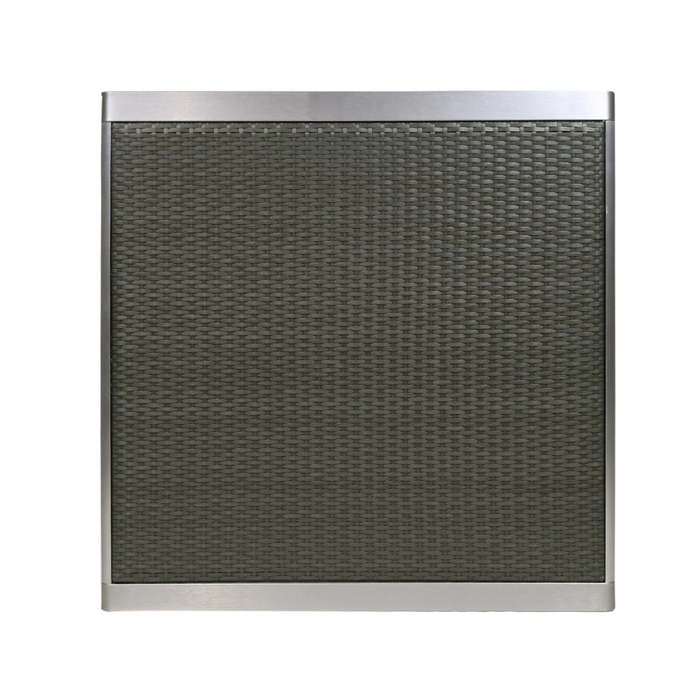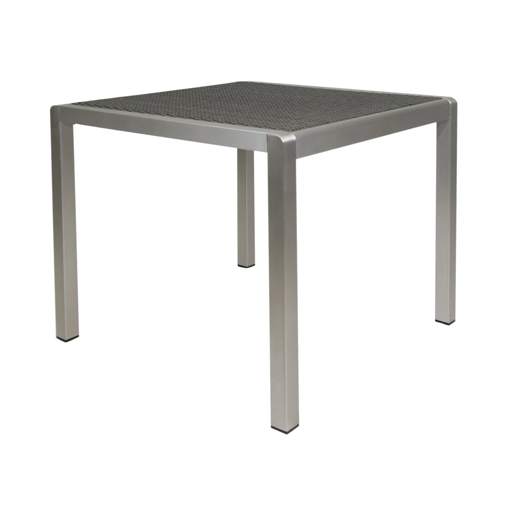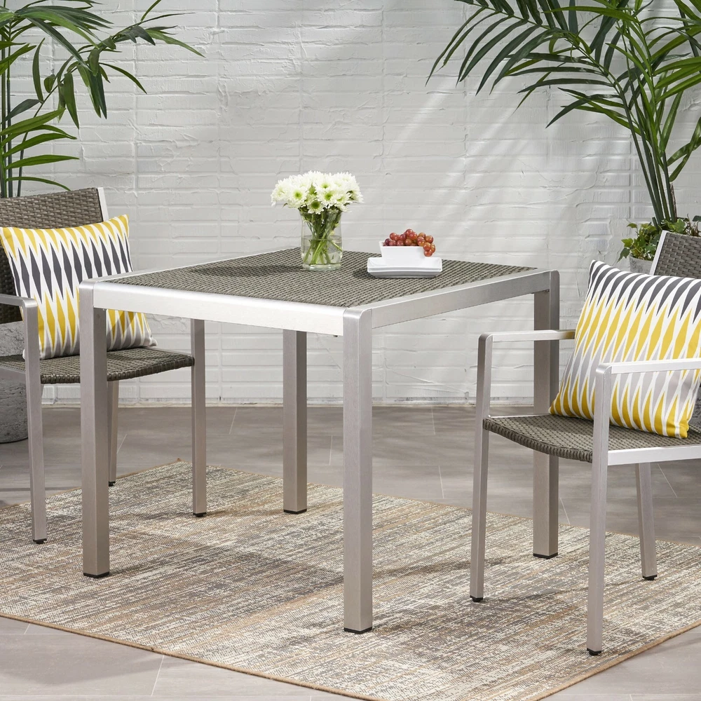 If time and time again you find yourself with a delicious meal and nowhere to set it down upon when dining outdoors, investing in one of our signature square patio dining tables may be just what the doctor ordered. This piece's anodized aluminum frame means it's much more resistant to wear, tear, discoloration, and tarnish than others without; its bold and contemporary presence reinforced with a durable wicker table top will make a statement on your porch or patio that your guests will remember for years to come. Includes: One (1) Dining Table Frame Material: Anodized Aluminum Table Top Material: Polyethylene Wicker Frame Finish: Silver Wicker Finish: Gray Hand-Crafted Details Some Assembly Required Product Dimensions: 35.00 inches deep x 35.00 inches wide x 30.00 inches high