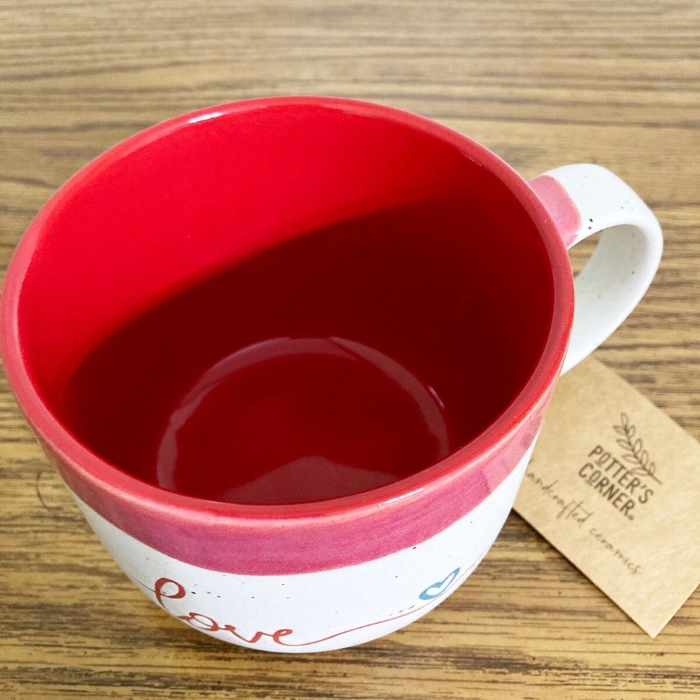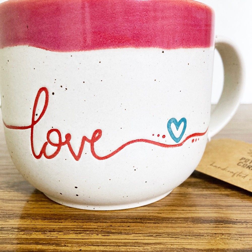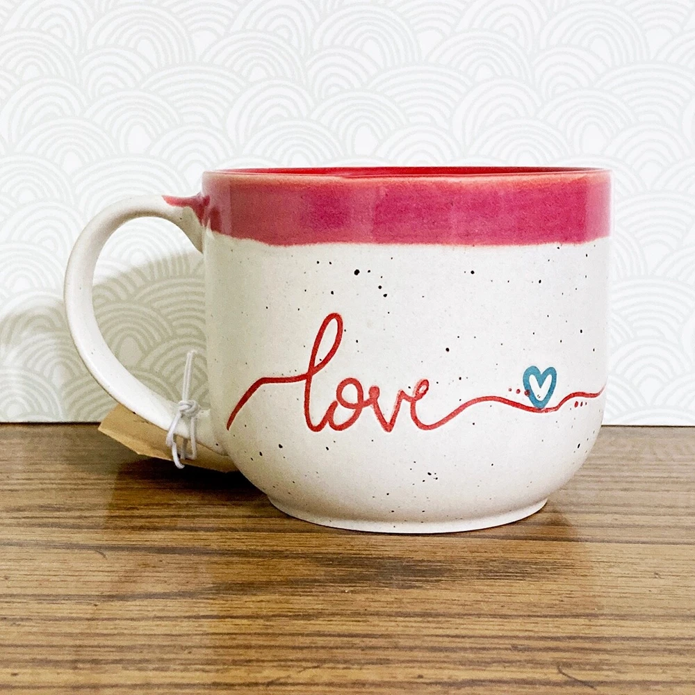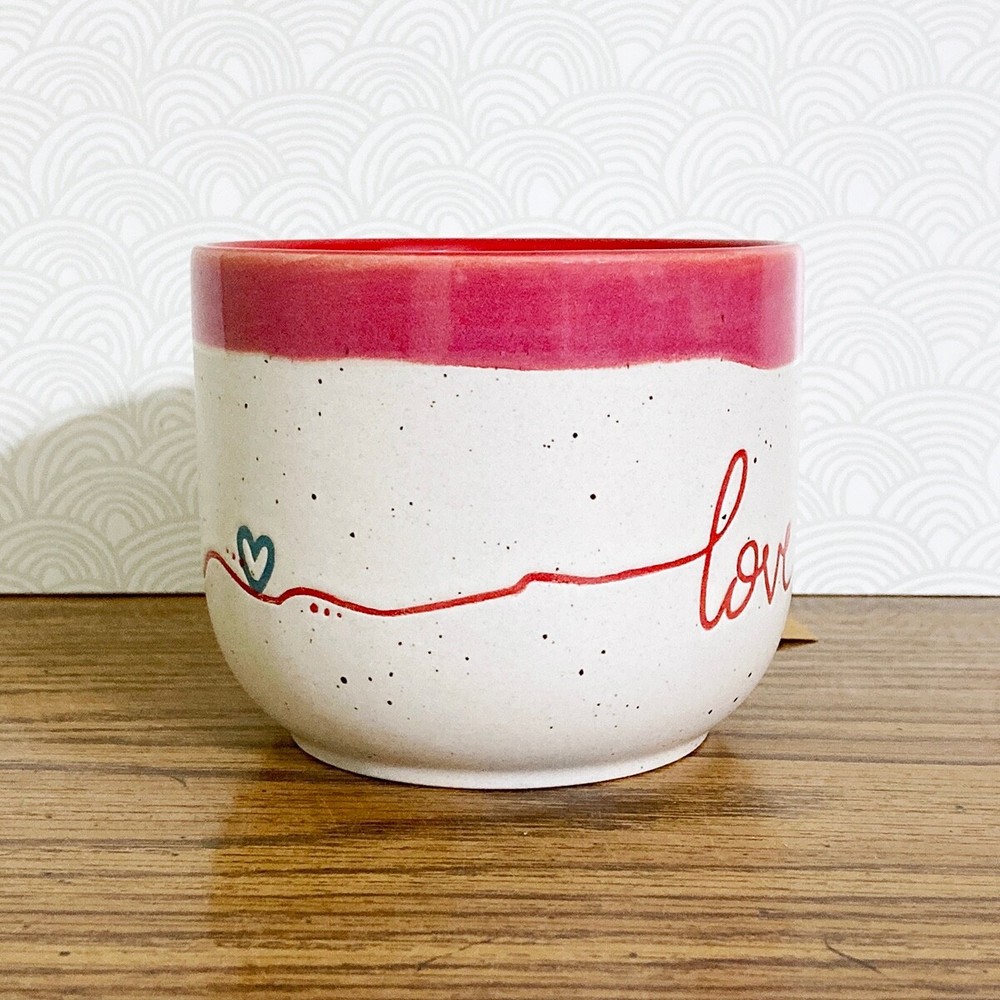 Love coffee mug from Potter's Corner. Hand painted dip dye design with embossed "love" text. Speckled background, contrast red interior. 16 fl oz capacity, approx 3.5"H x 4.25"W. Due to the handcrafted nature, please expect variations between each mug. Nice mug for enjoying a cup of your favorite coffee, tea, cocoa or cider. Makes a great gift, or treat yourself! Please note: Colors may appear different based on your screen settings.