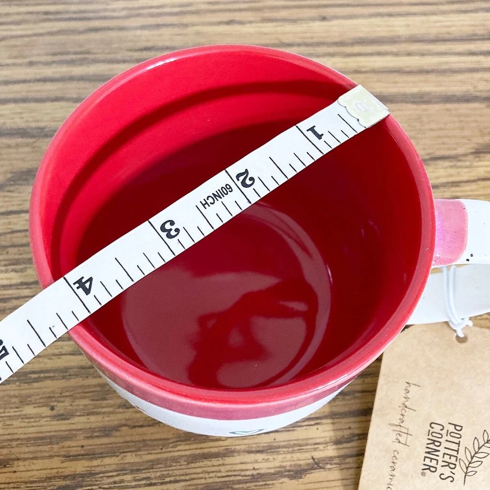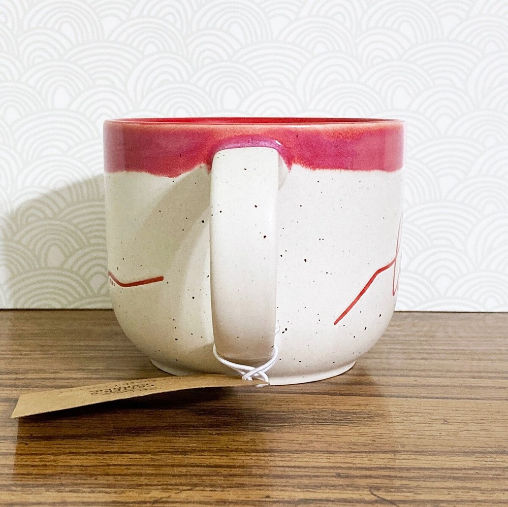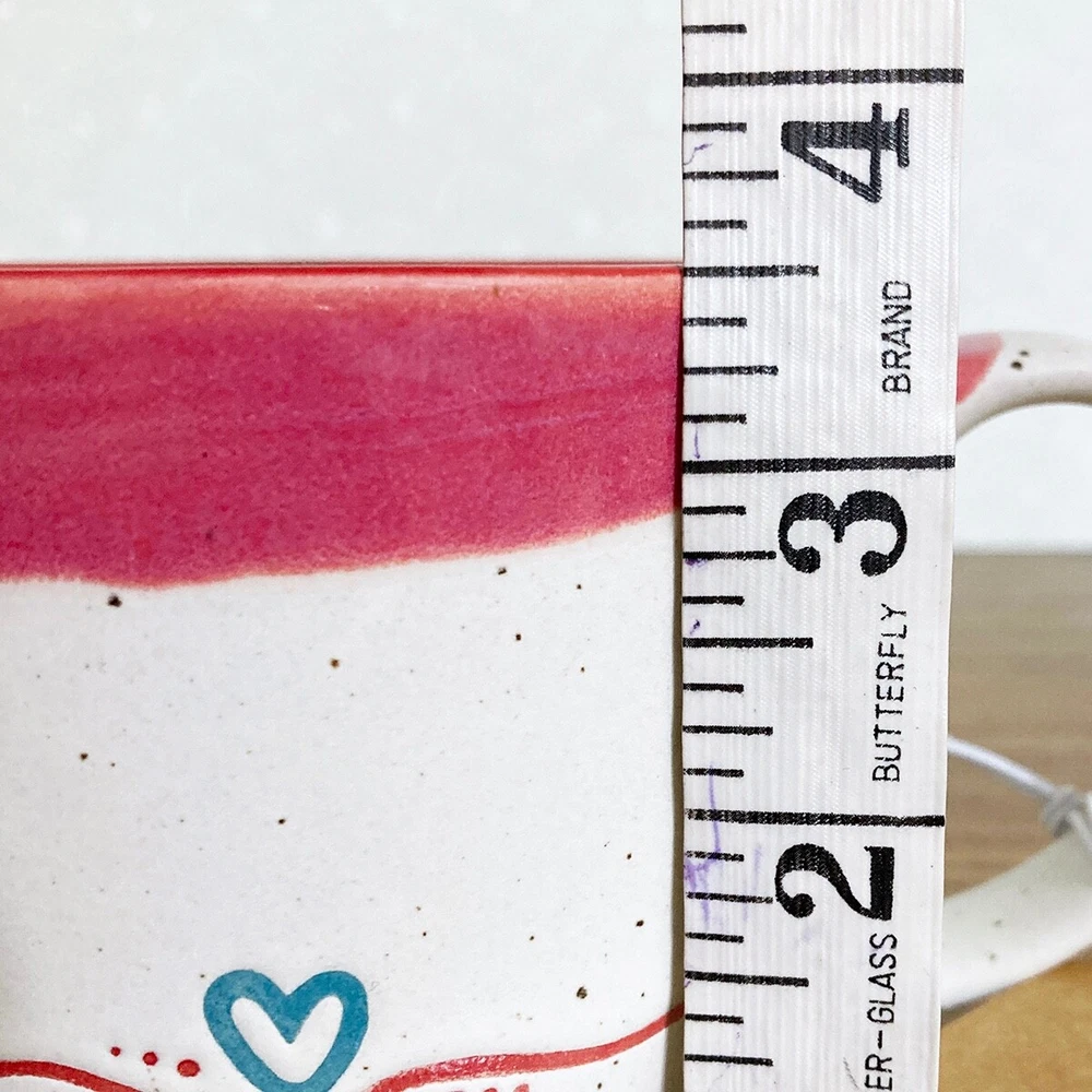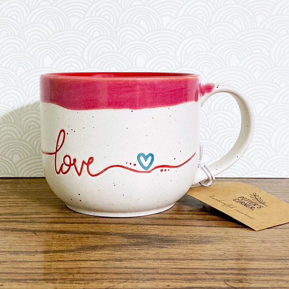 Love coffee mug from Potter's Corner. Hand painted dip dye design with embossed "love" text. Speckled background, contrast red interior. 16 fl oz capacity, approx 3.5"H x 4.25"W. Due to the handcrafted nature, please expect variations between each mug. Nice mug for enjoying a cup of your favorite coffee, tea, cocoa or cider. Makes a great gift, or treat yourself! Please note: Colors may appear different based on your screen settings.
