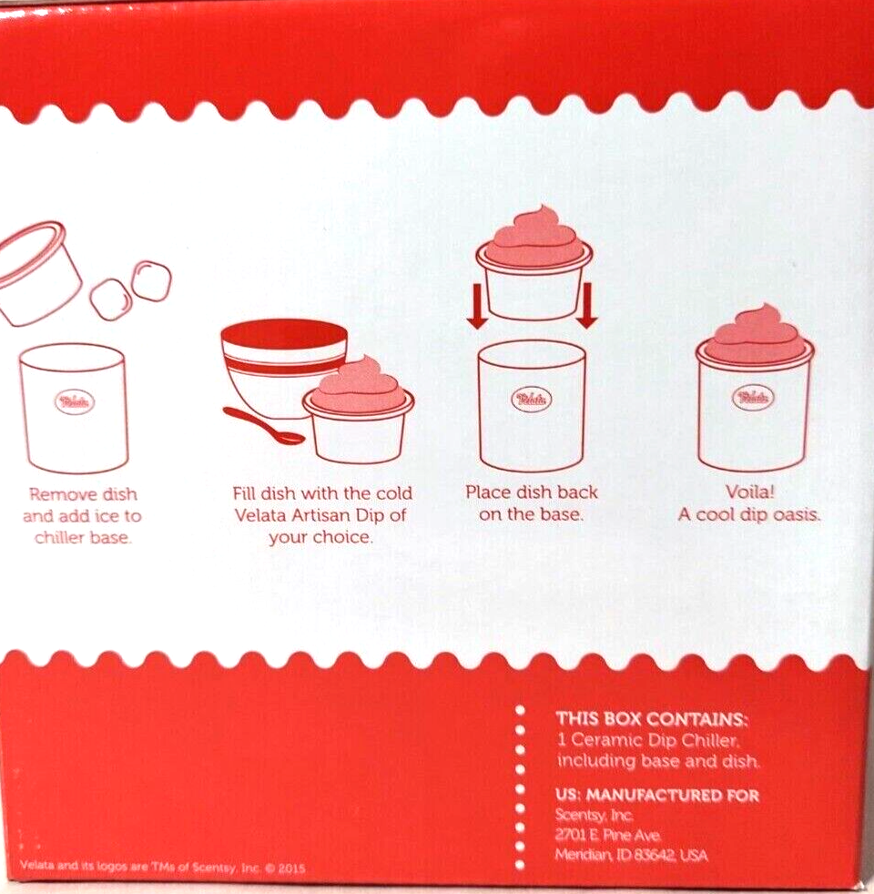 This large ceramic dip chiller ice bucket party snack bowl fondue chip dish is perfect for game night or any gathering. The manual power source allows for easy use and the white color adds a touch of elegance to any tabletop. Measuring 5 inches in diameter, 3 inches in depth, and 5.5 inches in height, this multifunctional fondue set is made of high-quality ceramic and comes with a lid and bowl. The Velata by Scentsy brand dip chiller is designed for easy use and is perfect for any occasion. Its components include a lid and bowl, and it weighs 5 lbs. This fondue set is made in the United States and is a great addition to any kitchen, dining, or bar collection. Ships fast, insured and no returns