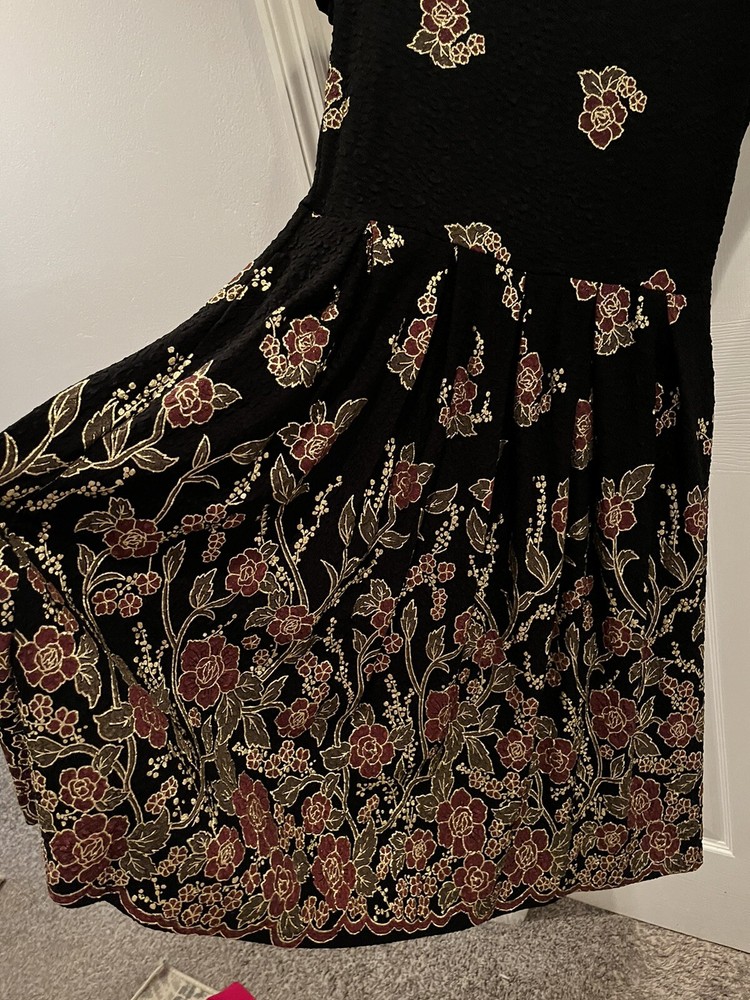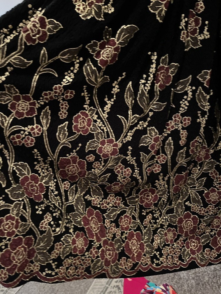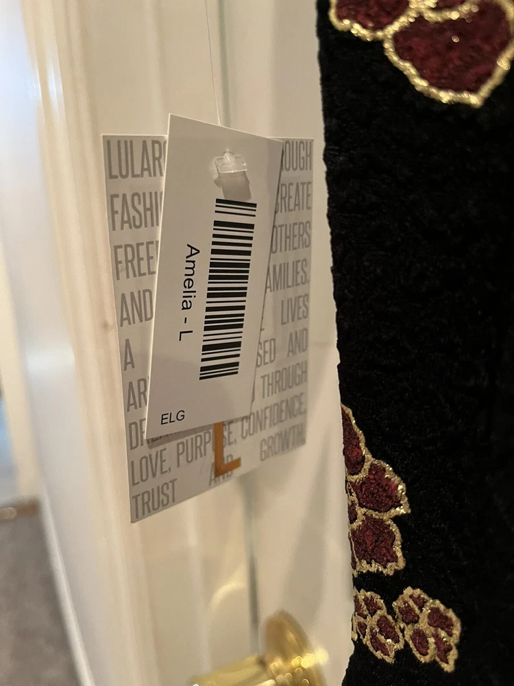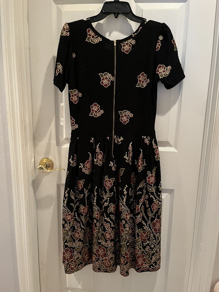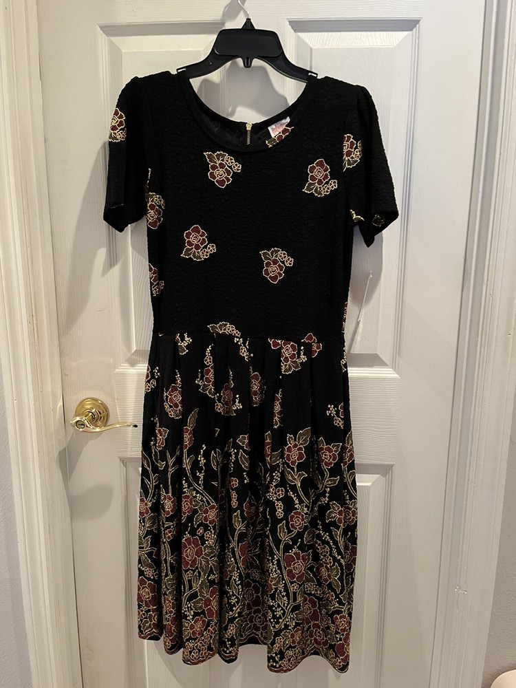 Add elegance to your wardrobe with this stunning LuLaRoe Amelia Dress. The dress features black velvet material with glitter accents, an Empire waistline, and pockets. It comes in a size L, making it perfect for formal occasions. The dress has a midi length, making it suitable for any height. The dress has medallion patterns, silver characters, and a theme of elegant sophistication. It is made of high-quality polyester spandex fabric, ensuring durability and comfort. This LuLaRoe dress is suitable for women of all ages and can be worn on various occasions.