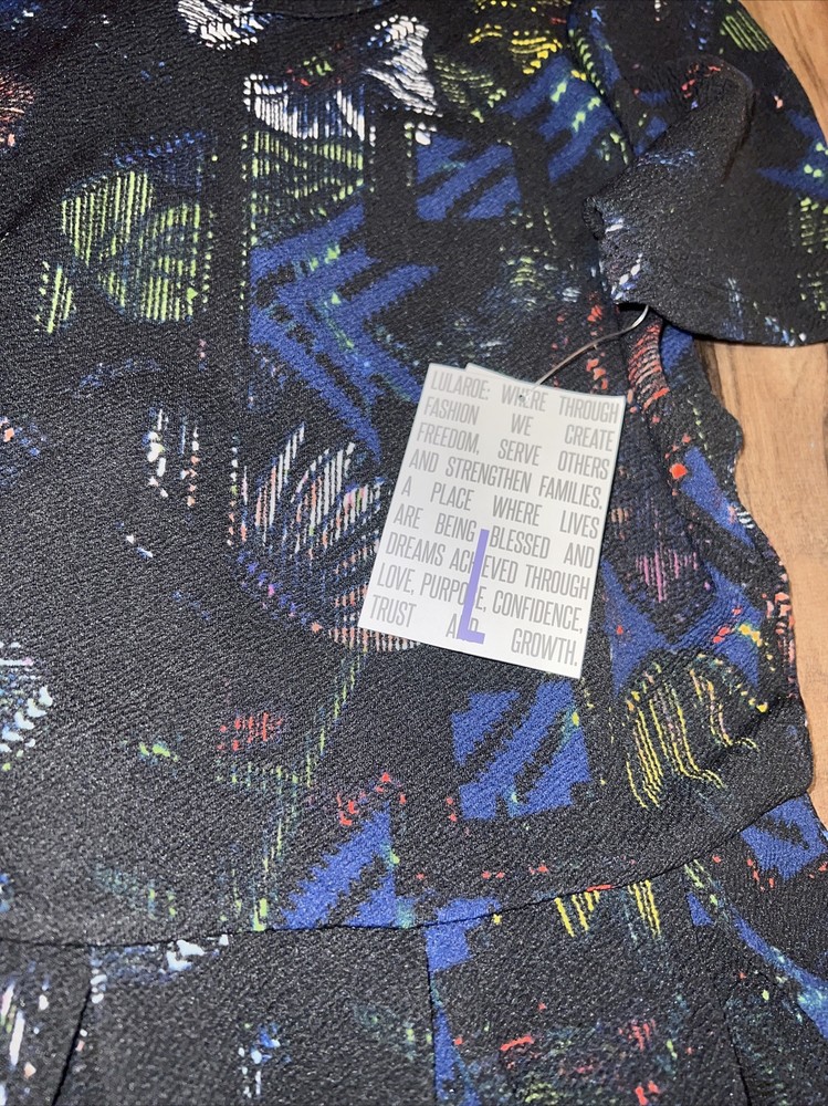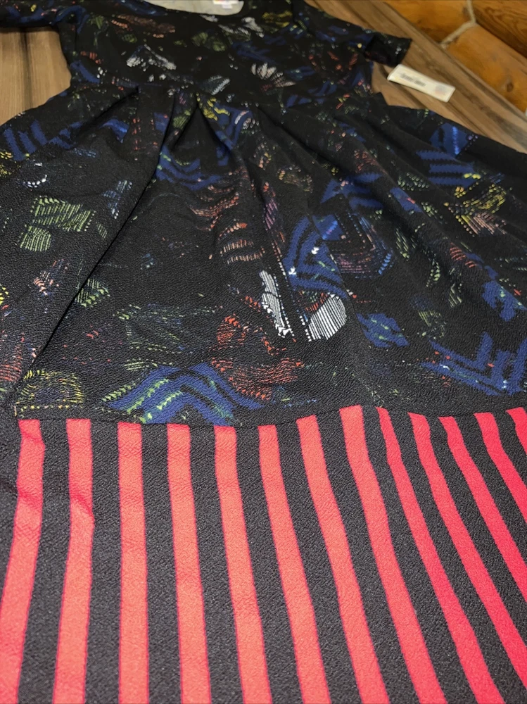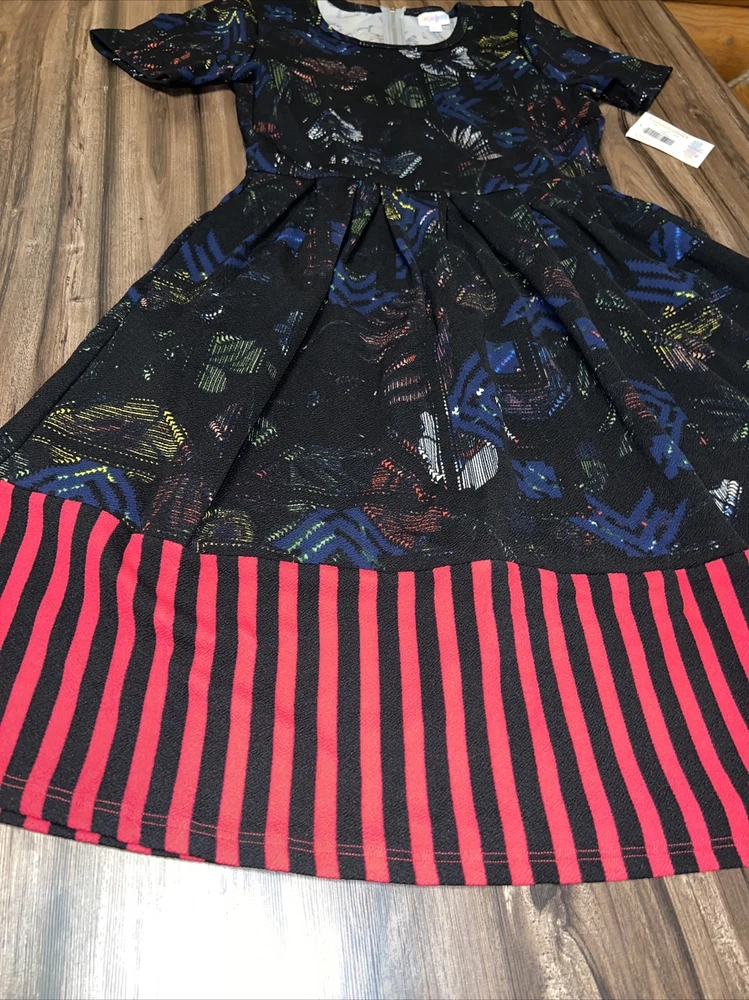 Lularoe NWT Women’s Amelia black/blue background with beautiful Aztec, tribal, Southwest bottom part of the dress is vertical red and black/blue stripes, unique pattern. Beautiful Pleated Dress Condition is New with tags. Shipped with USPS This is for a a size large 14/16 12/14 The Amelia dress' stretchy knit fabric is comfortable enough to let you wear the dress all day while having the structure and tailoring that make it sophisticated enough for the office or a fancy night out. The dress features handset box pleats, giving the dress a flowing, full skirt. And before we forget the best part, this dress also has hidden pockets! This dress is everything a girl needs. BEST PAIRED WITH: RANDY & CLASSIC T We strive to send out items the same day. Please message with questions, thanks! 618/X