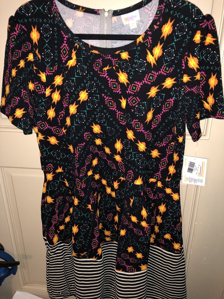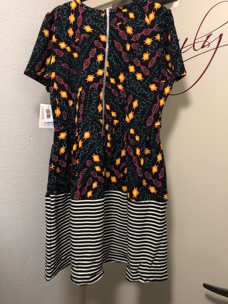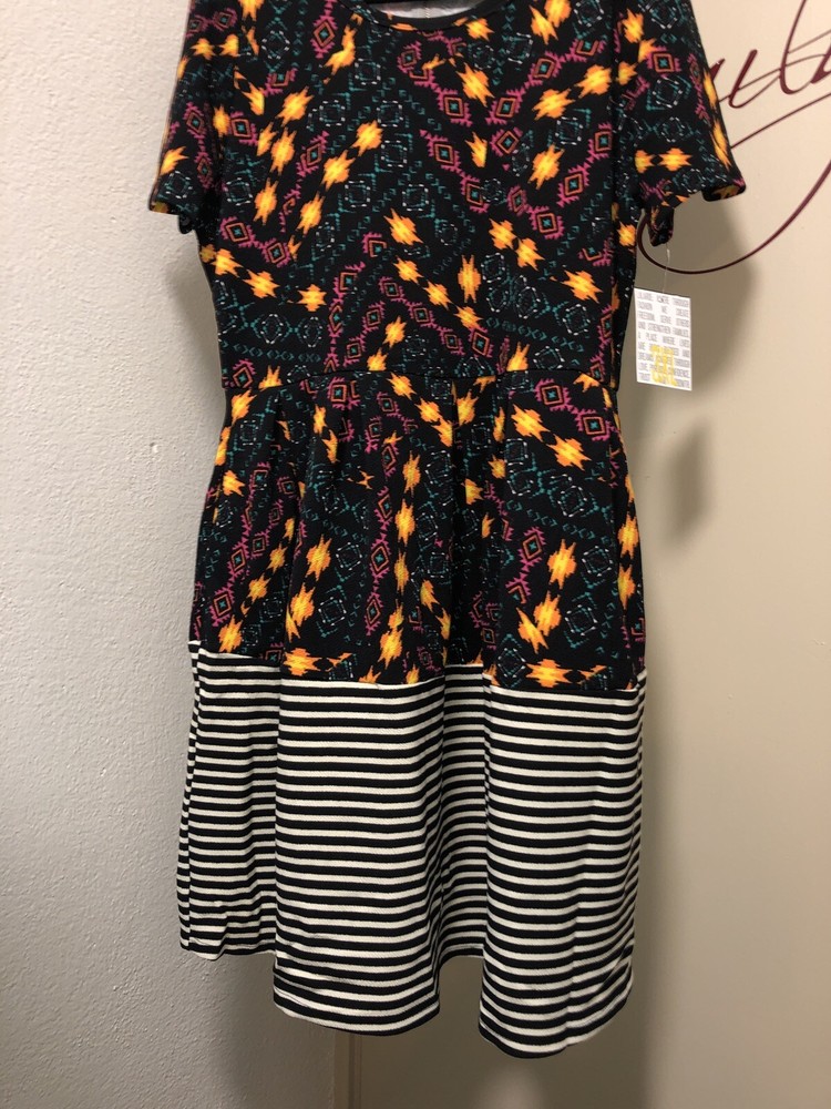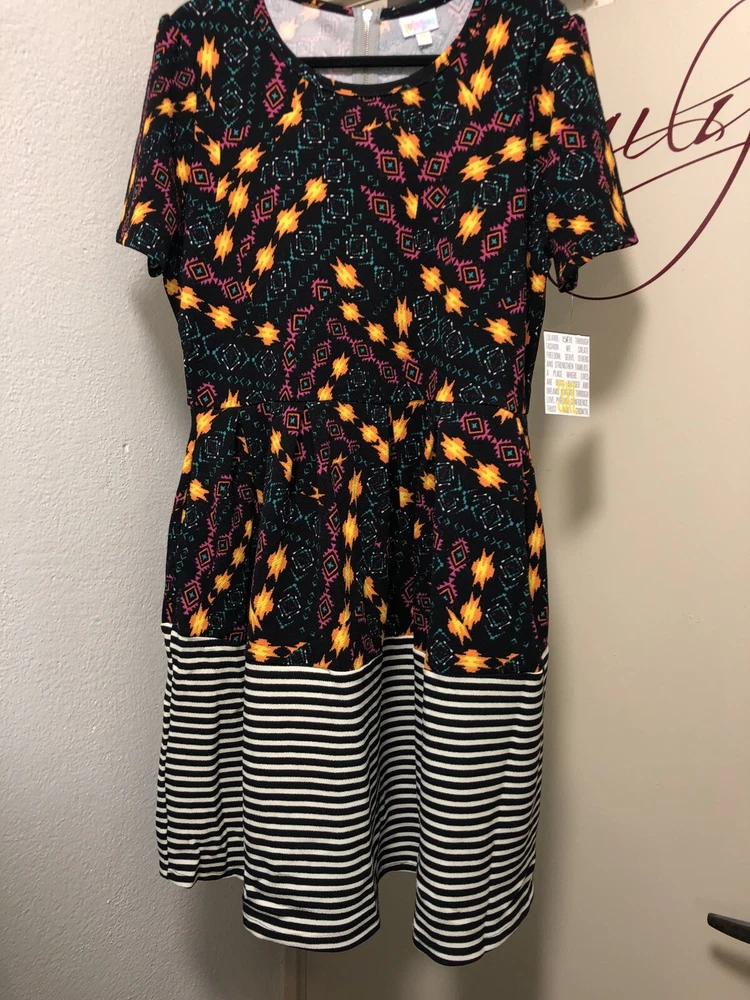 The Amelia dress' stretchy knit fabric is comfortable enough to let you wear the dress all day while having the structure and tailoring that make it sophisticated enough for the office or a fancy night out. The dress features handset box pleats, giving the dress a flowing, full skirt. And before we forget the best part, this dress also has hidden pockets! This dress is everything a girl needs. Lularoe 3XL NWT Women’s Amelia tribal pattern with stripes Beautiful Pleated Dress Condition is New with tags. Shipped with USPS We strive to send out items the same day. Please email with questions, thanks! Hi 820 K