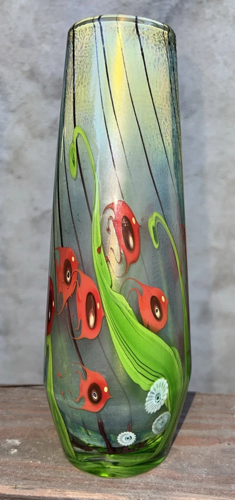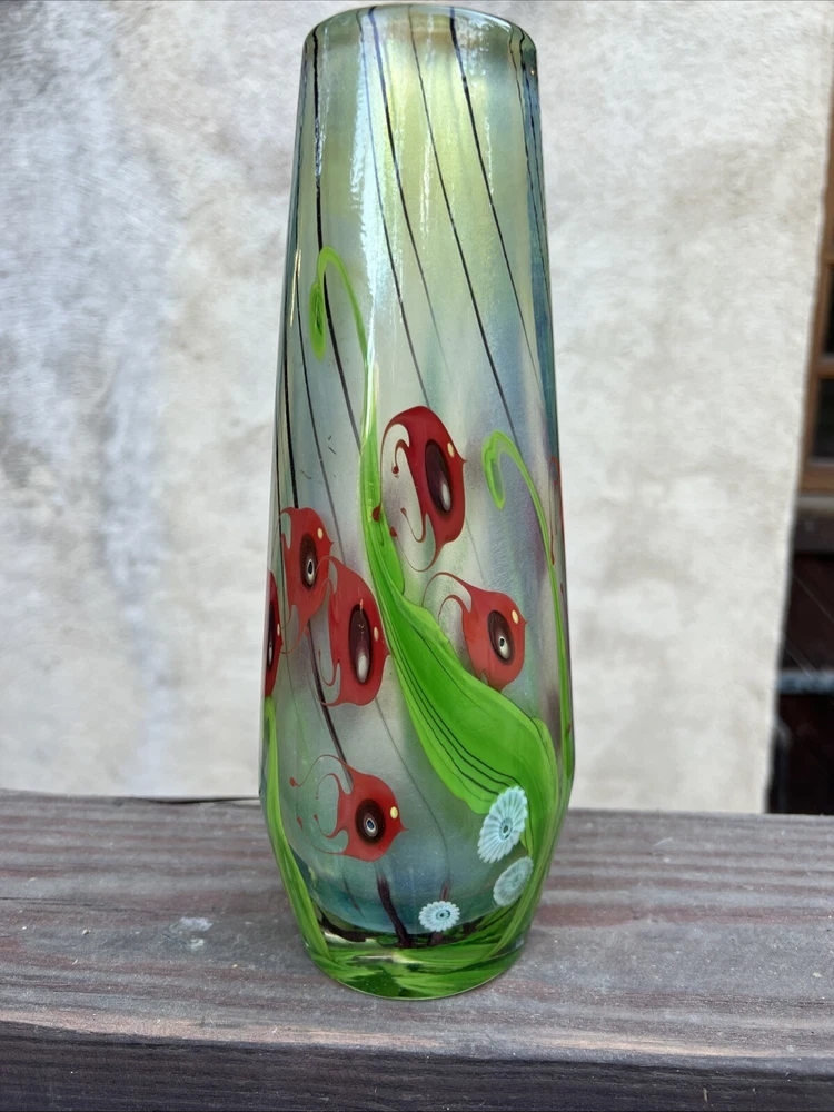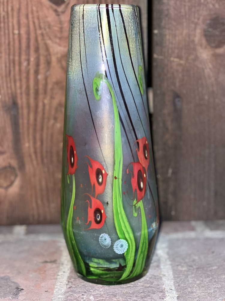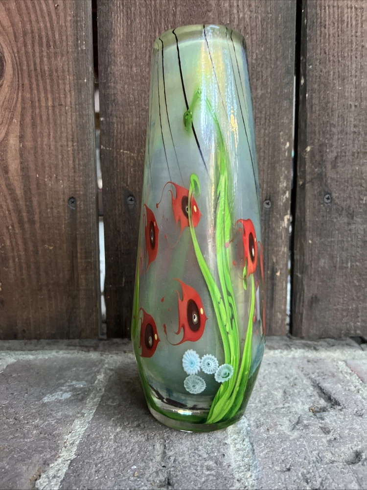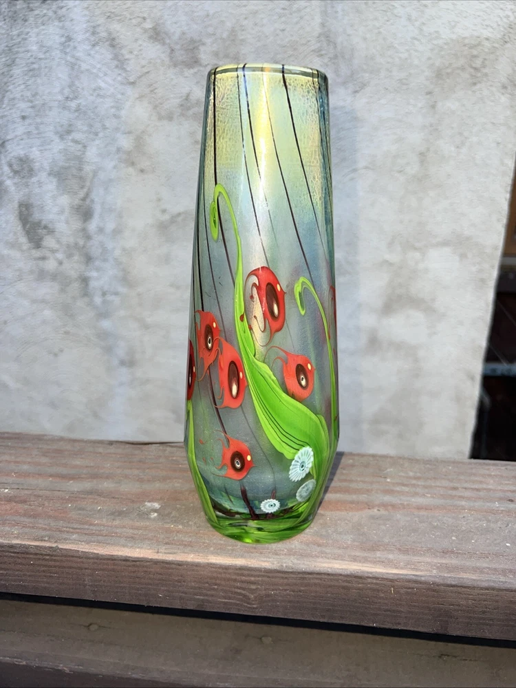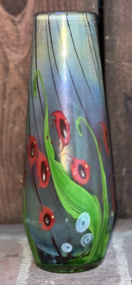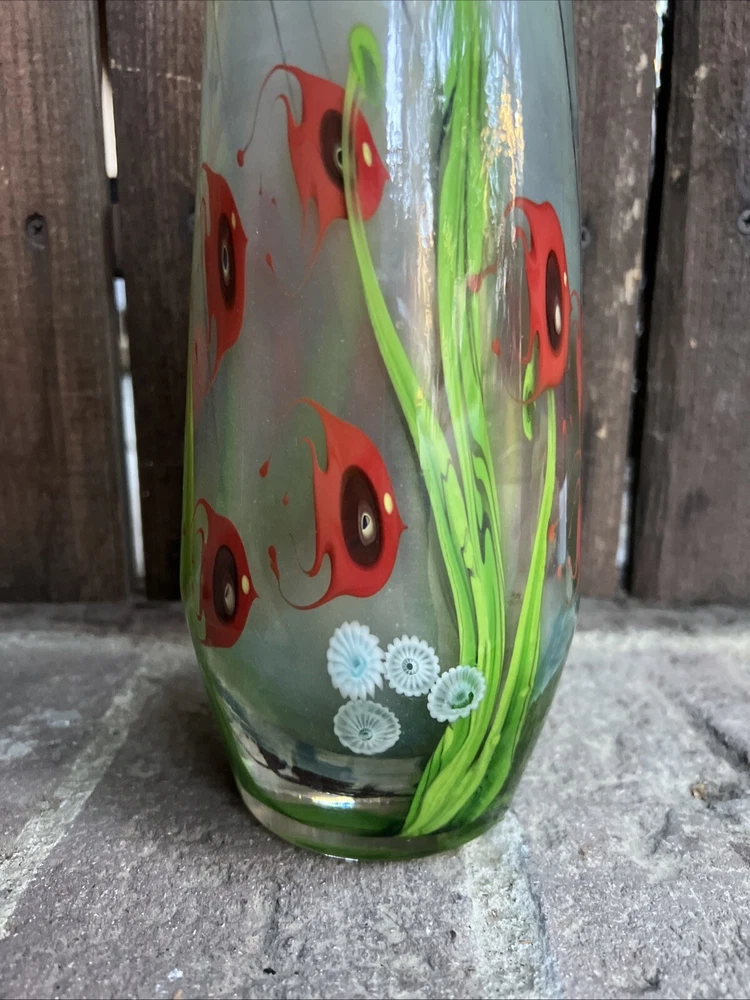 Amazing piece , heavy 6-7 lbs no issues found !This is a vintage Lundberg Studios hand-blown glass vase from 1977. It features double wall multicolor art design of an angel fish The 10-inch vase is signed Lundberg Studios 1977 Made in California, USA, this original piece showcases intricate art glass production techniques, making it a unique and collectible item.