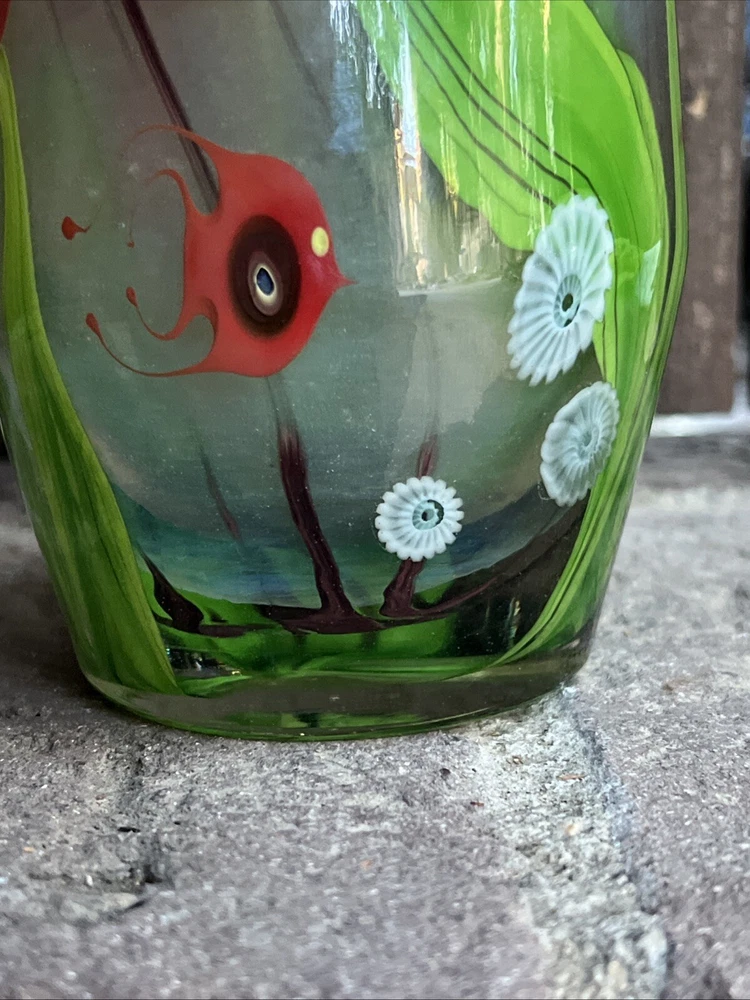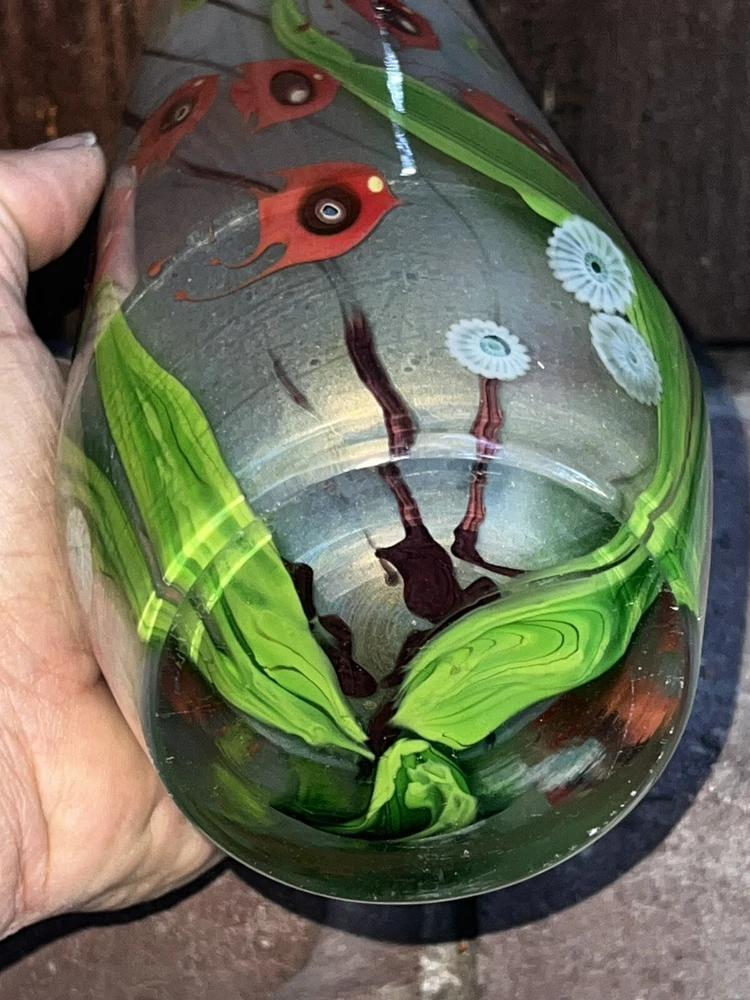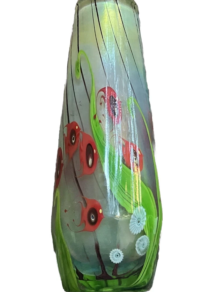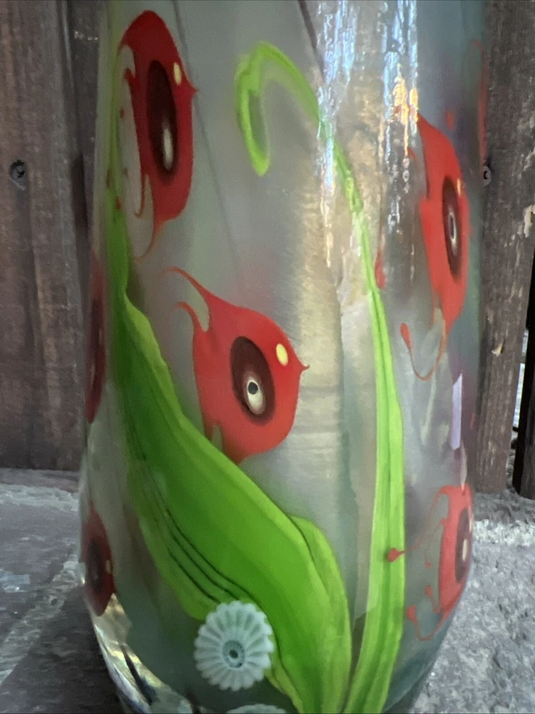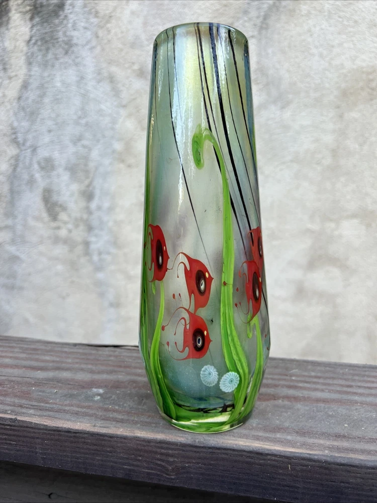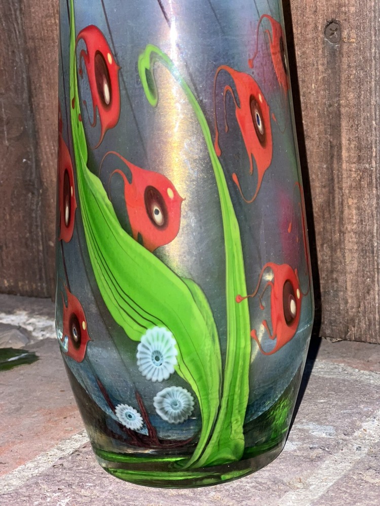 Amazing piece , heavy 6-7 lbs no issues found !This is a vintage Lundberg Studios hand-blown glass vase from 1977. It features double wall multicolor art design of an angel fish The 10-inch vase is signed Lundberg Studios 1977 Made in California, USA, this original piece showcases intricate art glass production techniques, making it a unique and collectible item.