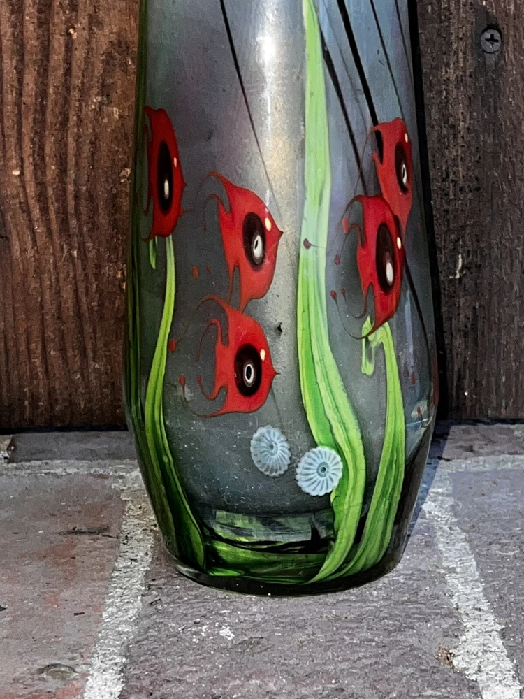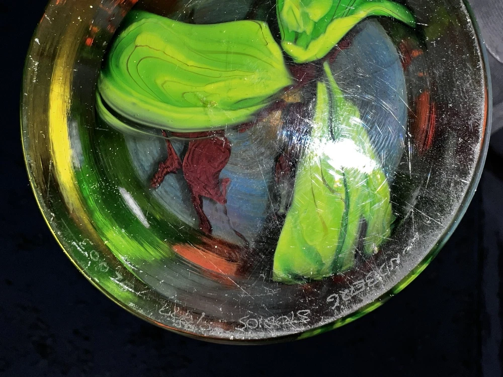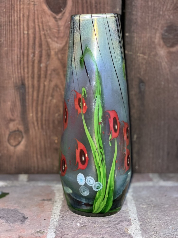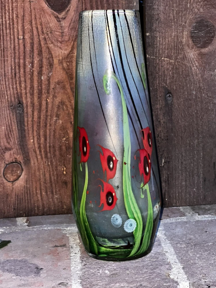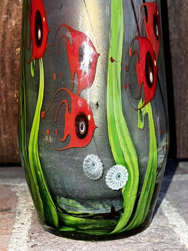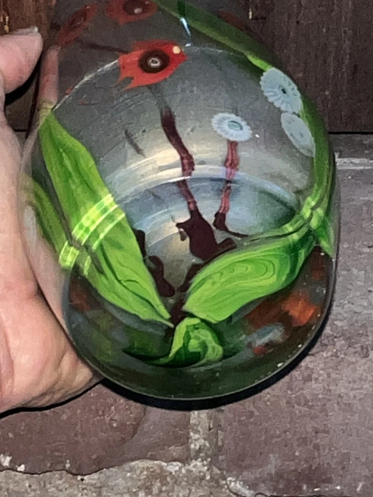 Amazing piece , heavy 6-7 lbs no issues found !This is a vintage Lundberg Studios hand-blown glass vase from 1977. It features double wall multicolor art design of an angel fish The 10-inch vase is signed Lundberg Studios 1977 Made in California, USA, this original piece showcases intricate art glass production techniques, making it a unique and collectible item.