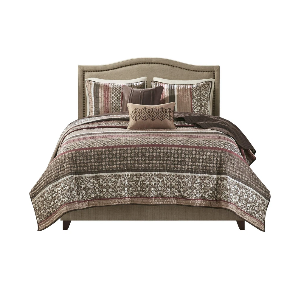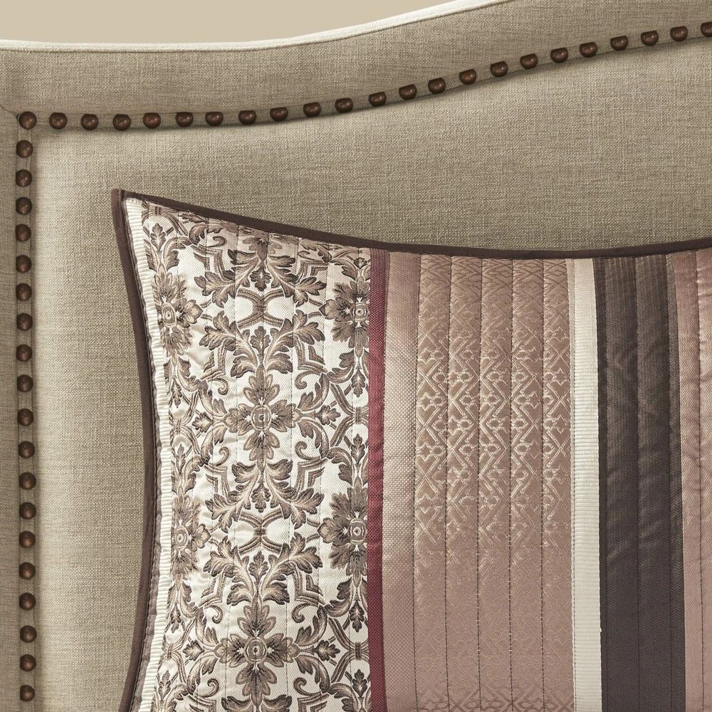To add a touch of richness to your current décor, the Princeton 5 Piece Reversible Jacquard Coverlet Set can update your room in seconds. Jacquard design, the coverlet and shams share leaf, striping and medallion motifs that are accentuated by channel stitching. Naturally LIGHTWEIGHT & BREATHABLE Bedding PERFECT FOR SUMMER use or layer it on for cold weather. Set includes: 1 Coverlet: 90"W x 90"L, 2 Pillows: 18"W x 18"L/12"W x 18"L, 2 Standard Shams: 20"W x 26"L + 2"D Care instructions: machine washable
