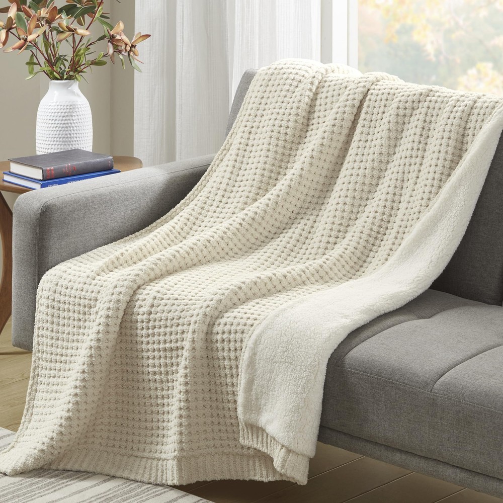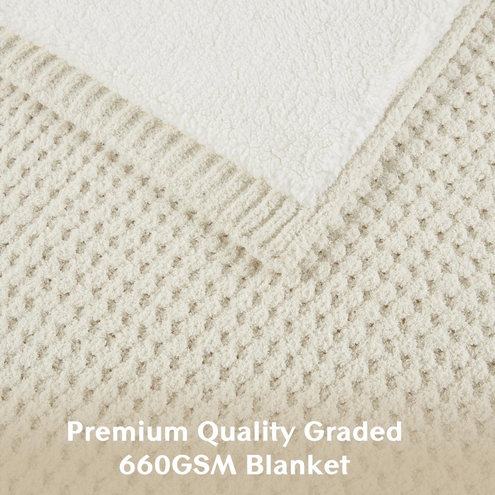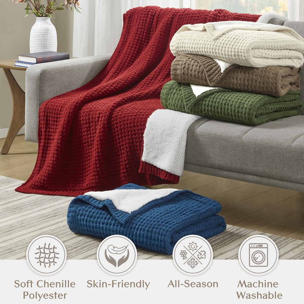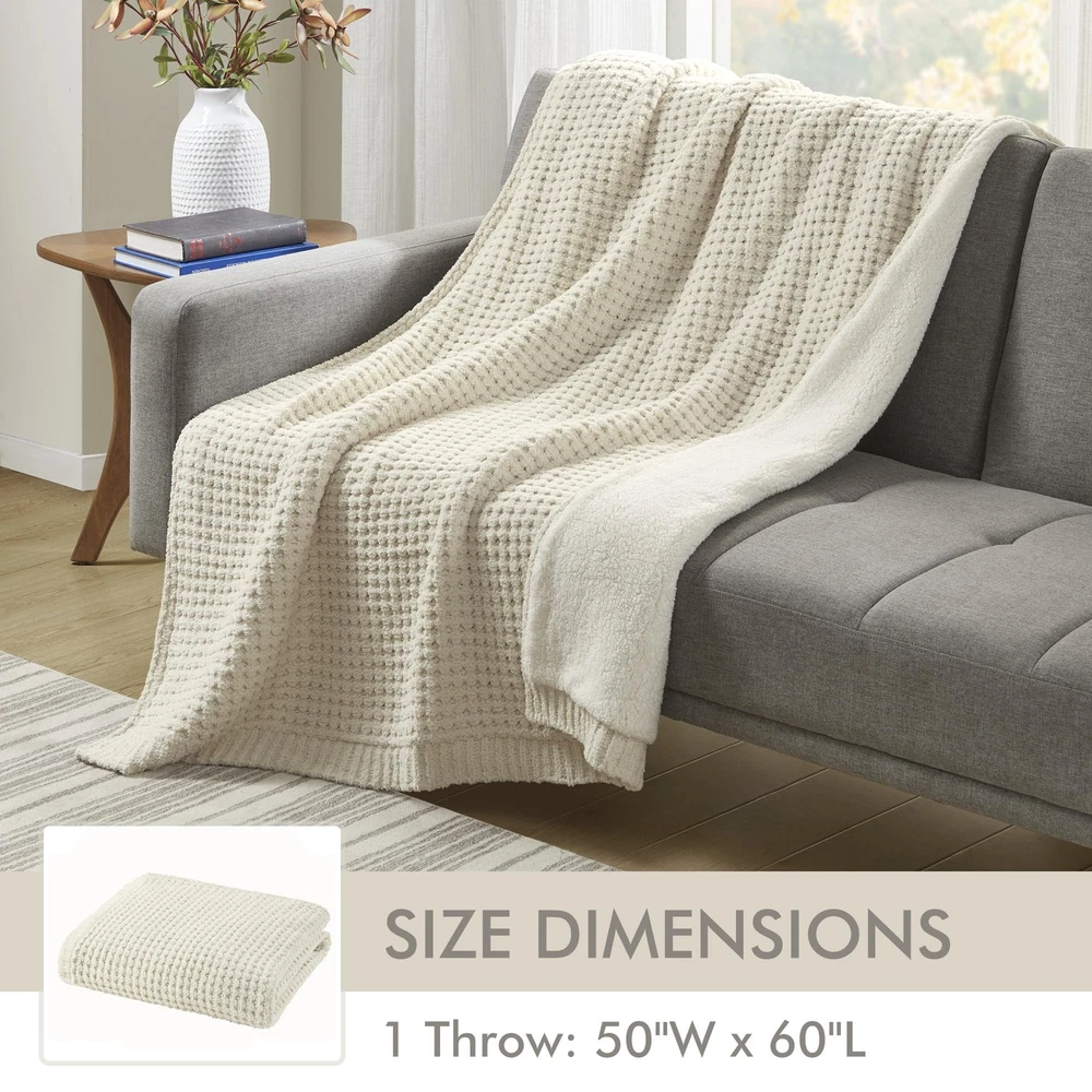 Luxurious Chenille Waffle Weave Blanket - Immerse yourself in the sumptuous softness of chenille throw as you snuggle up in its cozy waffle weave texture. Embrace a cozier lifestyle with our exquisite premium grade 660gsm waffle blanket Introducing our Reversible 2-in-1 Blanket - a revolutionary blend of cozy comfort and plush warmth. Combining the breathable, soft chenille texture of a waffle weave design with the irresistibly snug embrace of sherpa softness for your ultimate comfort Experience the ultimate comfort with our all-season, skin-friendly chenille polyester. Whether you're snuggled up for a movie night or seeking comfort at office, our breathable waffle weave & soft sherpa throw ensures you're pampered in warmth and luxury Set: 1 Throw: 50"W x 60"L. Compact and well-packaged, our blanket is the perfect gift idea for any occasion – birthdays, Valentine's Day, Mother's Day, or Christmas – celebrate yourself or that special someone with everlasting warmth and affection DURABLE & EASY CARE: Our polly chenille throw blanket boasts quality stitching offers durability to withstand daily wear and tear. For easy care, simply machine wash separately in cold water on a gentle cycle and tumble dry on low heat