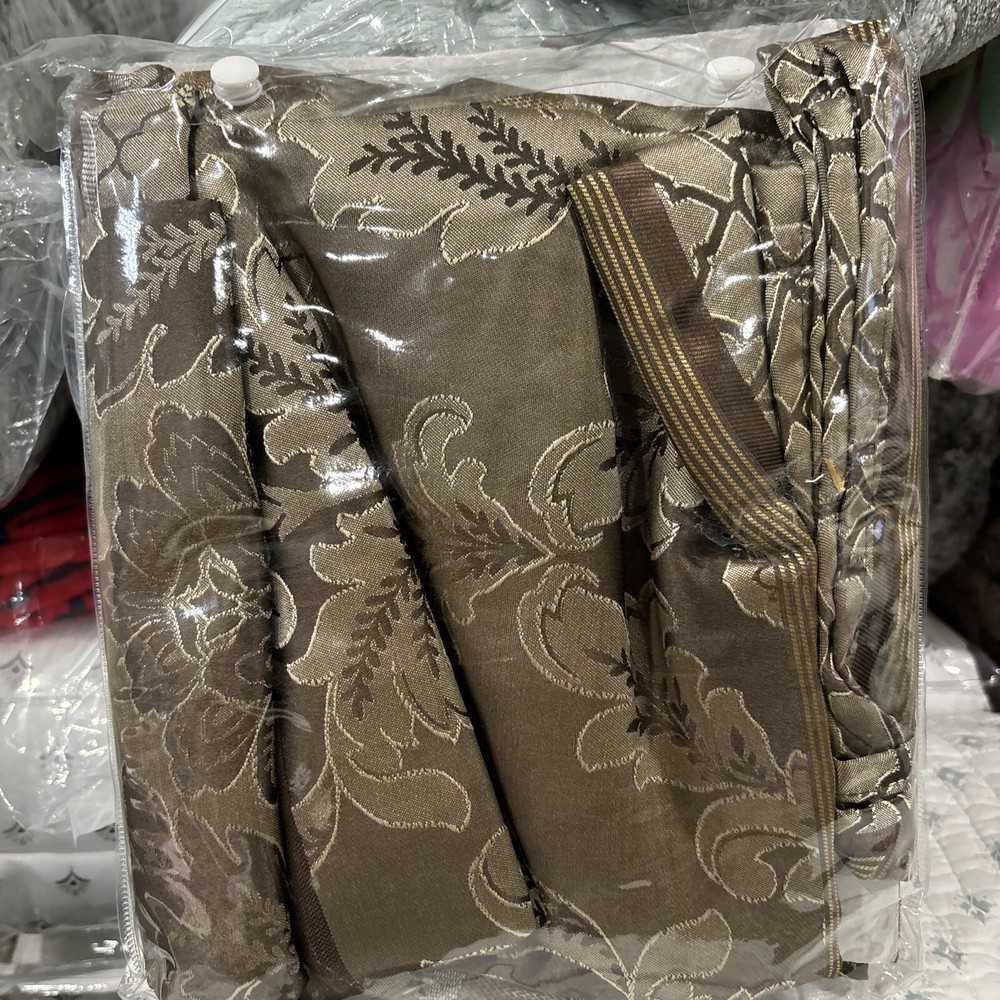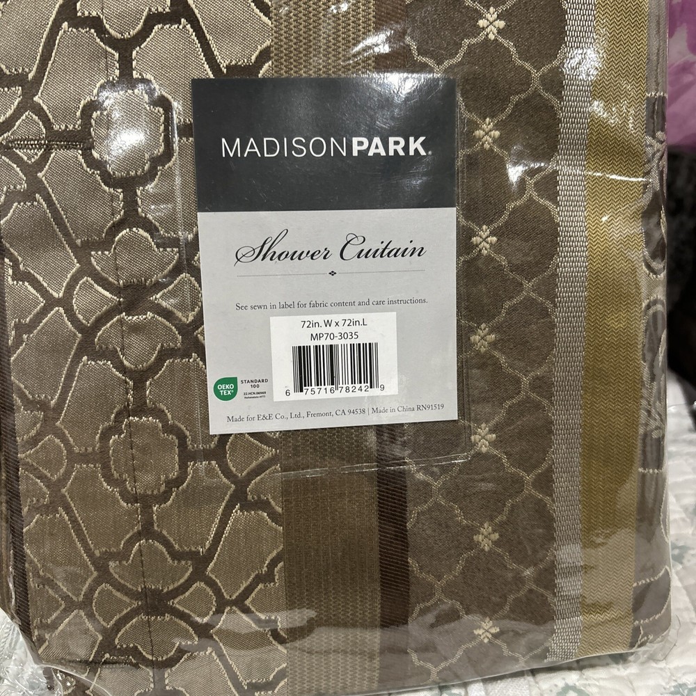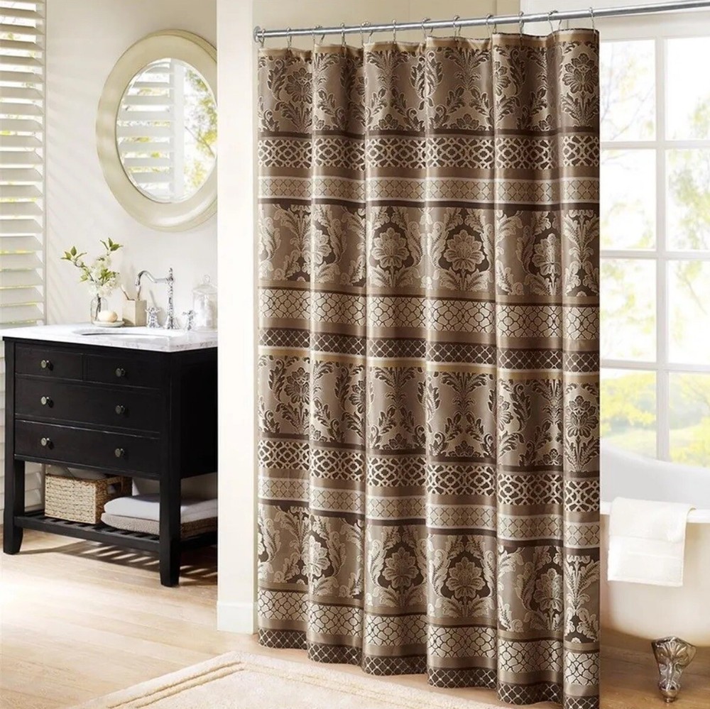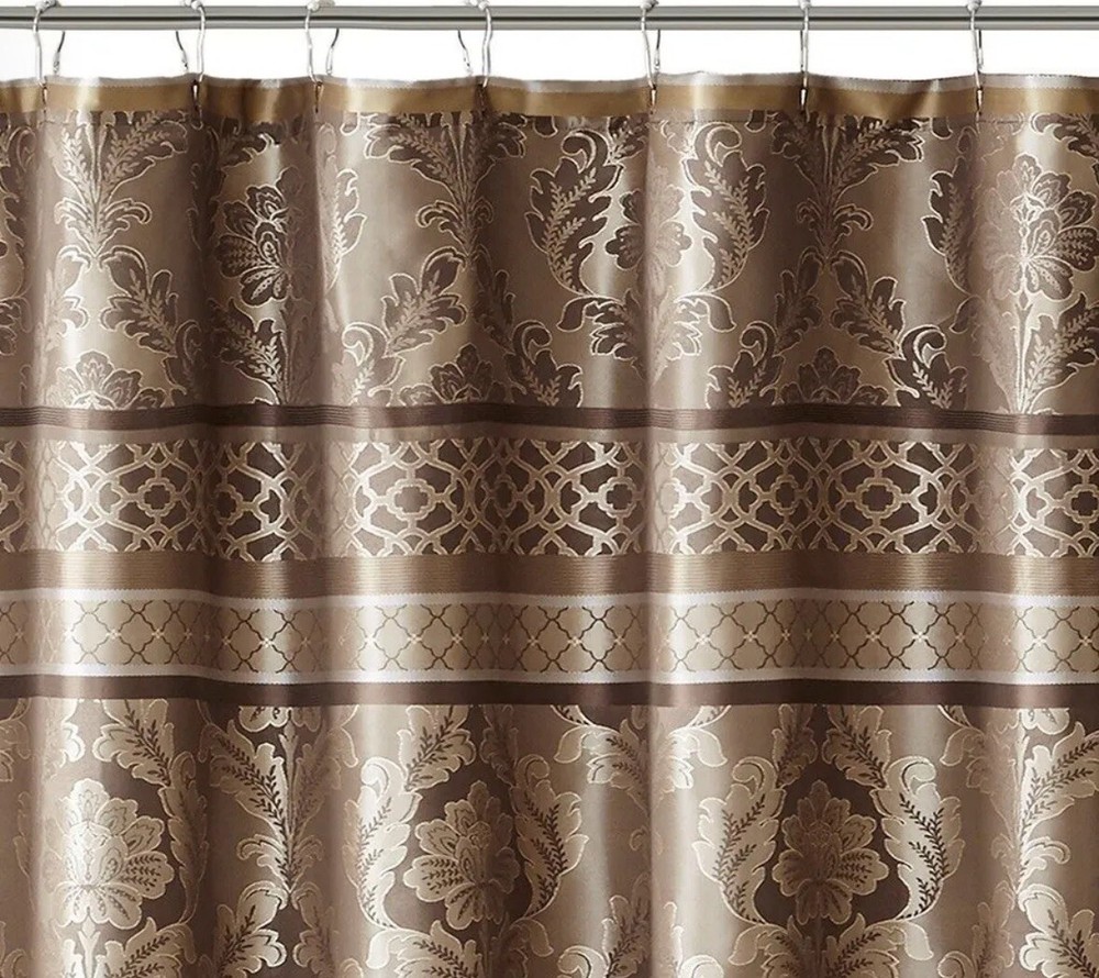 This is a luxury fabric shower curtain from Madison PARK. The curtain features a mocha brown leaf and ironwork motif design, and measures 72" x 72". It is suitable for use in bathrooms and specificall...