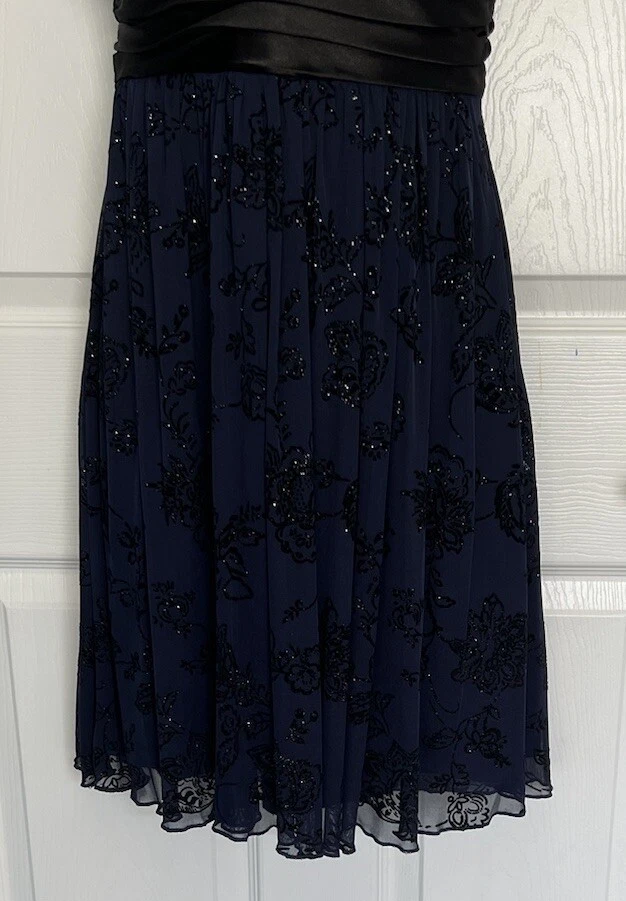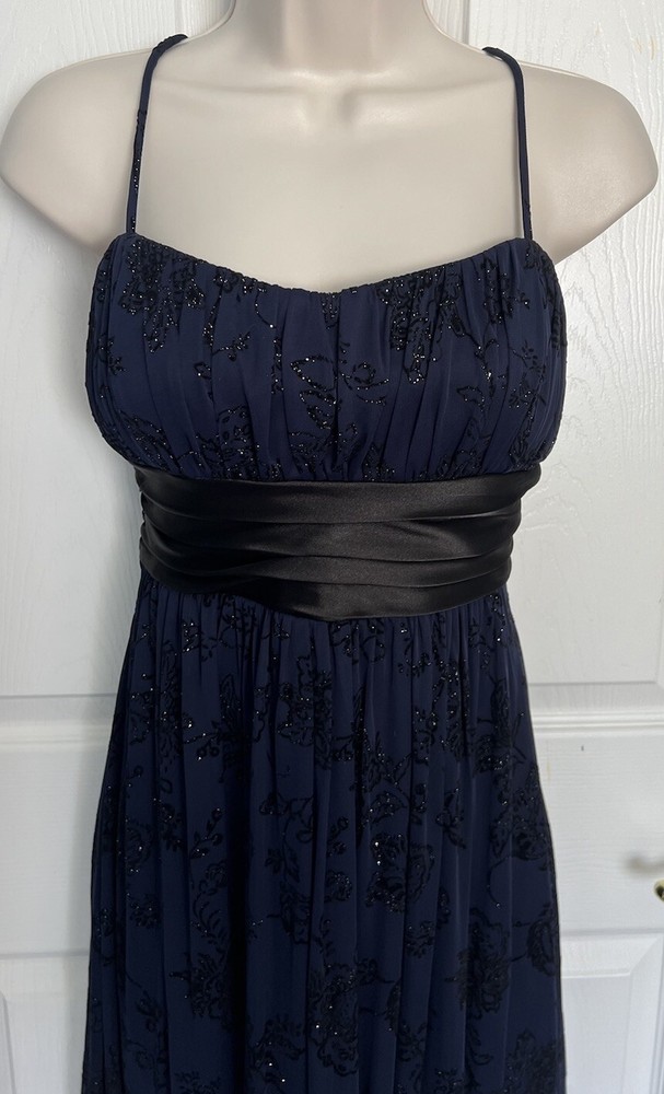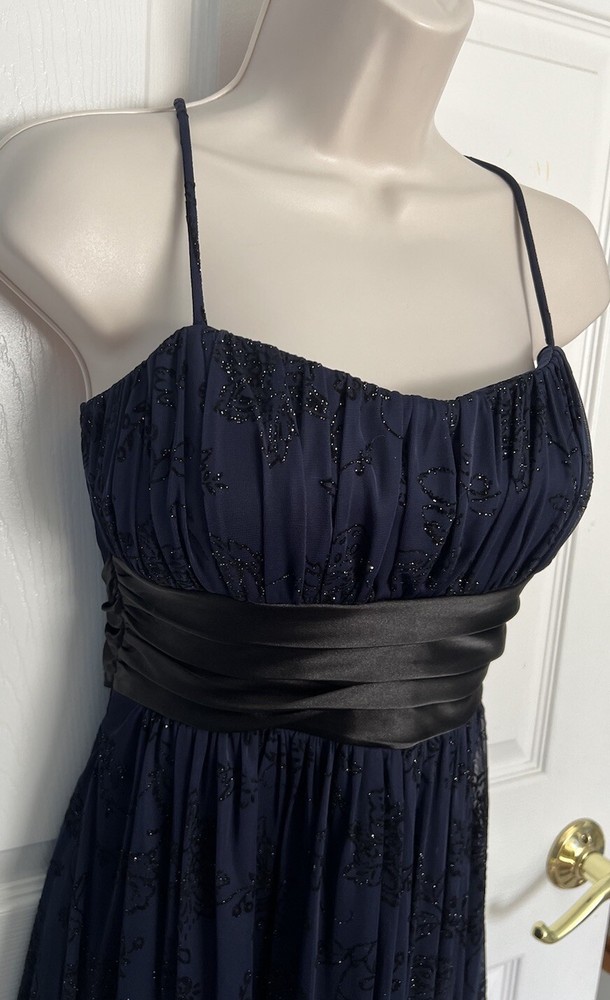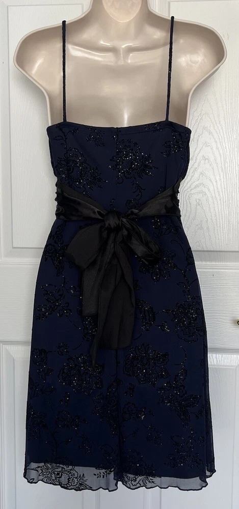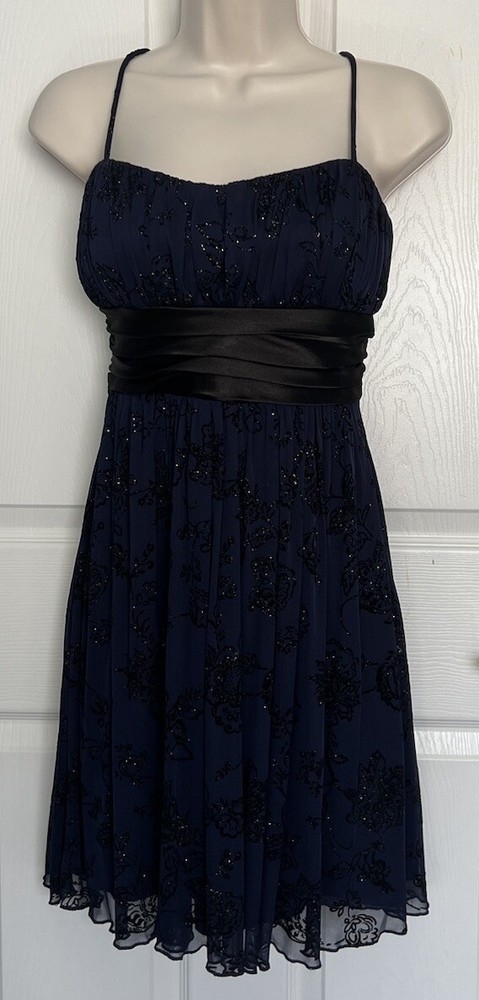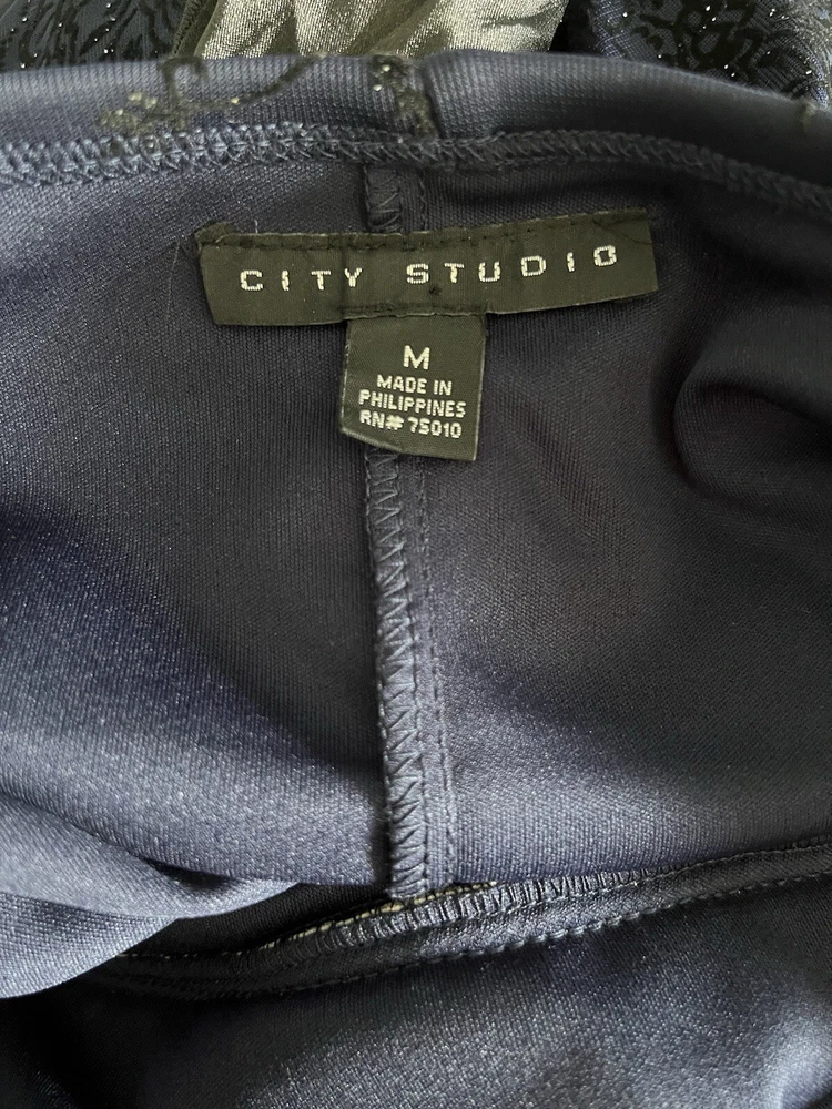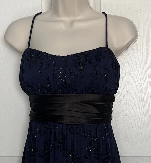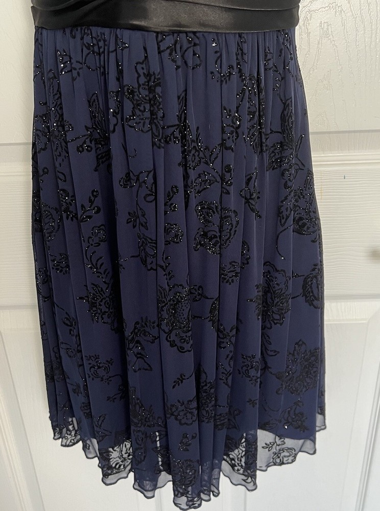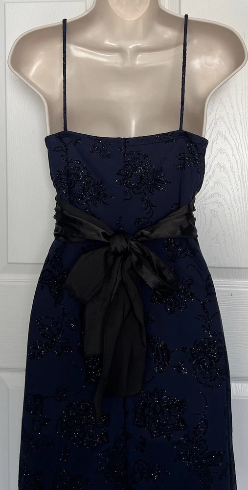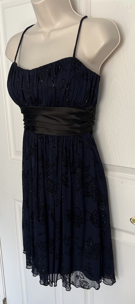 This elegant medium dress from CITY STUDIO is perfect for any formal occasion. The navy blue and black color combination adds a touch of sophistication, while the sweetheart neckline and sleeveless design create a flattering silhouette. The dress features a zipper closure and a fit & flare style, with a midi length and chiffon fabric type. The dress is accented with a sheath bust and rear bow, making it a unique and stylish choice. It is available in size M and is suitable for weddings, parties, and cocktail events. The dress is made of polyester material and has a vintage-inspired look. Get ready to turn heads and feel confident in this stunning formal dress. Beautiful condition, check out the photos.