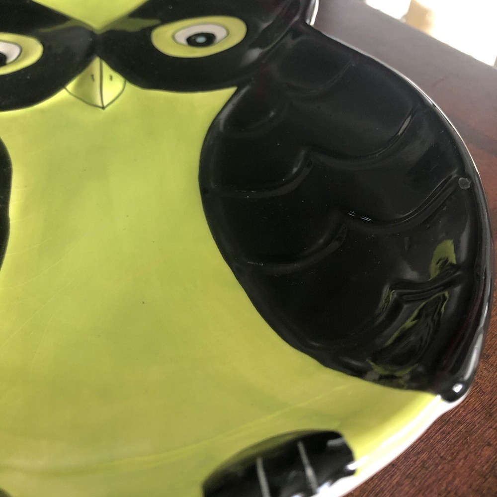 M Studios 8” Black Green Owl Shaped Raised Textured Plate. Very good condition except for time paint chip on top tip see picture Embossed raised features eyes been wings 8” x 6”