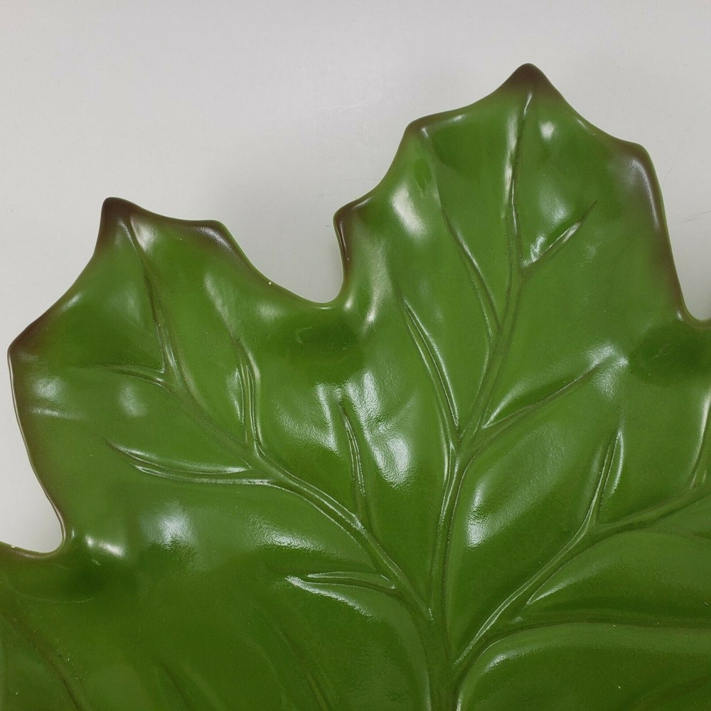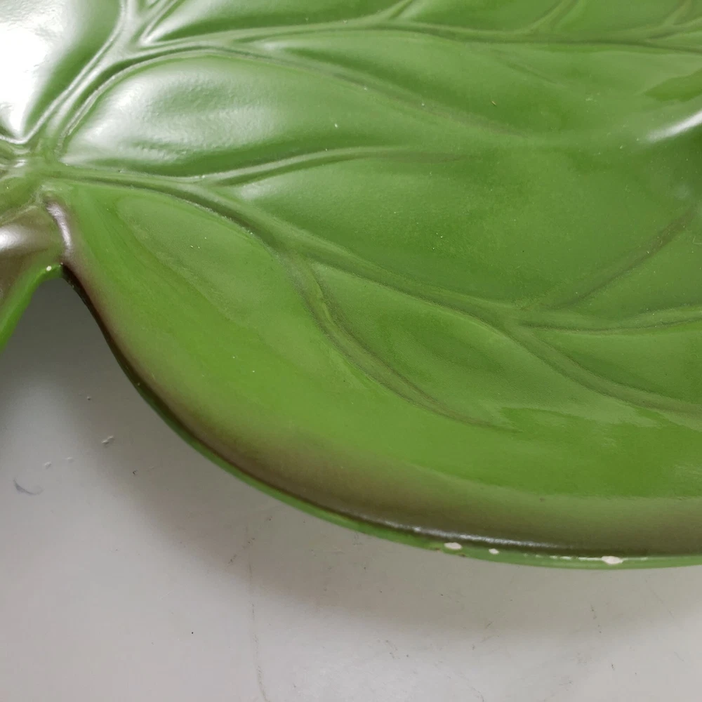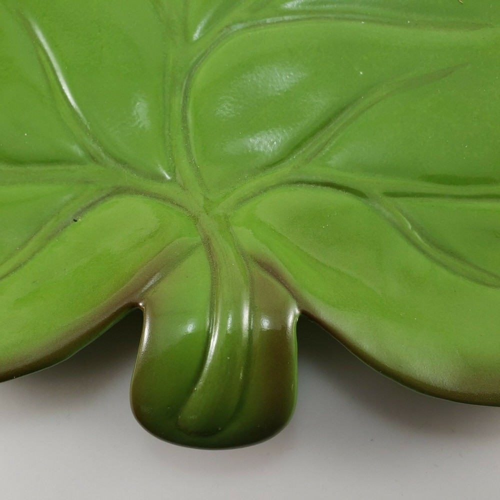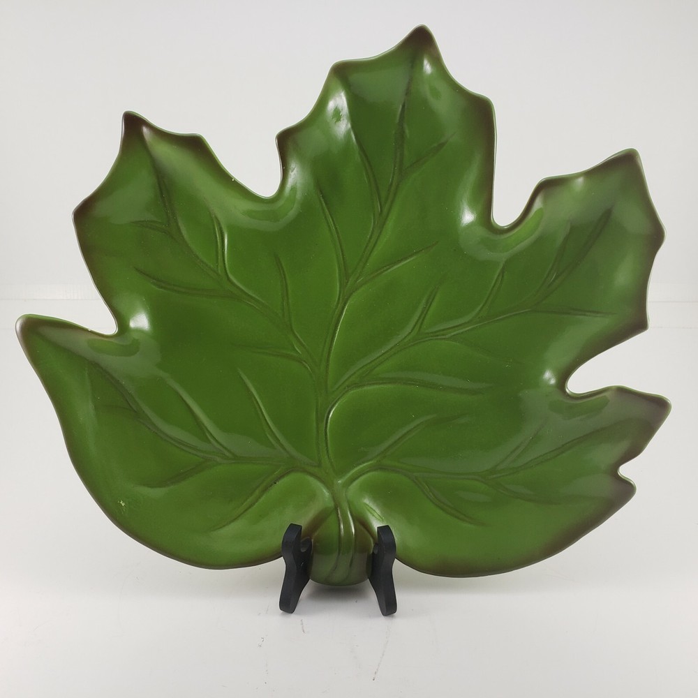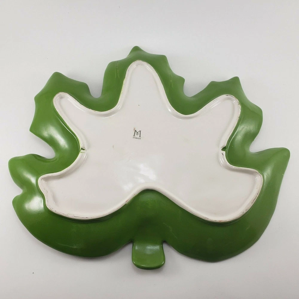 M Studios Serving Platter Rare Large Leaf Shaped Green with Brown Accents 16" Very Good Condition 3 small chips/fleabites near the stem 2 additional fleabites on a left side edge Beautiful green glaze with brown edge accents Molded in stem lines finish the image The back is stamped with the "M Studios" insignia Artist or age not known Measures 16" (41 cm) wide x 14" (35 cm) stem to tip x about 1½" (3.8 cm) high Shipping weight is 4 pounds