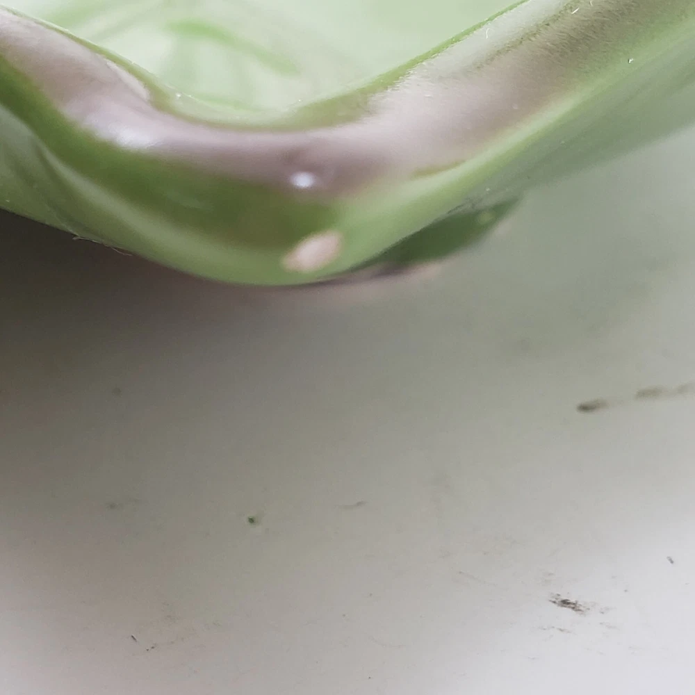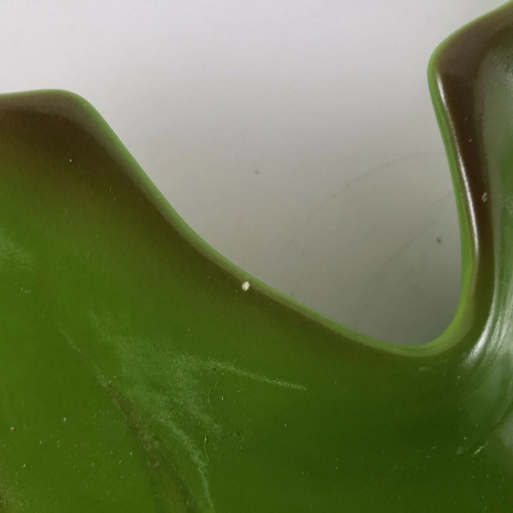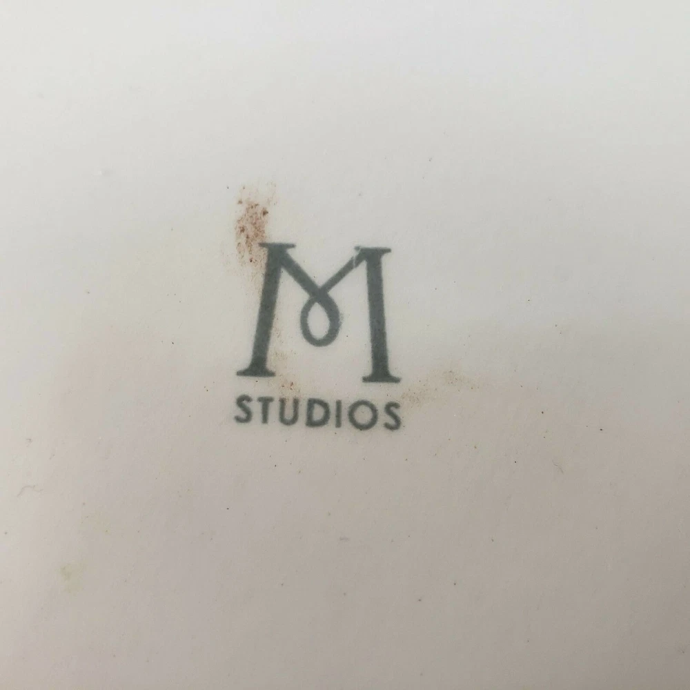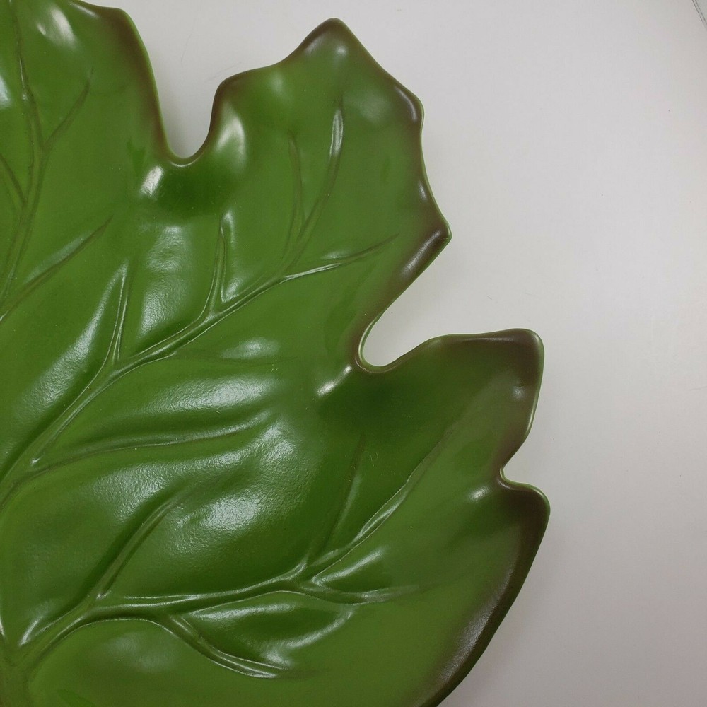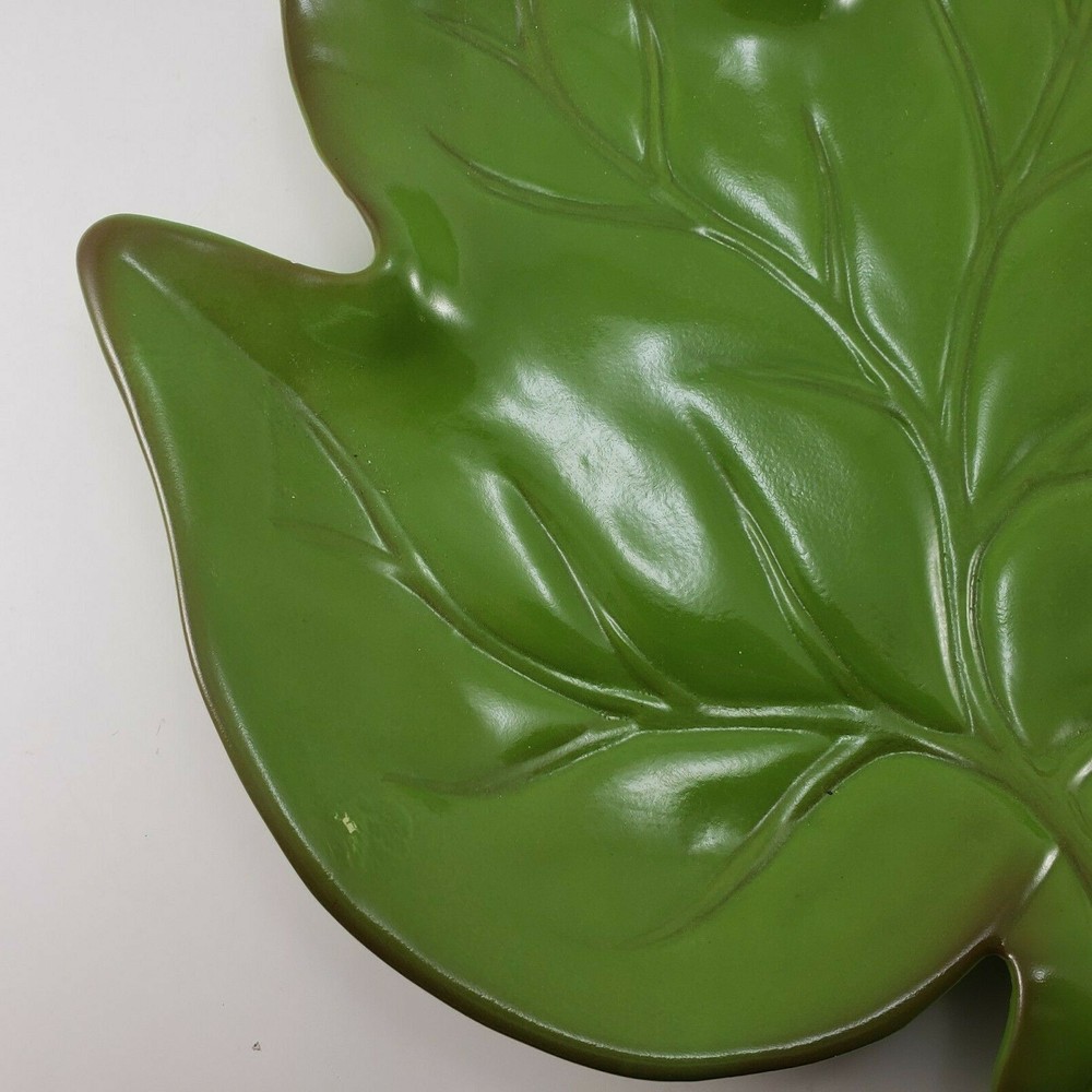 M Studios Serving Platter Rare Large Leaf Shaped Green with Brown Accents 16" Very Good Condition 3 small chips/fleabites near the stem 2 additional fleabites on a left side edge Beautiful green glaze with brown edge accents Molded in stem lines finish the image The back is stamped with the "M Studios" insignia Artist or age not known Measures 16" (41 cm) wide x 14" (35 cm) stem to tip x about 1½" (3.8 cm) high Shipping weight is 4 pounds