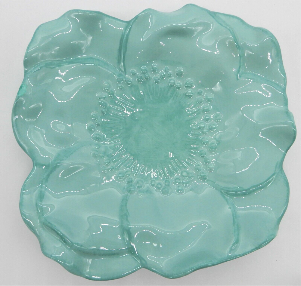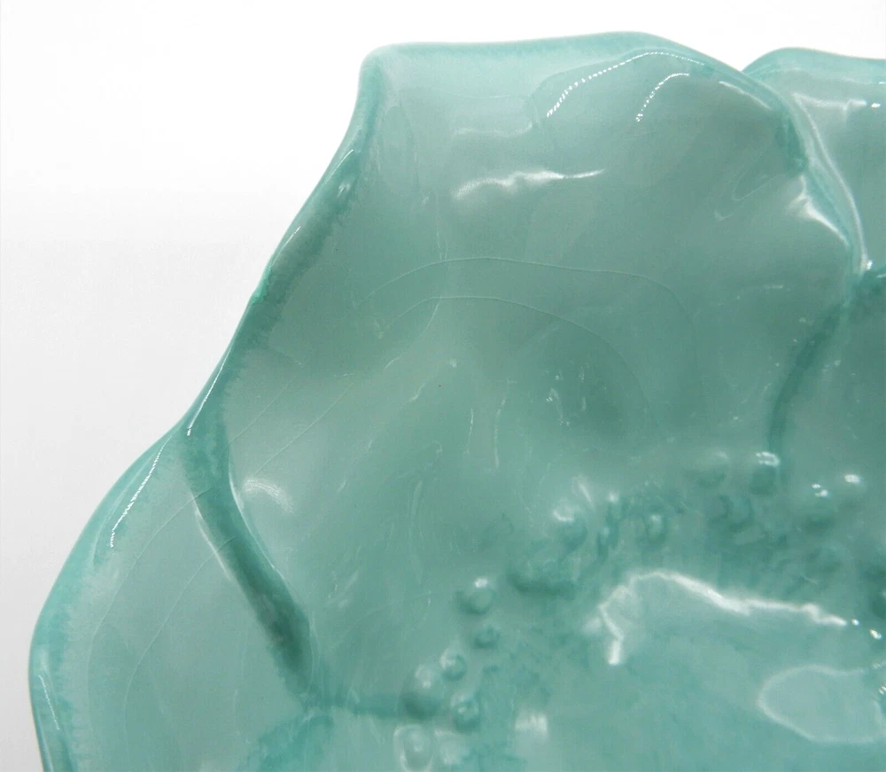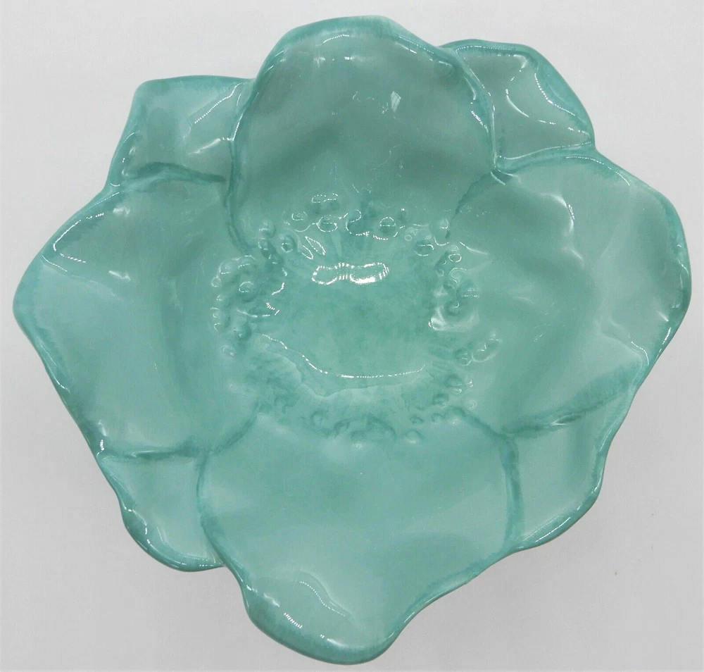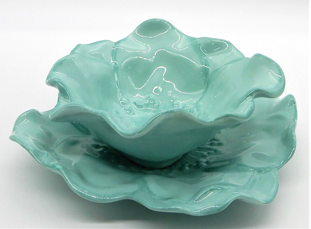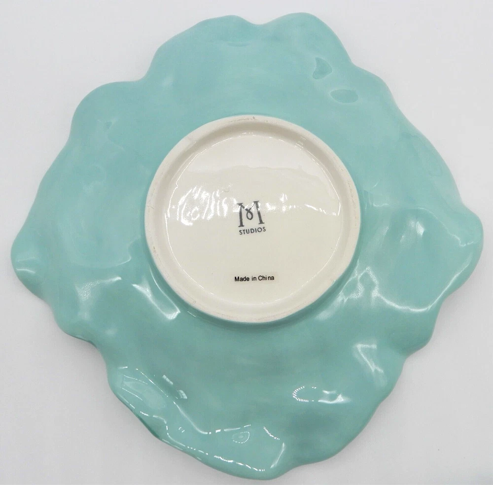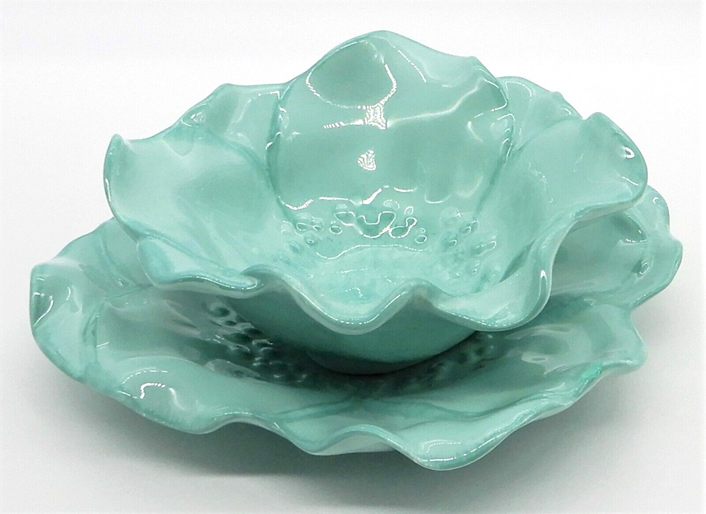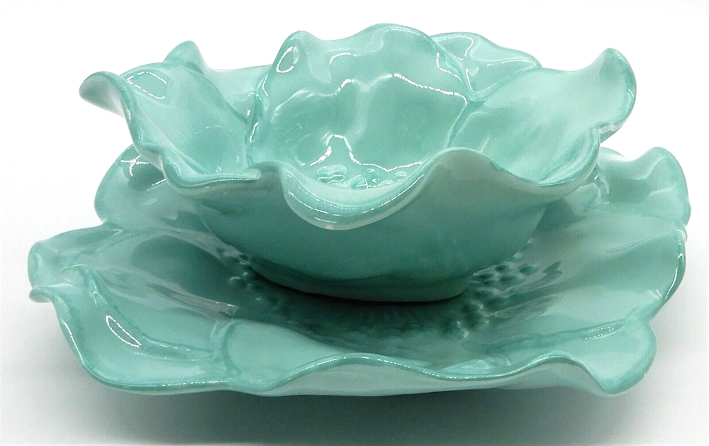 This M Studios teal flower shaped set includes a porcelain plate & bowl. The plate is 9" square. The bowl is 3" tall, and approximately 7" in diameter. There is a small chip to the glaze on the bowl and there is a chip on the edge of the plate. Both the bowl and plate have crazing in the glaze.