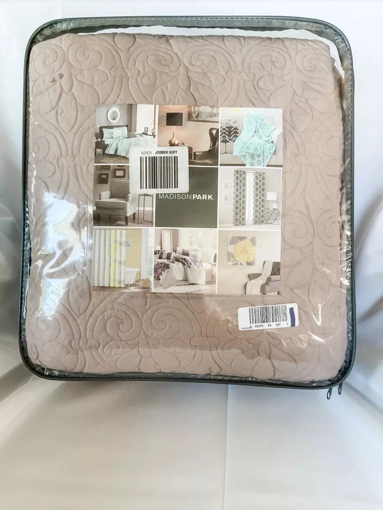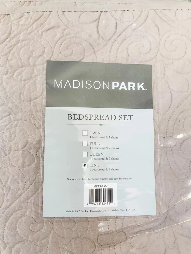 MADISON PARK 3 PIECES REVERSIBLE KING BEDSPREAD SET COLOR BEIGE NIP BRAND-MADISON PARK COLOR-BEIGE SIZE-KING INCLUDES 1 BEDSPREAD (120"W x 118"L), 2 KING SHAMS (20"W x 36"L) NEW IN PACKAGE