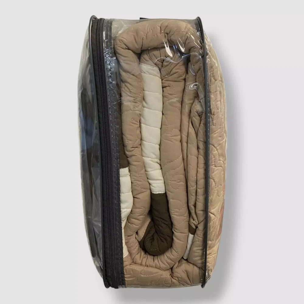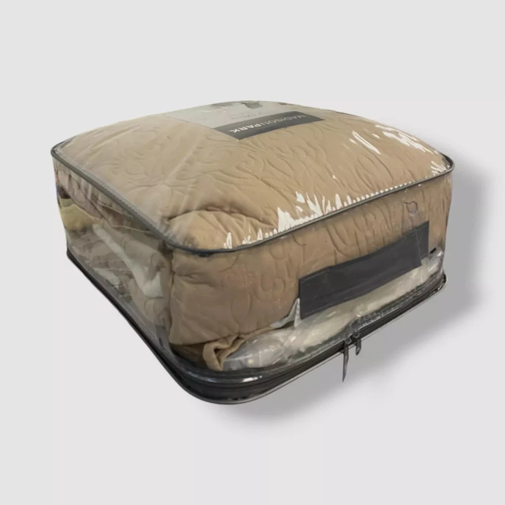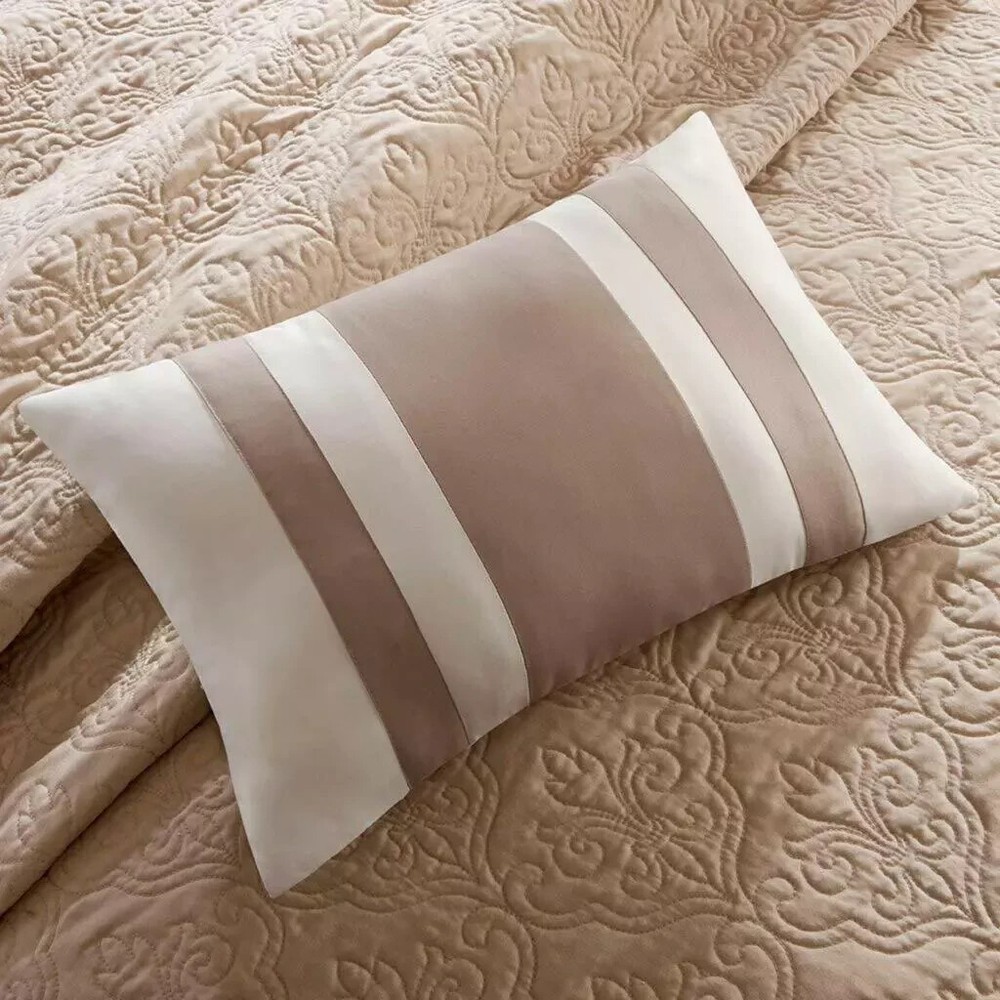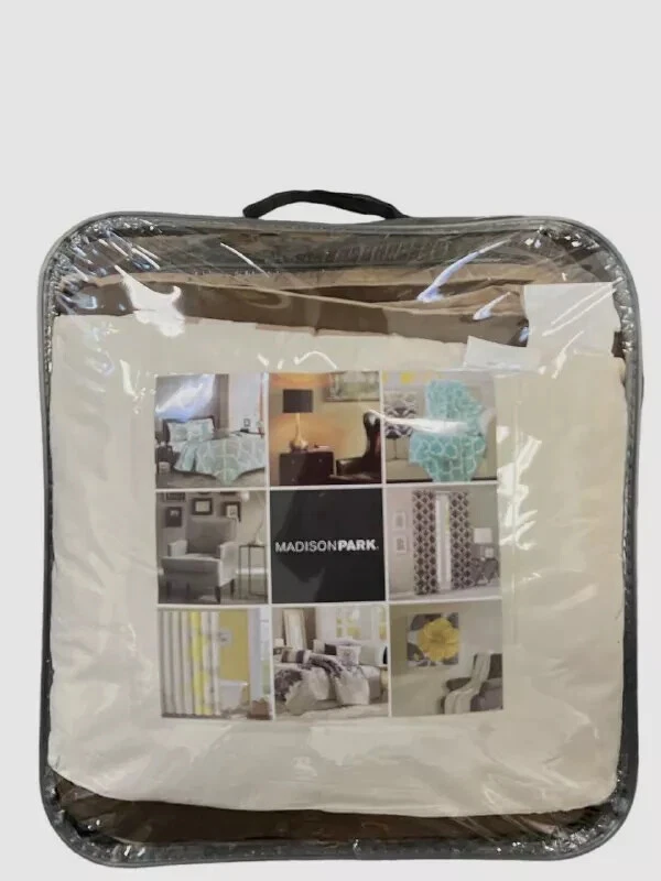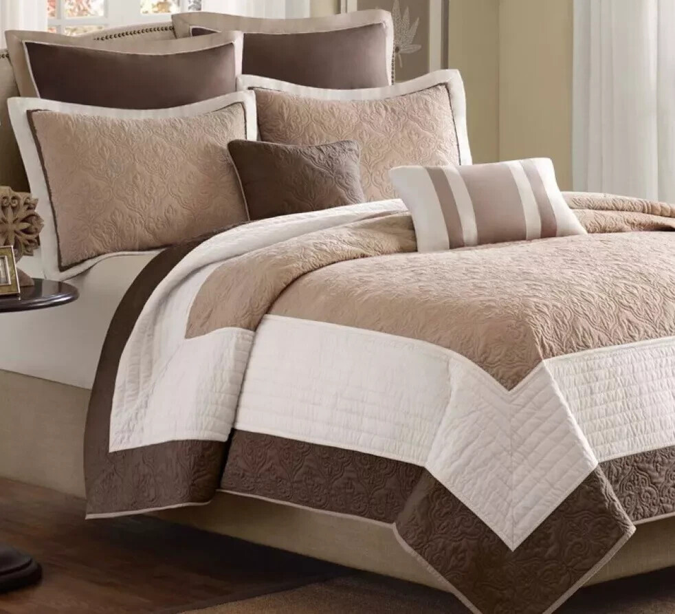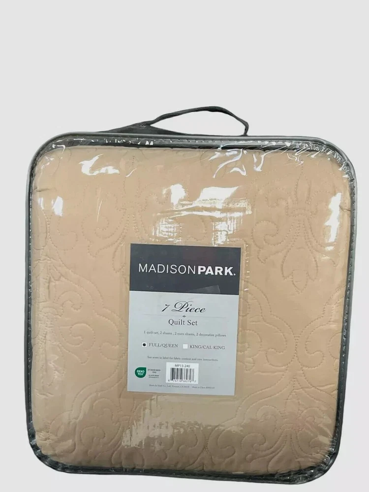 MADISON PARK ATTINGHAM 7 PCS FULL/QUEEN COVERLET SET COLOR BEIGE NEW BRAND-MADIOSN PARK COLOR-BROWN BEIGE SIZE-FULL/QUEEN NEW What's in the Set: Full/Queen Coverlet + 2 Standard Shams + 2 Euro Shams + 2 Accent Pillows Full/Queen Dimensions Coverlet: Full/Queen 90 x 90 inches Shams (two): Standard 20 x 26 inches Euro Shams (two): 26 x 26 inches Accent Pillows (two): 16 x 16 inches & 12 x 18 inches