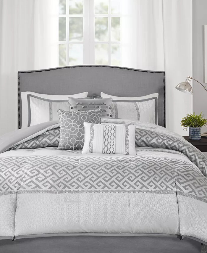 Styled with a blocked ground featuring a classic Greek key pattern and geometric accents in chic shimmering tones, this Addison comforter set from Madison Park is the perfect choice for updating your bedroom's decor. Set includes: queen comforter (90" x 90"), queen bedskirt (60" x 80" + 15"), two standard shams (20" x 26" + 1") and three decorative pillows (16" x 16", 18" x 18", 12" x 18") Comforter and shams: polyester; Bedskirt drop: polyoni; polyester platform; Decorative pillows: polyester; polyester fill; Comforter fill: polyester 270 grams per square meter Machine washable. Spot clean pillows.