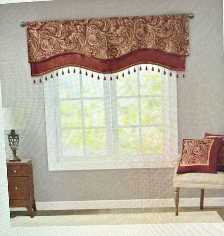 This is a Madison Park Aubrey beaded window valance in burgundy with a paisley pattern. It measures 50 inches in width and 18 inches in length, designed for light filtering. The valance is wall-mounted and features a modern style, suitable for any room indoors. It is made of jacquard material and comes in a new, unused condition.