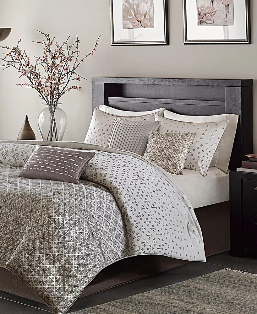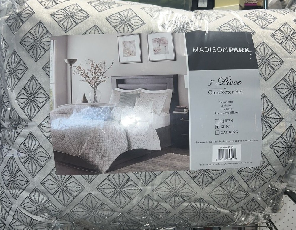 Upgrade any space with the upscale look and feel of this Biloxi comforter set from Madison Park, featuring a polished geometric jacquard and three accent pillows for and added touch of texture and stylish depth. Set includes: king comforter (104" x 92"), king bedskirt (78" x 80" + 15"), two king shams (20" x 36") and three decorative pillows (12" x 18", 16" x 16", 18" x 18") Fabric and fill: polyester Geometric jacquard; reverses to solid brushed ground Polyester Machine washable Imported This is a new Item that has been placed in a compression bag - No Original bag as it was broken.