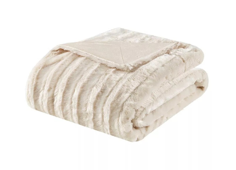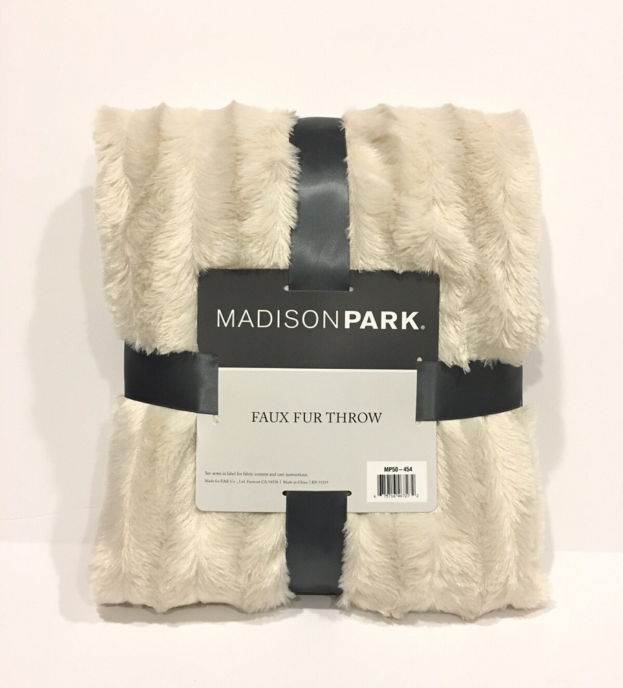 MADISON PARK DUKE BRUSHED LONG FAUX FUR THROW BLANKET -CHAMPAGNE IVORY -NEW WITH TAGS DETAILS : In irresistibly soft faux fur featuring a reversible design with chunky ribbing at the face and a solid reverse, this Duke throw from Madison Park is an ideal choice for adding a luxurious look and cozy feel to any room's decor. Dimensions: 50" x 60" This ultra-soft plush throw helps provide exceptional warmth and comfort, while a micro-fur reverse adds extra softness to the design. Body: polyester; Spot clean only. Imported #34