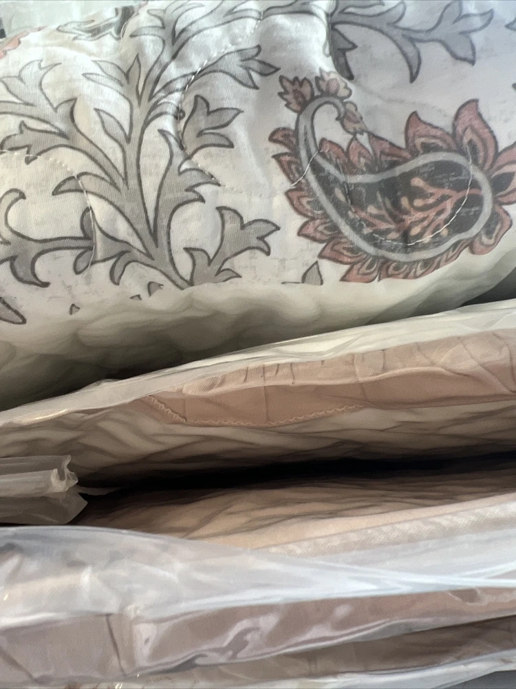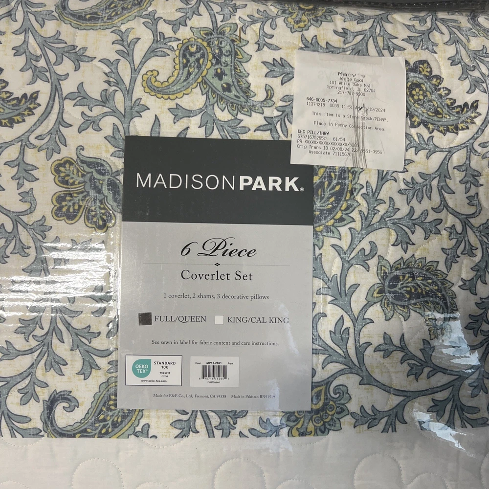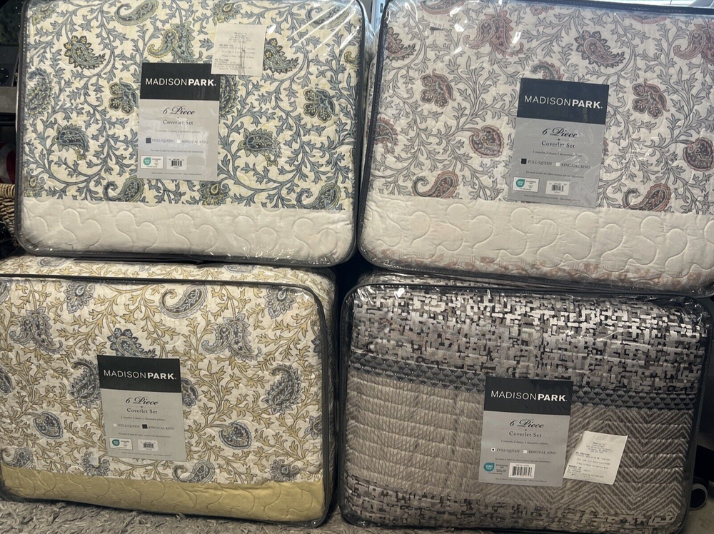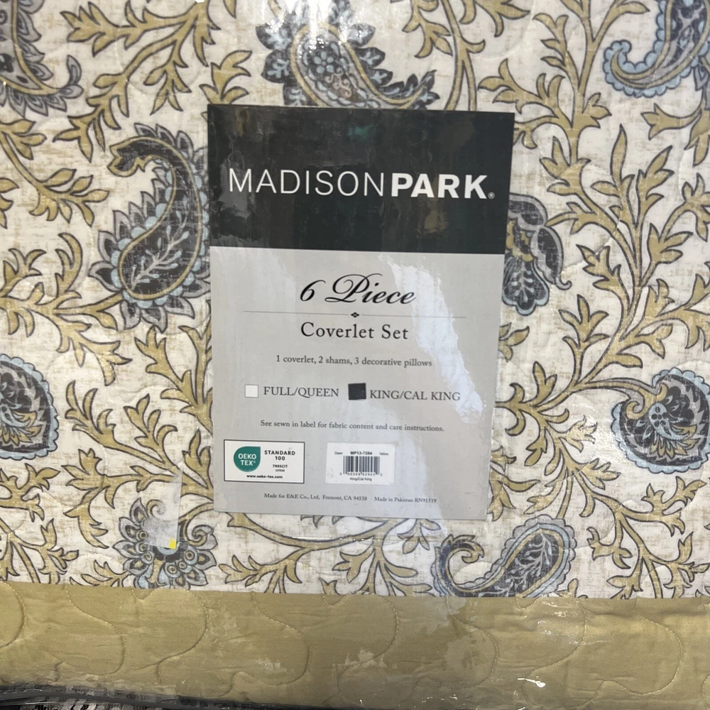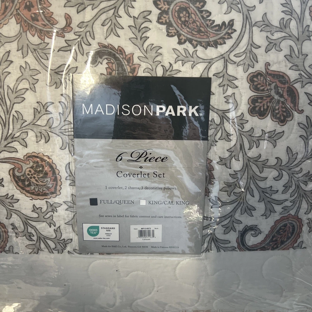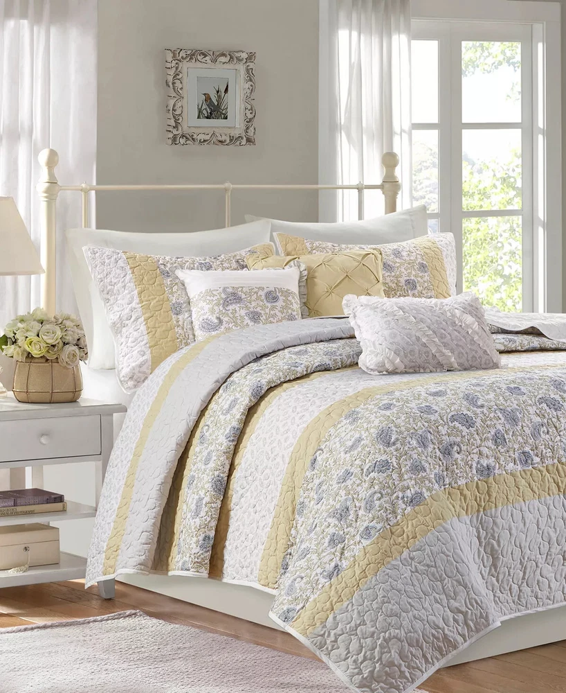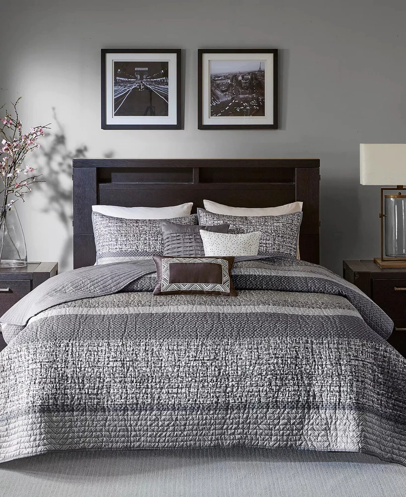 Create a cozy setting with the contemporary charm of this Dawn coverlet set from Madison Park, featuring a quilt and shams with soft quilting, beautiful floral prints and refreshing color blocking and three coordinating decorative pillows for an additional touch of style and comfort. Set includes: full/queen quilt (90" x 90"), two standard shams (20" x 26") and three decorative pillows (16" x 16", 18" x 18", 12" x 18") king/California king quilt (104" x 94"), two king shams (20" x 36") and three decorative pillows (16" x 16", 18" x 18", 12" x 18") Cotton, polyester Machine washable. Spot clean pillows. Imported OEKO TEX STANDARD Rhapsody Jacquard 6 Pc Coverlet, Full/Queen: Grey, Full/Queen: Add textured style to your room with the Rhapsody coverlet set from Madison Park, featuring jacquard stripes that reverse to brushed fabric on the coverlet and shams amidst varying tones of gray. Set includes: coverlet (90" x 90"), two standard shams (20" x 26") and three decorative pillows (18" x 18", 16" x 16", 12" x 18") Jacquard weave Reversible Colors: gray ground Coverlet/sham/pillow: polyester; coverlet fill: cotton/polyester/other 240 grams per square meter; pillow fill: polyester Machine washable. Spot clean pillows. Imported Please note: this item may be shipped in a compression bag-